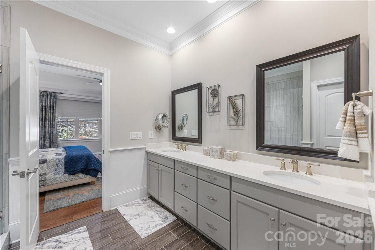 Welcome to effortless, upscale living in the gated townhome community of Waldron Grove. This thoughtfully designed 3-bedroom, 3.5-bath home offers a rare and highly desirable main-level primary suite, paired with an open, light-filled floor plan, ideal for both everyday living and entertaining. The chef’s kitchen is a true showstopper, featuring a 48†Thermador six-burner range, built-in Thermador refrigerator, Wolf microwave, ceiling-height cabinetry, and a massive island with abundant storage—perfect for gatherings or quiet mornings at home. The main-level primary suite provides privacy and convenience, while two additional en-suite bedrooms upstairs—each with its own walk-in, custom closet — offer exceptional comfort for guests or family. A spacious loft adds flexible living area ideal for a media space, office or retreat. Quality craftsmanship is evident throughout, from solid core doors and extensive wainscoting to generous storage solutions. You won't find one wire rack in this home. The meticulous two-car garage features an epoxy floor and additional storage space, with convenient additional parking located directly across the street—making entertaining easy and stress-free. Enjoy peaceful outdoor moments on your private patio, all while being minutes from premier shopping, dining, and everyday conveniences. Designed for those seeking a refined, low-maintenance lifestyle, this lock and leave home delivers comfort, quality and location.