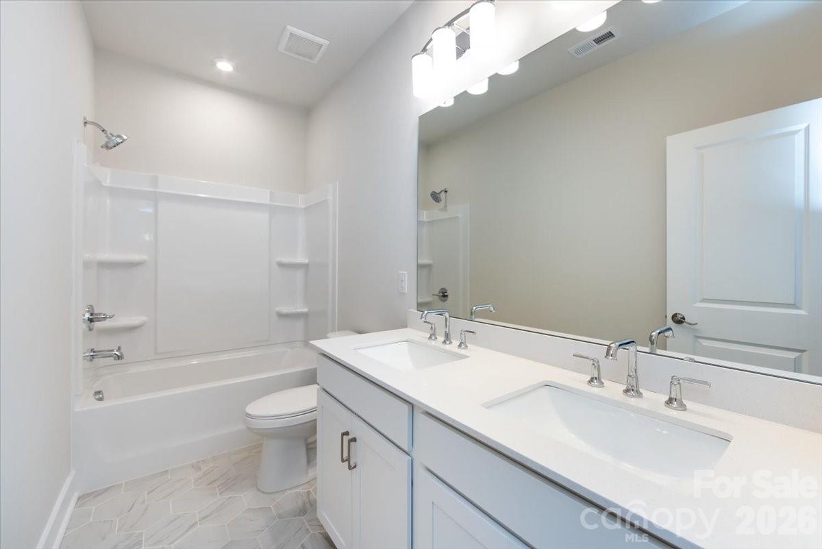 This home offers a bright, open-concept layout anchored by a stunning oak box staircase, creating a warm and inviting flow throughout. The white gourmet kitchen with quartz countertops, hood range, and expansive walk-in pantry makes everyday life and entertaining effortless, while a sliding glass door opens to a covered outdoor living space perfect for relaxing or gathering with friends. The primary bathroom feels like a private retreat, featuring a luxurious walk-in shower, charcoal black tile, and Nightfall quartz countertops for an elevated, modern touch. Steps from lakeside fun and with easy access to major commutes, this home pairs lake life living with convenience, enhanced by a community pavilion with green space, lounge areas, and grills.