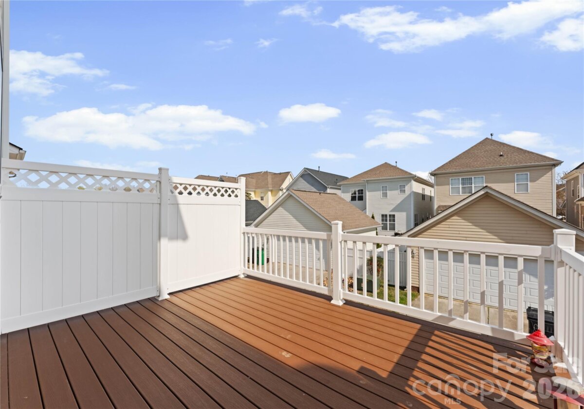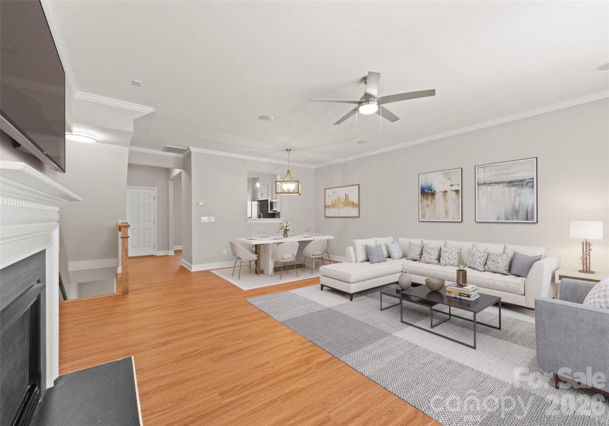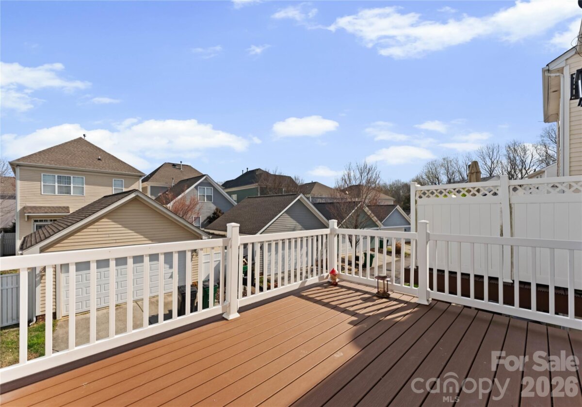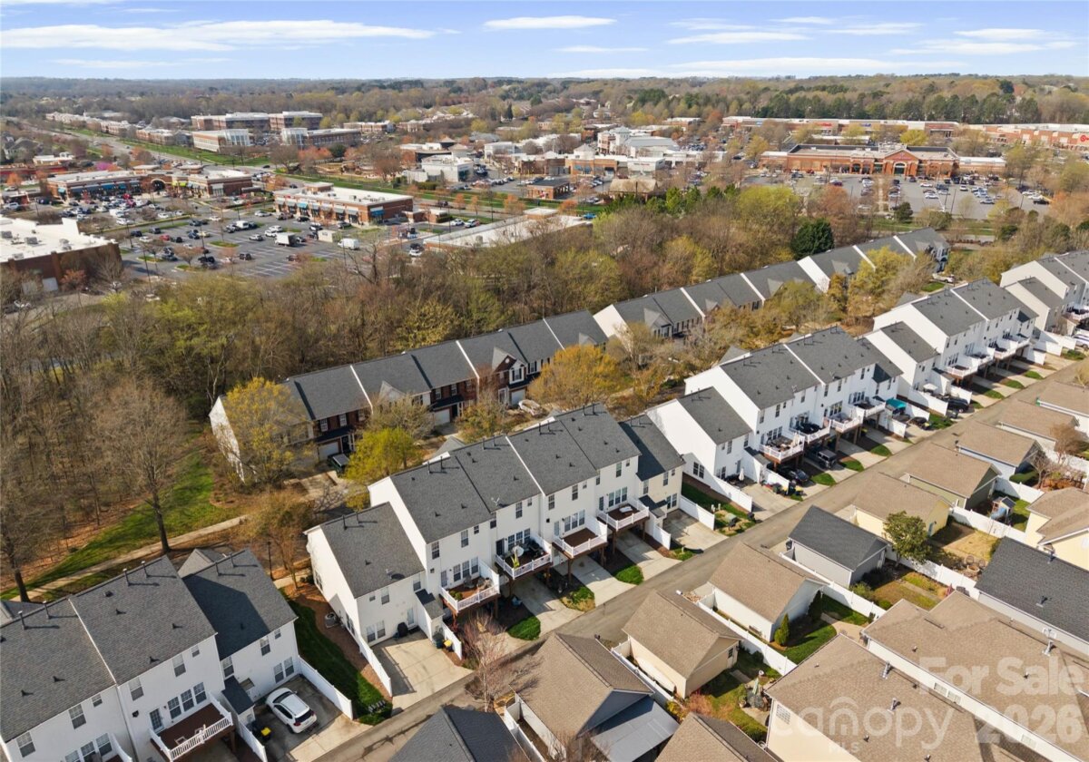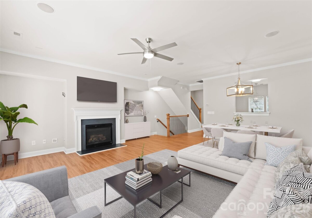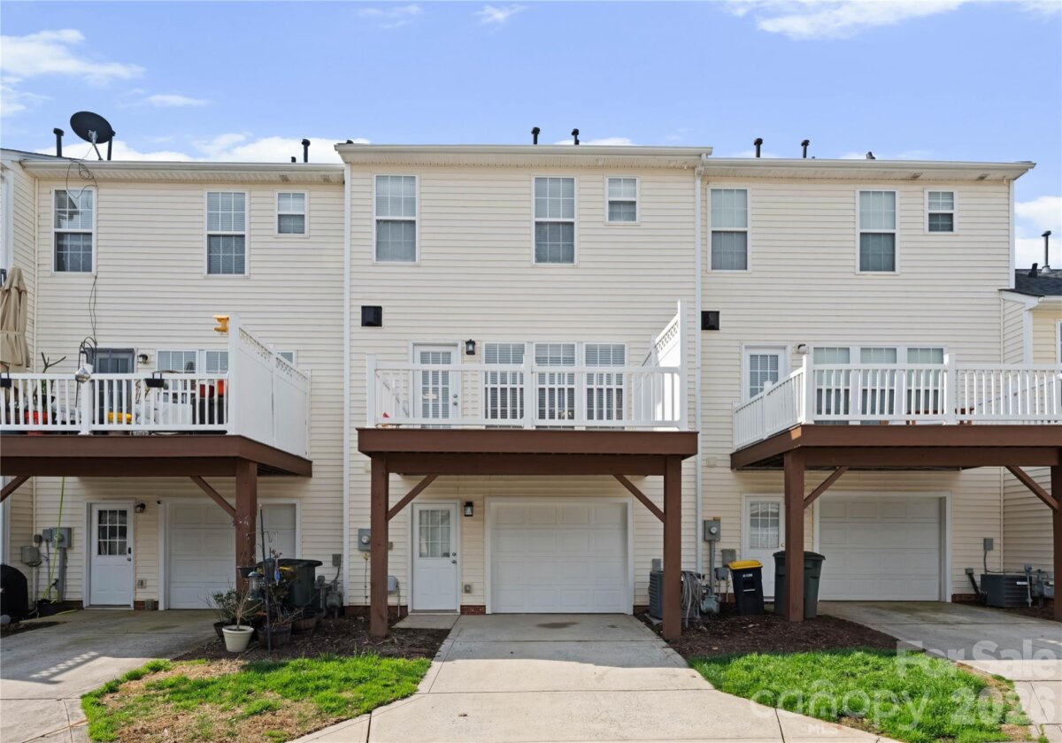 Welcome to this beautifully renovated 3-bedroom, 2-full, 2-half-bath townhome in the Blakeney Greens community. Modern finishes and thoughtful design include new wide-plank hardwood floors, fresh paint, new hardware, lighting, and fixtures throughout. Both staircases feature new wood treads with subtle under-tread lighting. An expansive open living and dining area with a kitchen pass-through is ideal for entertaining; in-ceiling surround sound is wired in the living area. The updated kitchen offers new cabinets, quartz countertops, a tiled backsplash, and new appliances. A large deck off the living room provides great space for dining and relaxing. The primary suite includes a tray ceiling, walk-in closet, and a spa-like en-suite with dual vanity, lighted mirrors, and a tiled, glass-enclosed walk-in shower. The secondary bedroom is upstairs with an updated bath featuring a new vanity, tub and surround, fixtures, and lighting. A versatile third bedroom/office with built-ins and glass doors on the ground floor adds flexible living space. Two updated half baths (one on the ground level and one on the main) provide added convenience. Practical upgrades include a finished oversized one-car garage with epoxy floors and a rear driveway with room for an additional vehicle. The neighborhood offers walking trails, a pool, greenway access, common spaces, and easy walking access to shops and restaurants. Near top-rated schools. Move-in ready — schedule your showing today.
