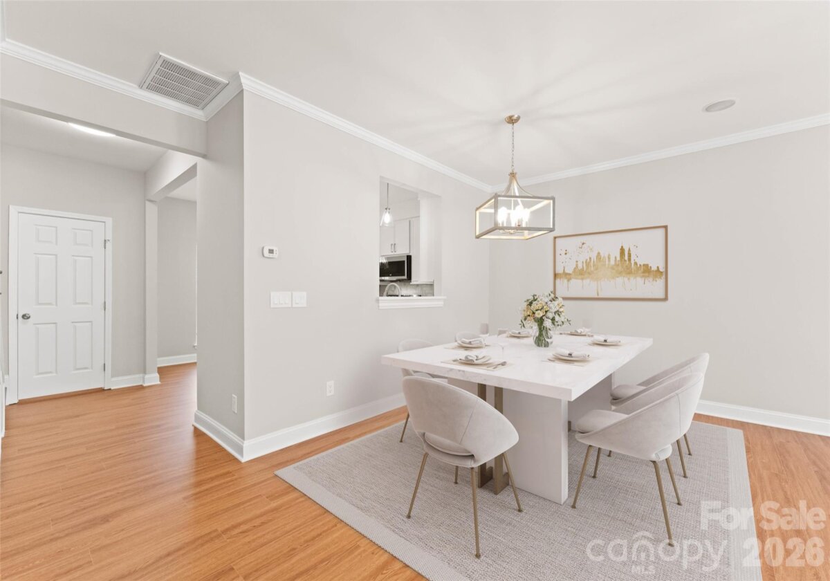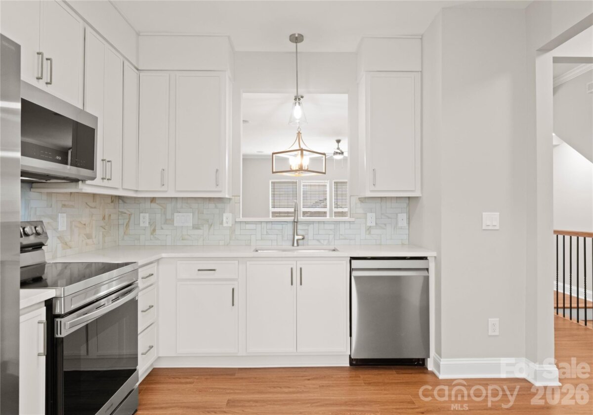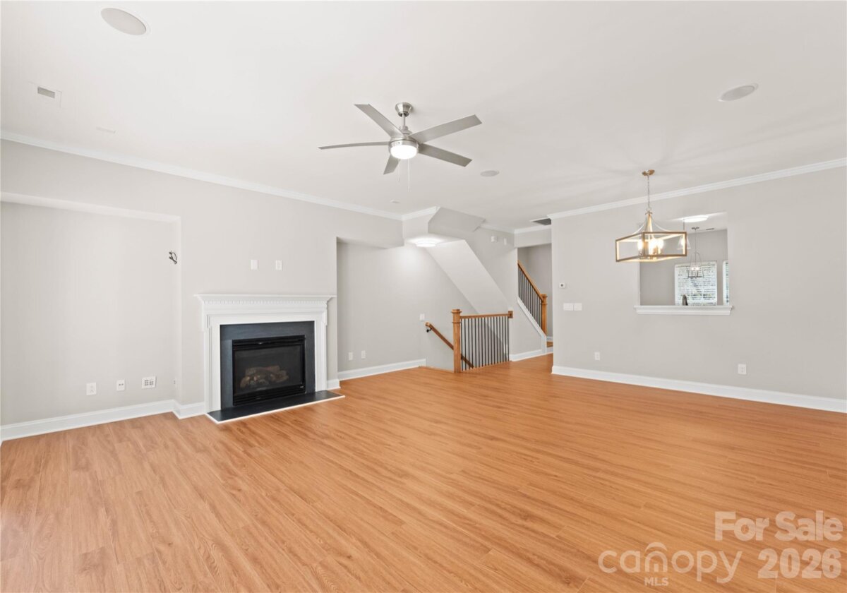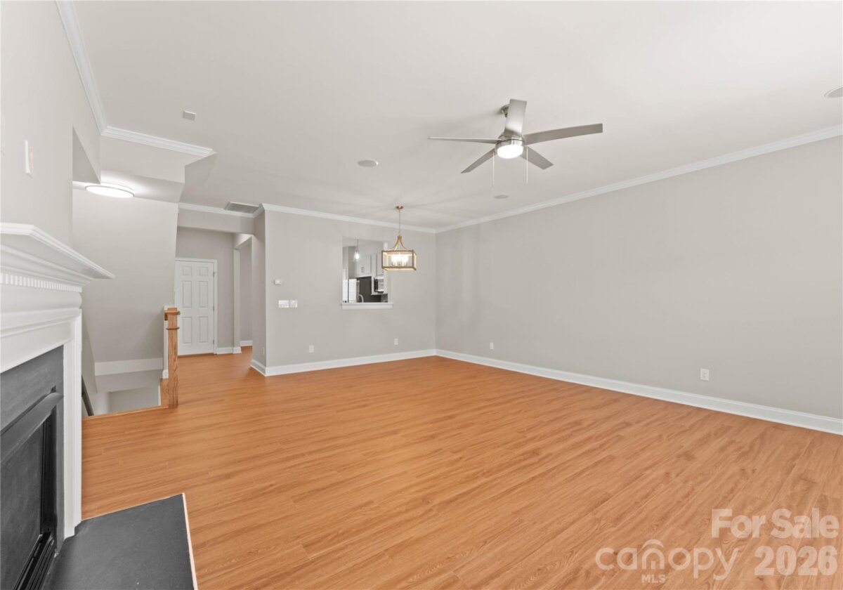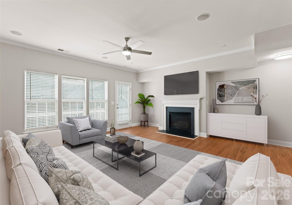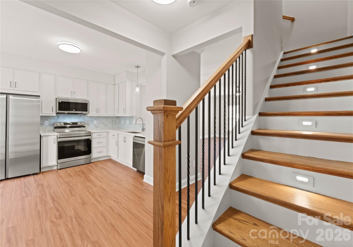 Welcome to this beautifully renovated 3-bedroom, 2-full, 2-half-bath townhome in the Blakeney Greens community. Modern finishes and thoughtful design include new wide-plank hardwood floors, fresh paint, new hardware, lighting, and fixtures throughout. Both staircases feature new wood treads with subtle under-tread lighting. An expansive open living and dining area with a kitchen pass-through is ideal for entertaining; in-ceiling surround sound is wired in the living area. The updated kitchen offers new cabinets, quartz countertops, a tiled backsplash, and new appliances. A large deck off the living room provides great space for dining and relaxing. The primary suite includes a tray ceiling, walk-in closet, and a spa-like en-suite with dual vanity, lighted mirrors, and a tiled, glass-enclosed walk-in shower. The secondary bedroom is upstairs with an updated bath featuring a new vanity, tub and surround, fixtures, and lighting. A versatile third bedroom/office with built-ins and glass doors on the ground floor adds flexible living space. Two updated half baths (one on the ground level and one on the main) provide added convenience. Practical upgrades include a finished oversized one-car garage with epoxy floors and a rear driveway with room for an additional vehicle. The neighborhood offers walking trails, a pool, greenway access, common spaces, and easy walking access to shops and restaurants. Near top-rated schools. Move-in ready — schedule your showing today.