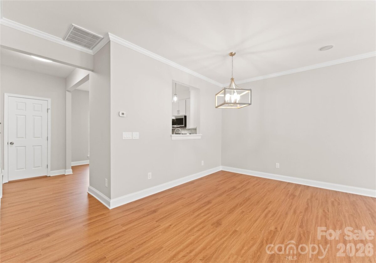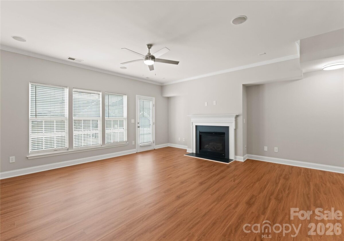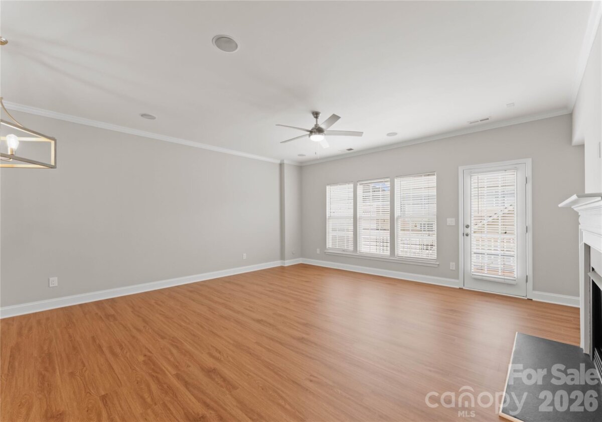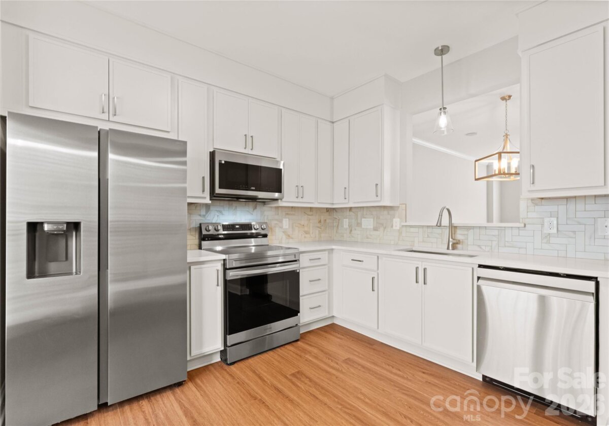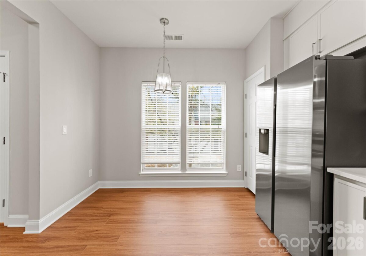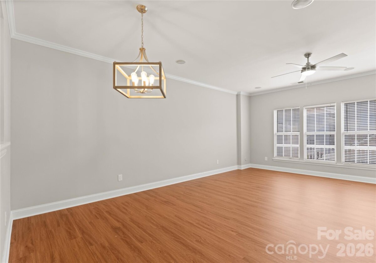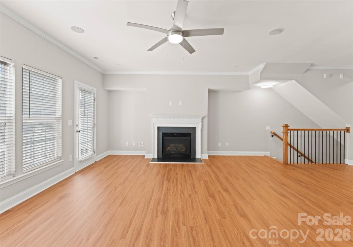 Welcome to this beautifully renovated 3-bedroom, 2-full, 2-half-bath townhome in the Blakeney Greens community. Modern finishes and thoughtful design include new wide-plank hardwood floors, fresh paint, new hardware, lighting, and fixtures throughout. Both staircases feature new wood treads with subtle under-tread lighting. An expansive open living and dining area with a kitchen pass-through is ideal for entertaining; in-ceiling surround sound is wired in the living area. The updated kitchen offers new cabinets, quartz countertops, a tiled backsplash, and new appliances. A large deck off the living room provides great space for dining and relaxing. The primary suite includes a tray ceiling, walk-in closet, and a spa-like en-suite with dual vanity, lighted mirrors, and a tiled, glass-enclosed walk-in shower. The secondary bedroom is upstairs with an updated bath featuring a new vanity, tub and surround, fixtures, and lighting. A versatile third bedroom/office with built-ins and glass doors on the ground floor adds flexible living space. Two updated half baths (one on the ground level and one on the main) provide added convenience. Practical upgrades include a finished oversized one-car garage with epoxy floors and a rear driveway with room for an additional vehicle. The neighborhood offers walking trails, a pool, greenway access, common spaces, and easy walking access to shops and restaurants. Near top-rated schools. Move-in ready — schedule your showing today.