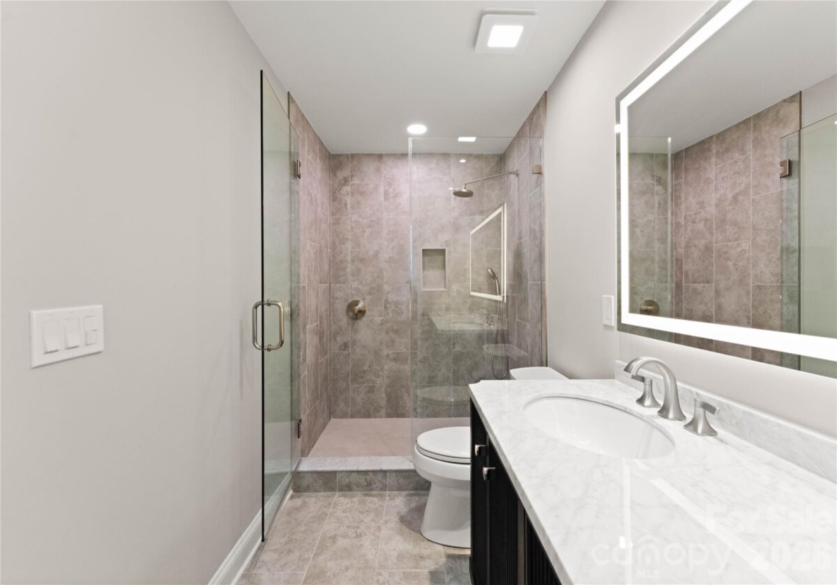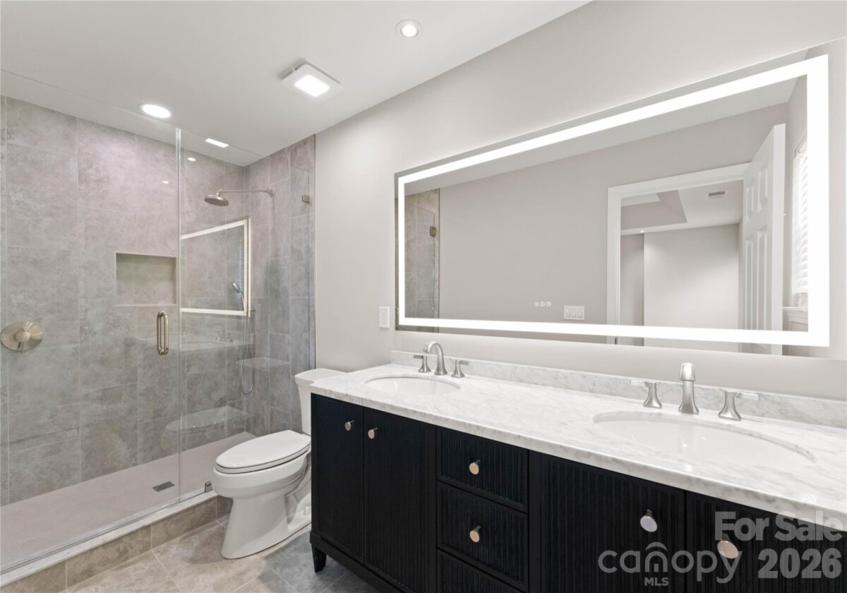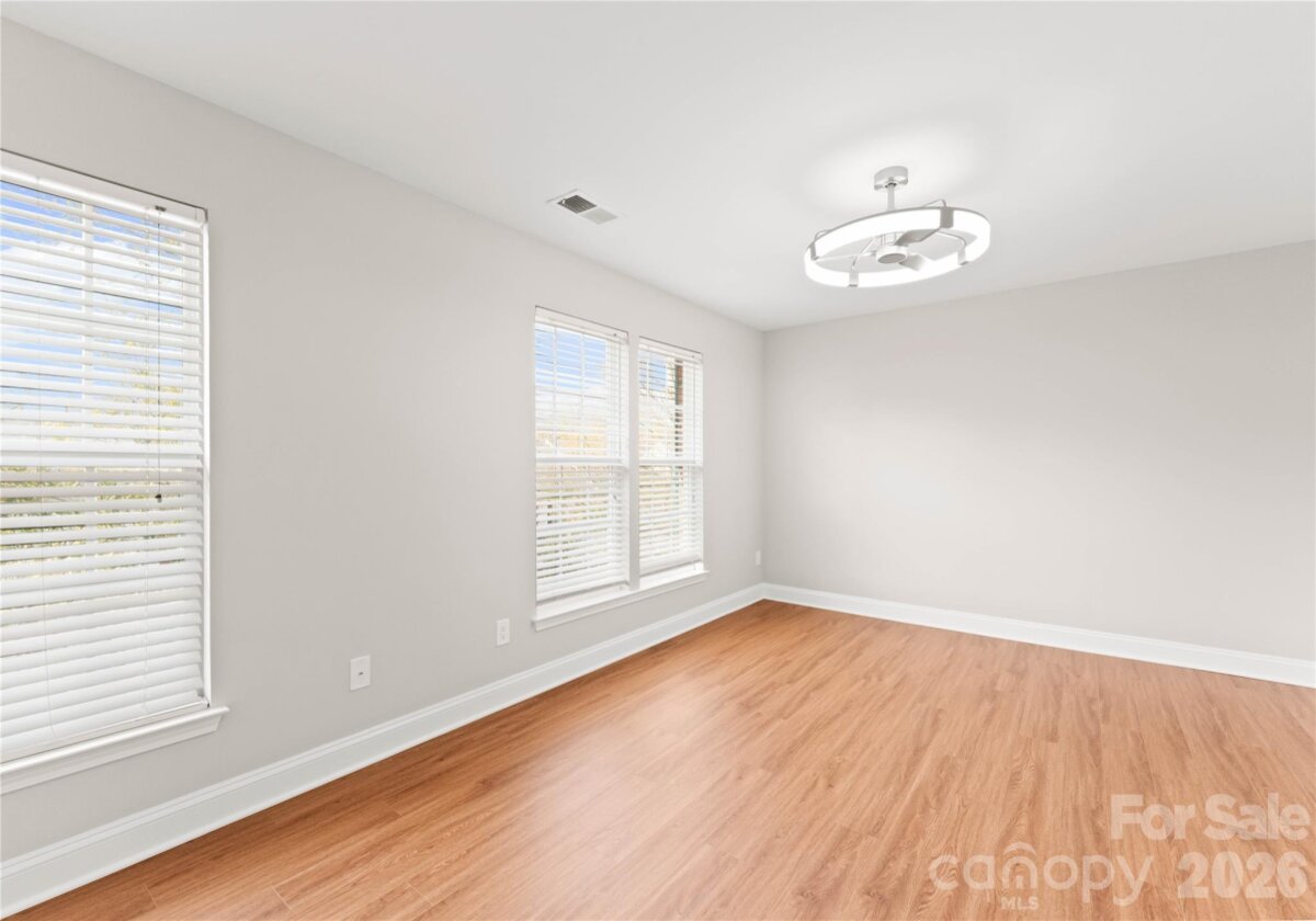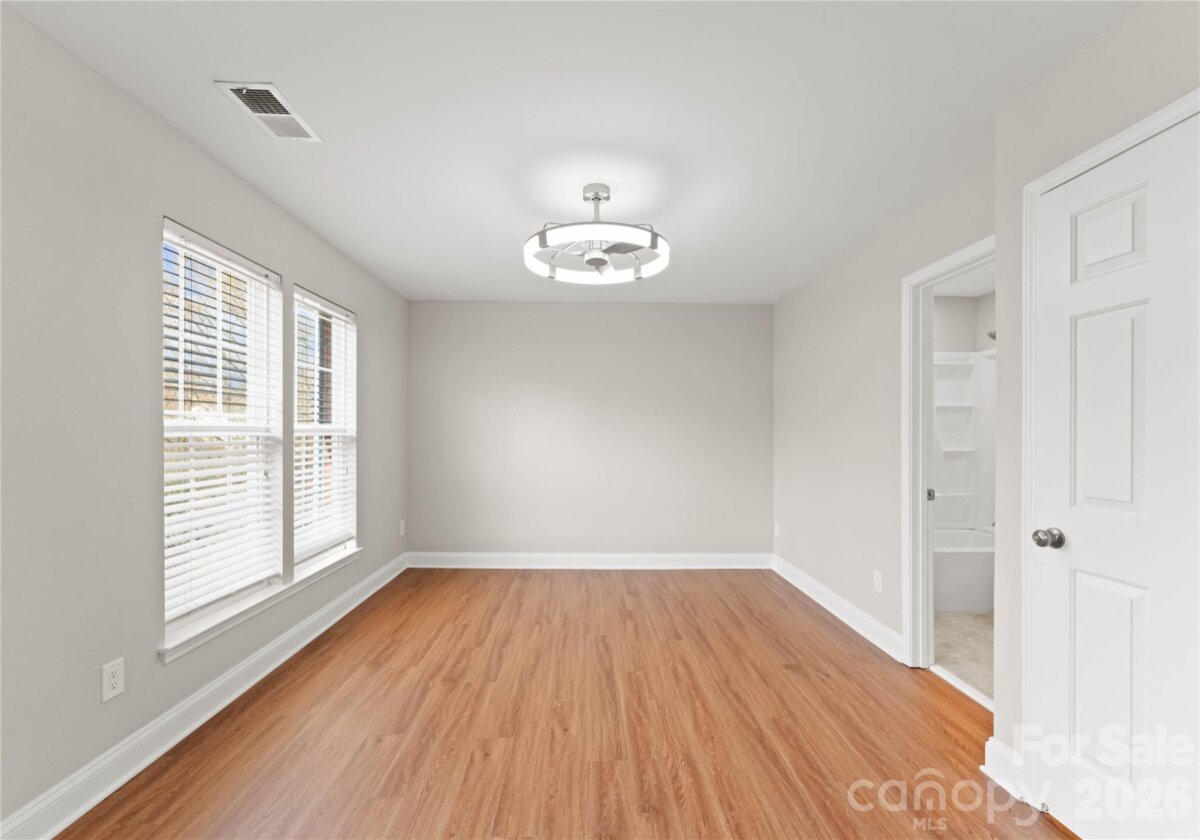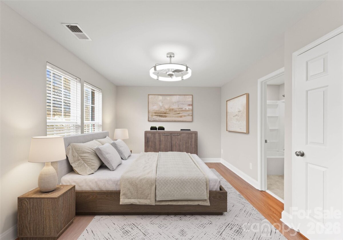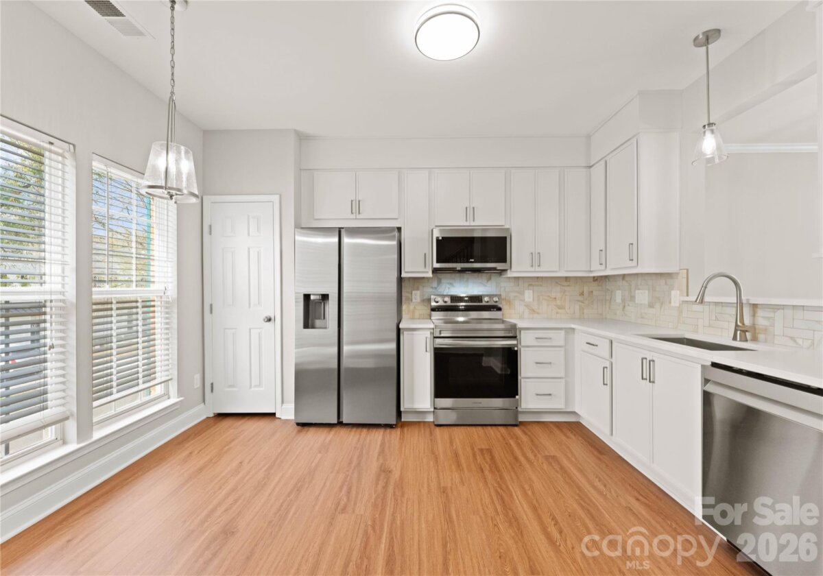 Welcome to this beautifully renovated 3-bedroom, 2-full, 2-half-bath townhome in the Blakeney Greens community. Modern finishes and thoughtful design include new wide-plank hardwood floors, fresh paint, new hardware, lighting, and fixtures throughout. Both staircases feature new wood treads with subtle under-tread lighting. An expansive open living and dining area with a kitchen pass-through is ideal for entertaining; in-ceiling surround sound is wired in the living area. The updated kitchen offers new cabinets, quartz countertops, a tiled backsplash, and new appliances. A large deck off the living room provides great space for dining and relaxing. The primary suite includes a tray ceiling, walk-in closet, and a spa-like en-suite with dual vanity, lighted mirrors, and a tiled, glass-enclosed walk-in shower. The secondary bedroom is upstairs with an updated bath featuring a new vanity, tub and surround, fixtures, and lighting. A versatile third bedroom/office with built-ins and glass doors on the ground floor adds flexible living space. Two updated half baths (one on the ground level and one on the main) provide added convenience. Practical upgrades include a finished oversized one-car garage with epoxy floors and a rear driveway with room for an additional vehicle. The neighborhood offers walking trails, a pool, greenway access, common spaces, and easy walking access to shops and restaurants. Near top-rated schools. Move-in ready — schedule your showing today.