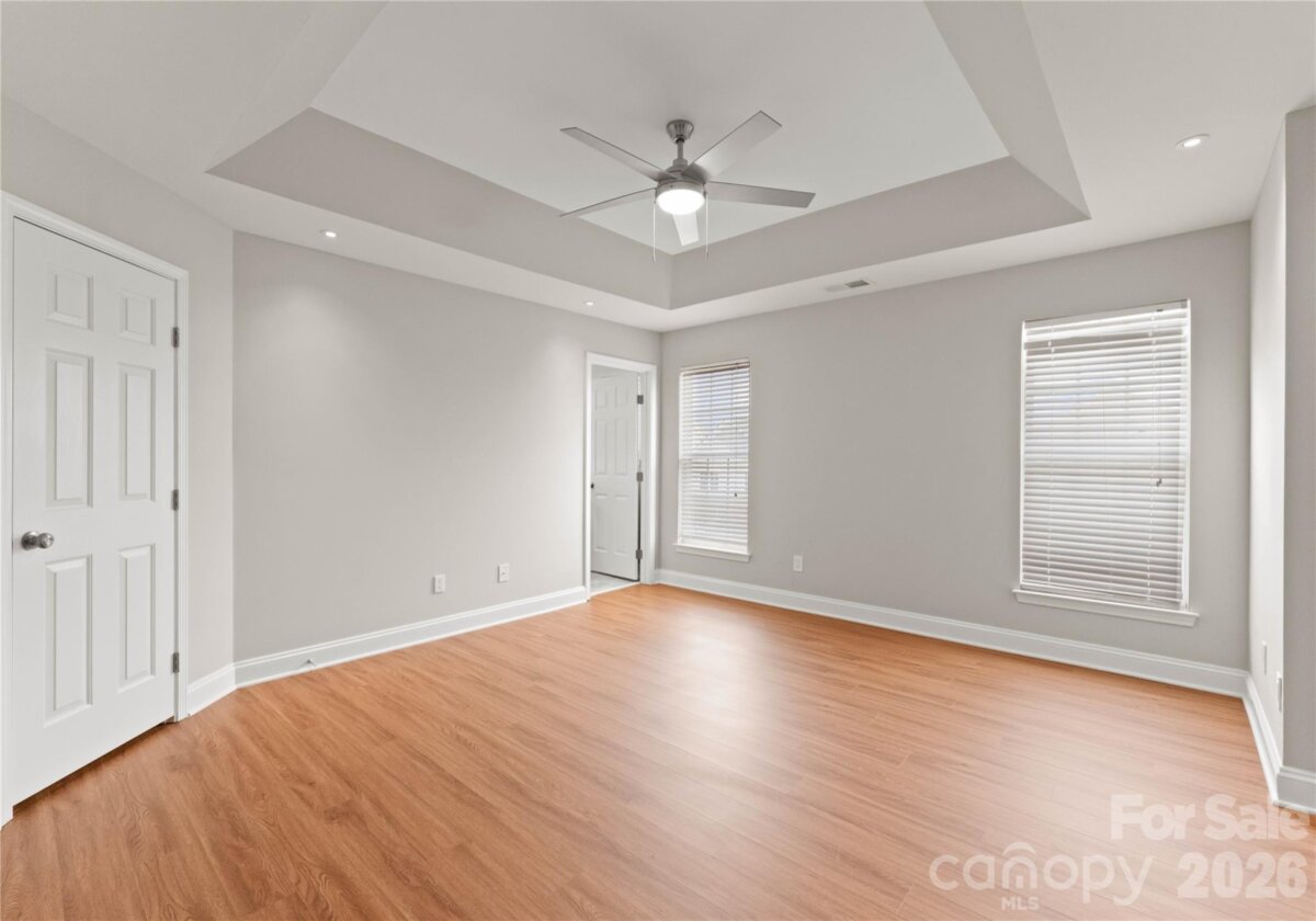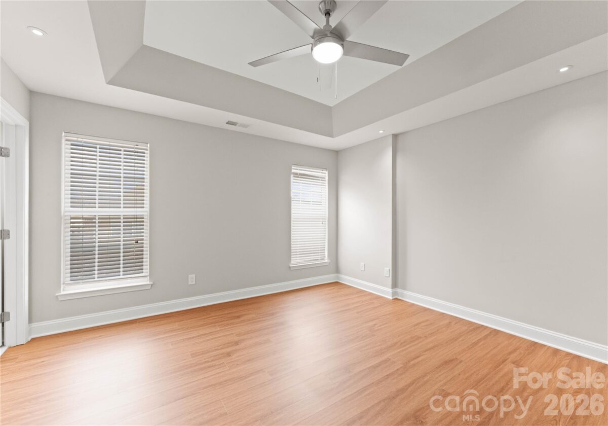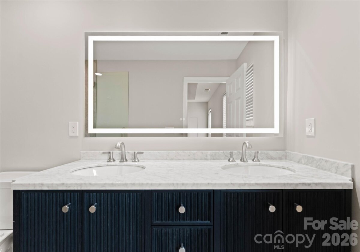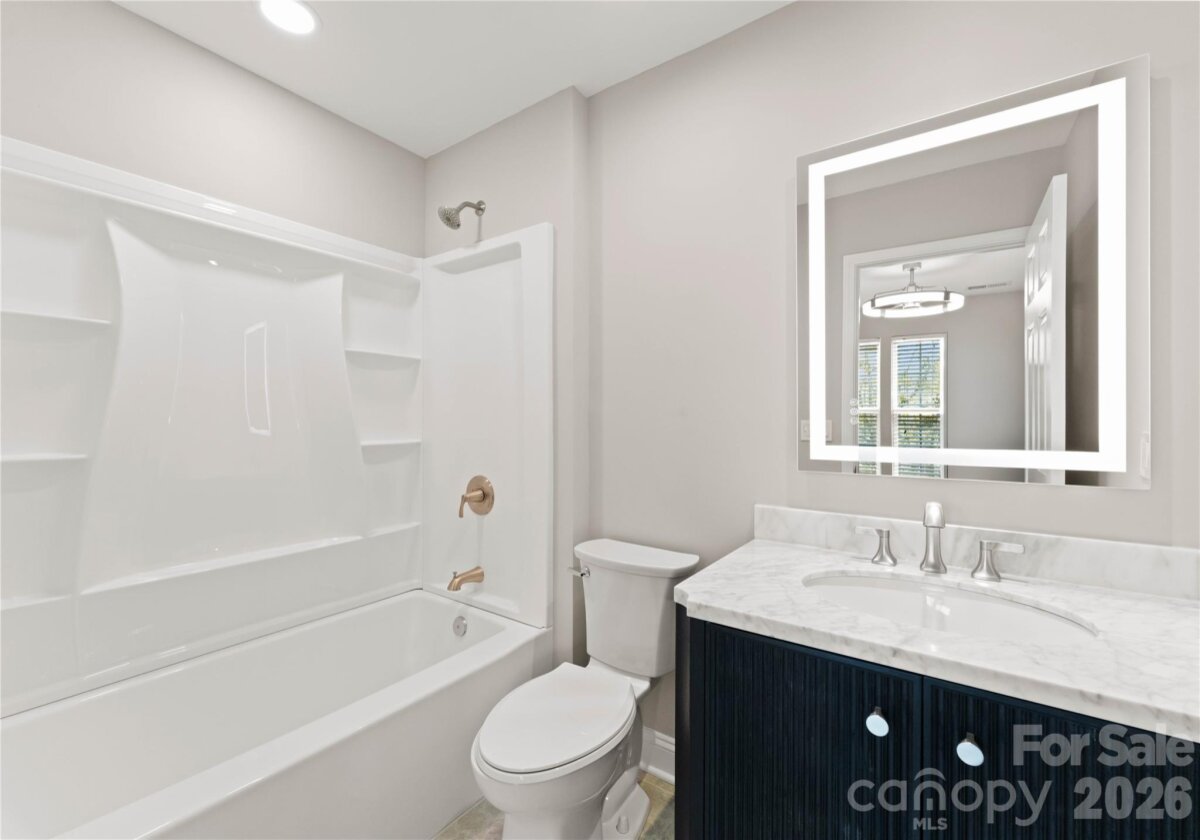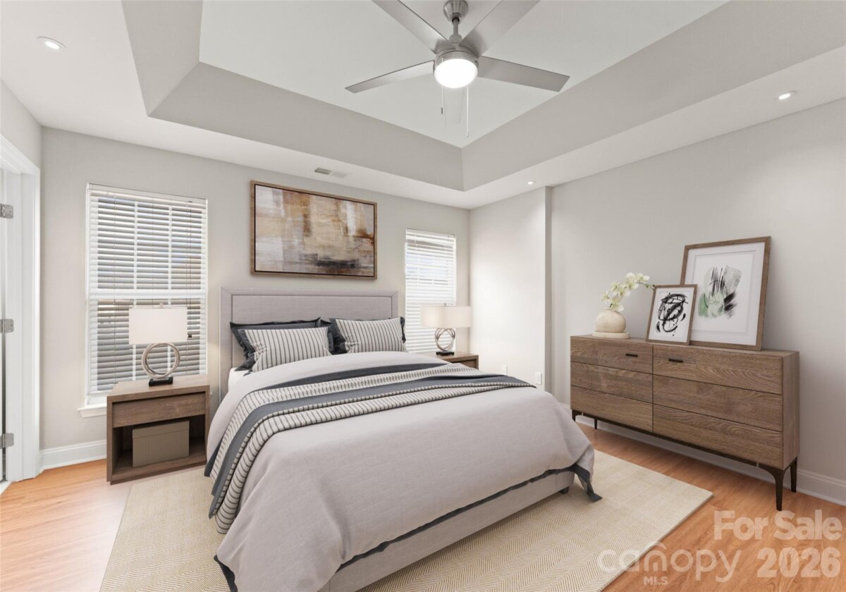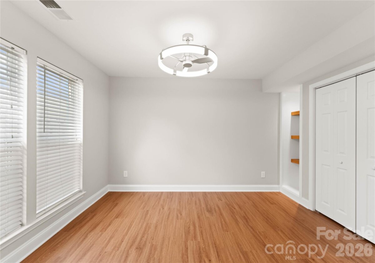 Welcome to this beautifully renovated 3-bedroom, 2-full, 2-half-bath townhome in the Blakeney Greens community. Modern finishes and thoughtful design include new wide-plank hardwood floors, fresh paint, new hardware, lighting, and fixtures throughout. Both staircases feature new wood treads with subtle under-tread lighting. An expansive open living and dining area with a kitchen pass-through is ideal for entertaining; in-ceiling surround sound is wired in the living area. The updated kitchen offers new cabinets, quartz countertops, a tiled backsplash, and new appliances. A large deck off the living room provides great space for dining and relaxing. The primary suite includes a tray ceiling, walk-in closet, and a spa-like en-suite with dual vanity, lighted mirrors, and a tiled, glass-enclosed walk-in shower. The secondary bedroom is upstairs with an updated bath featuring a new vanity, tub and surround, fixtures, and lighting. A versatile third bedroom/office with built-ins and glass doors on the ground floor adds flexible living space. Two updated half baths (one on the ground level and one on the main) provide added convenience. Practical upgrades include a finished oversized one-car garage with epoxy floors and a rear driveway with room for an additional vehicle. The neighborhood offers walking trails, a pool, greenway access, common spaces, and easy walking access to shops and restaurants. Near top-rated schools. Move-in ready — schedule your showing today.