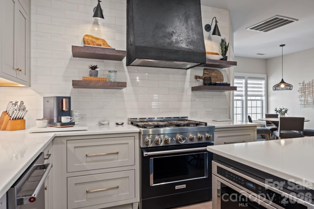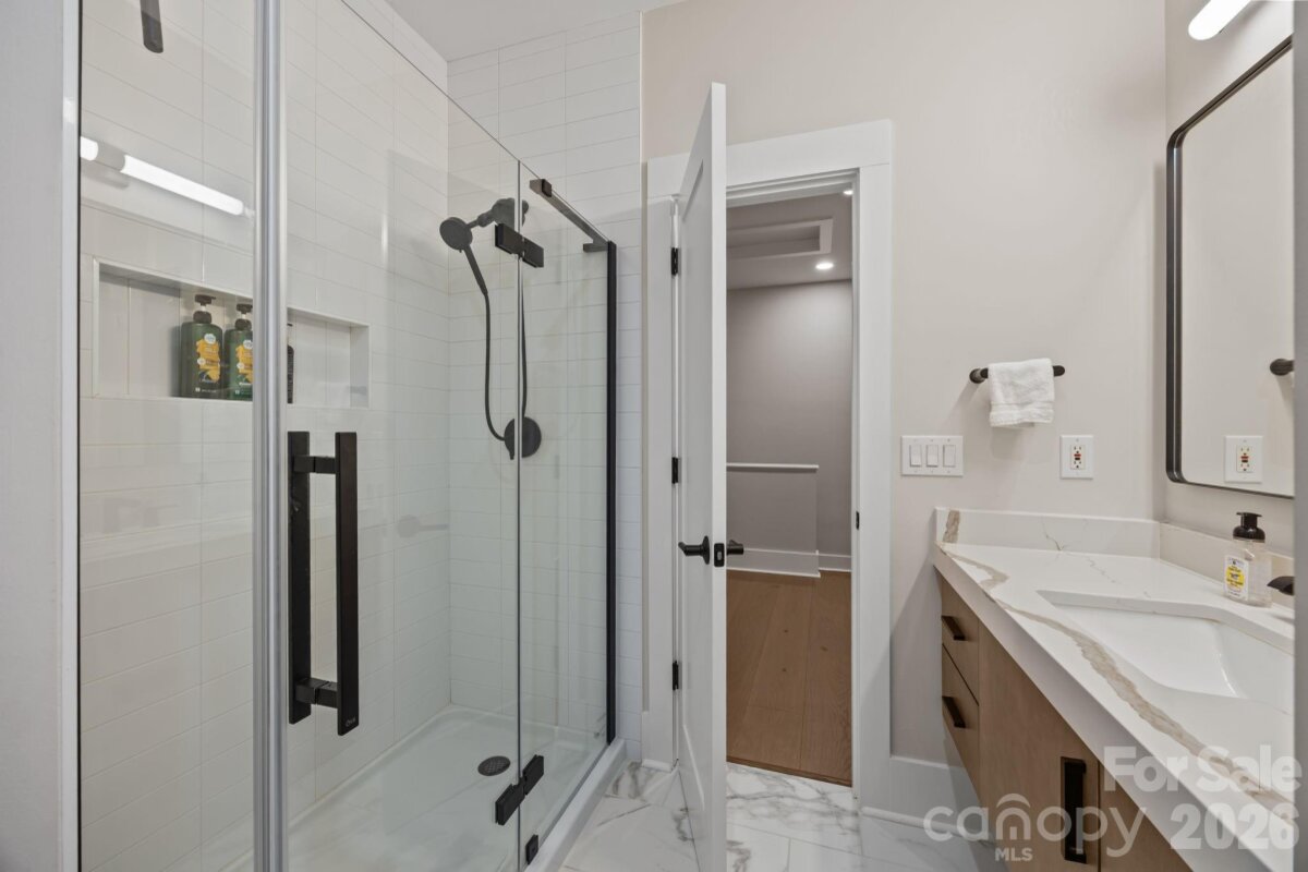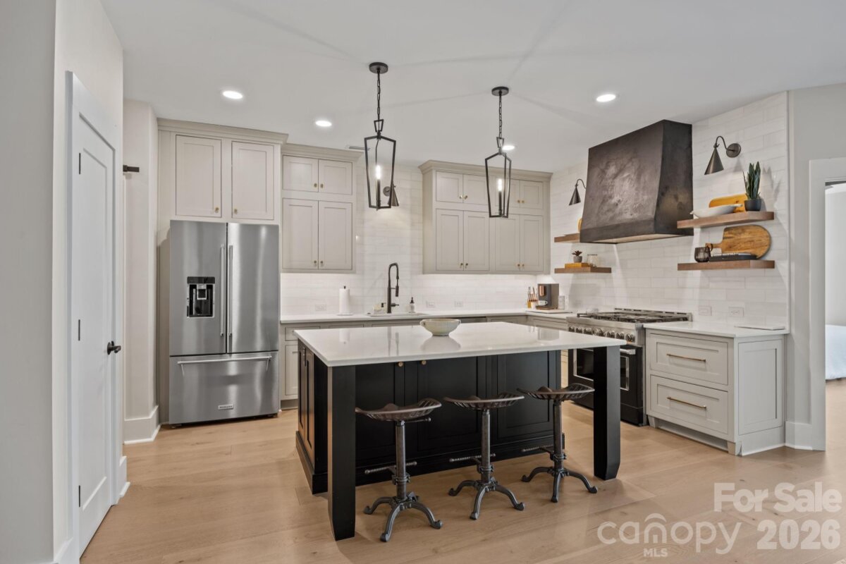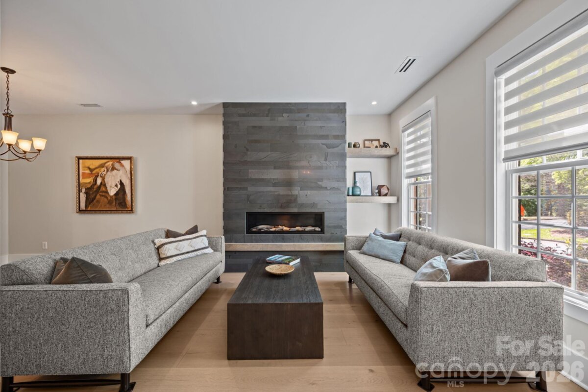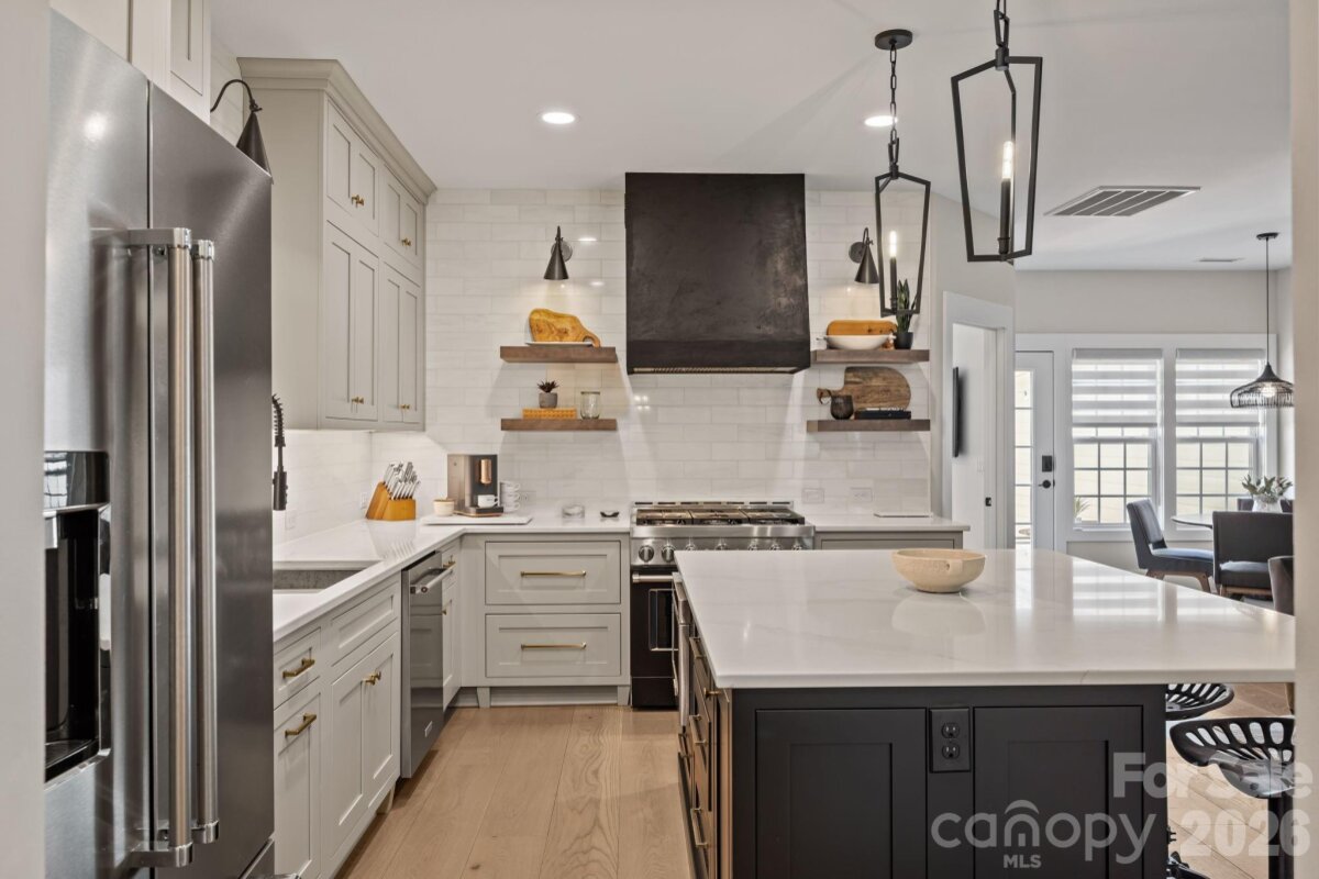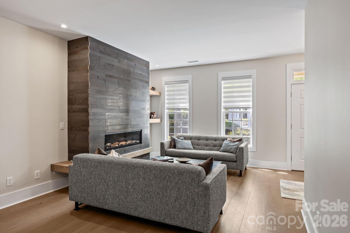 Fully renovated from top to bottom, this exceptional St. Albans townhome offers a rare blend of custom design, high-end finishes, and low-maintenance living in one of Davidson’s most desirable walkable neighborhoods. Located directly across from the park, this one-of-a-kind home has been thoughtfully transformed well beyond a typical update, with no detail overlooked. Highlights include a main-level primary suite, wide-plank engineered hardwoods throughout, including the stairs and bedrooms, all new upgraded interior doors and custom trim work, and a stunning chef’s kitchen with custom cabinetry, quartz countertops, commercial-style gas range, marble backsplash to the ceiling, and a dramatic statement hood. The open living space is anchored by a sleek linear gas fireplace with full-height stone surround and floating shelves, while the home’s modern design continues with a custom stair railing, and beautifully finished details throughout. Spa-like bathrooms feature floating hardwood vanities, oversized tile, black fixtures, and a freestanding soaking tub in the primary suite. Additional features include a custom laundry and storage space with modern glass-and-metal style sliding door, finished flex room ideal for an office, gym, or creative space, EV-ready garage, and new HVAC and water heater (2025). A truly turnkey opportunity for the buyer seeking style, quality, and walkability, just moments from Davidson’s shops, dining, and charm!