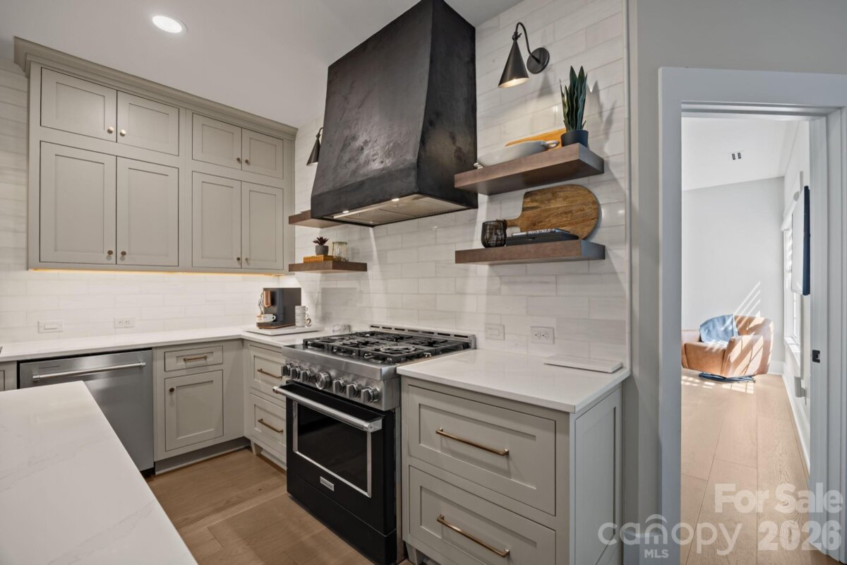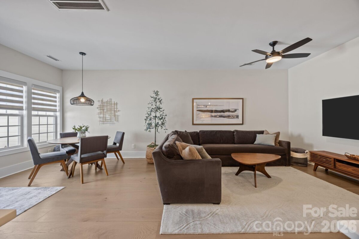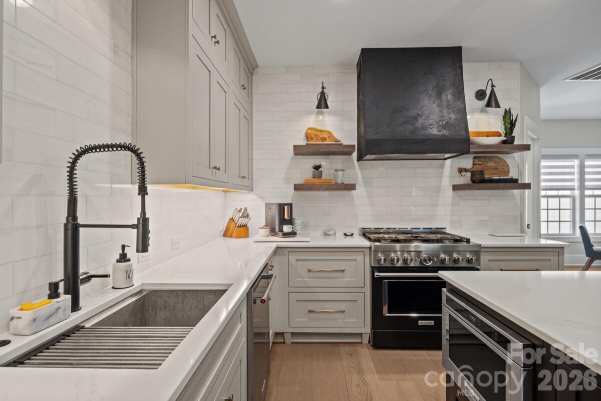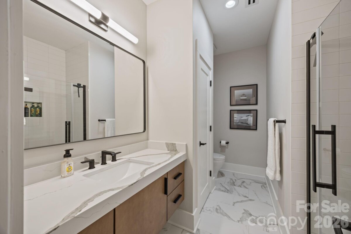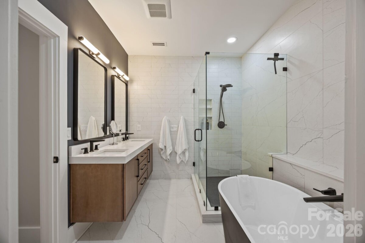 Fully renovated from top to bottom, this exceptional St. Albans townhome offers a rare blend of custom design, high-end finishes, and low-maintenance living in one of Davidson’s most desirable walkable neighborhoods. Located directly across from the park, this one-of-a-kind home has been thoughtfully transformed well beyond a typical update, with no detail overlooked. Highlights include a main-level primary suite, wide-plank engineered hardwoods throughout, including the stairs and bedrooms, all new upgraded interior doors and custom trim work, and a stunning chef’s kitchen with custom cabinetry, quartz countertops, commercial-style gas range, marble backsplash to the ceiling, and a dramatic statement hood. The open living space is anchored by a sleek linear gas fireplace with full-height stone surround and floating shelves, while the home’s modern design continues with a custom stair railing, and beautifully finished details throughout. Spa-like bathrooms feature floating hardwood vanities, oversized tile, black fixtures, and a freestanding soaking tub in the primary suite. Additional features include a custom laundry and storage space with modern glass-and-metal style sliding door, finished flex room ideal for an office, gym, or creative space, EV-ready garage, and new HVAC and water heater (2025). A truly turnkey opportunity for the buyer seeking style, quality, and walkability, just moments from Davidson’s shops, dining, and charm!