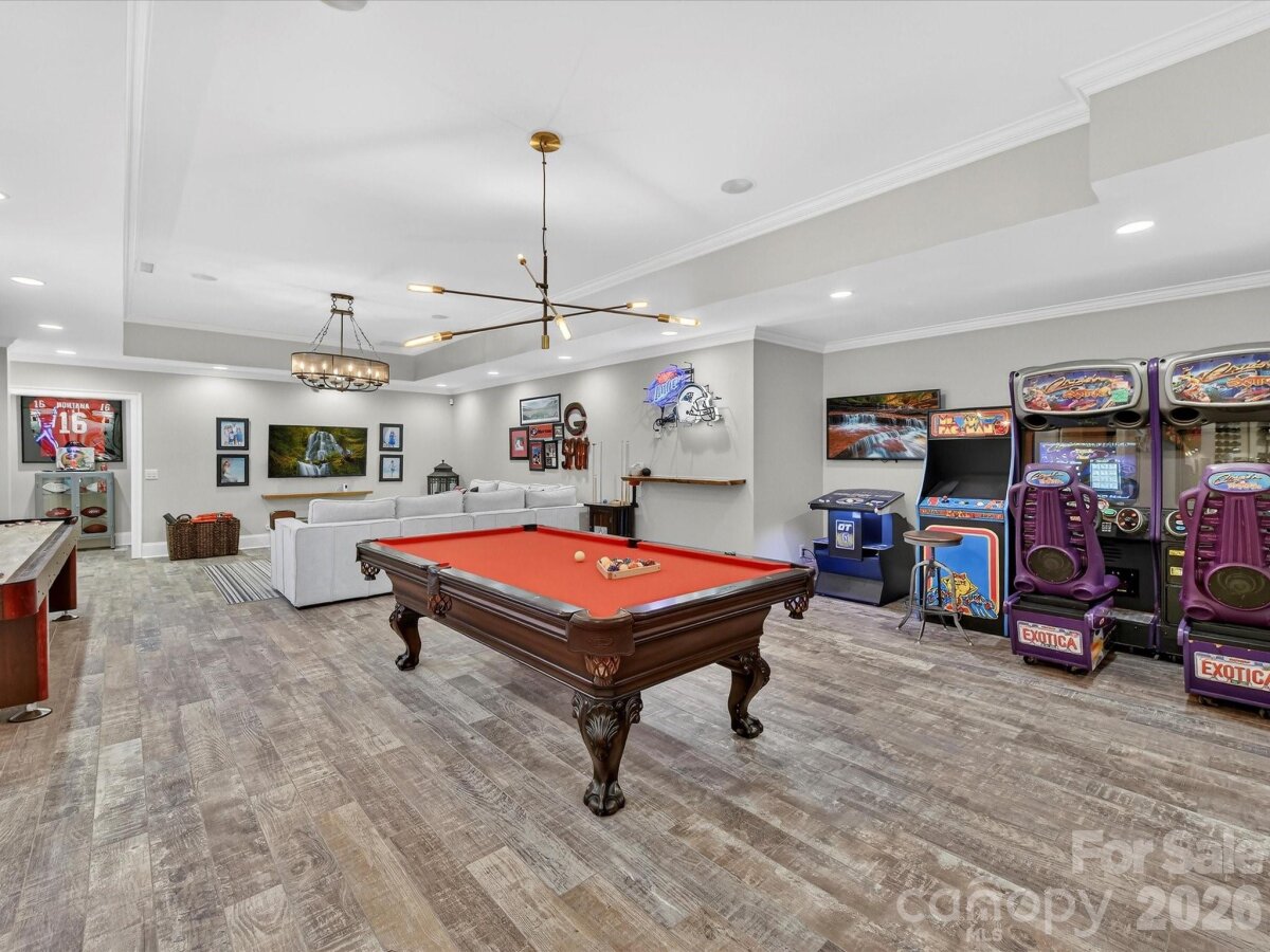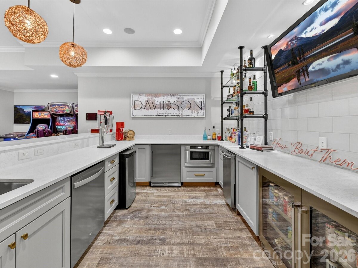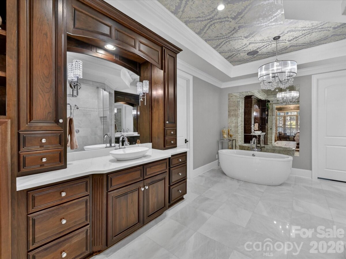 Welcome to 18624 Silent Falls Cove, a refined private estate where thoughtful design, modern technology, and resort-style living converge in quiet elegance. Set gracefully at the end of a cul-de-sac, this exceptional residence offers a rare sense of privacy while remaining effortlessly connected to everyday living and entertaining. The home unfolds with intention, offering five bedrooms, five full bathrooms, two half baths, and a beautifully appointed detached casita suite—a private one-bedroom retreat with full bath, ideal for guests, multigenerational living, or a secluded office or studio. At the heart of the home, the kitchen is both striking and highly functional, designed for those who appreciate form as much as function. Professional-grade Sub-Zero appliances, including a statement Wolf gas range with custom hood, built-in oversized refrigerator, double wall ovens, and integrated refrigeration drawers, are complemented by custom cabinetry and a substantial island topped in white quartz. Layered lighting creates a warm, inviting atmosphere as the space flows seamlessly into the great room, where deep coffered ceilings and a white stone fireplace anchor the home’s primary gathering space. A formal dining room nearby offers a timeless setting for intimate dinners and larger celebrations alike. The main-level primary suite is a serene sanctuary, defined by architectural detailing and a spa-inspired bath designed for daily indulgence. Heated floors, a generous soaking tub, an oversized fully tiled shower, and dual vanities with floor-to-ceiling custom cabinetry are crowned by a beautifully detailed tray ceiling accented with designer wallpaper and chandelier. Expansive his-and-her walk-in closets complete this exceptional retreat. Upstairs, the home continues to impress with three additional bedrooms, each with its own full bath, thoughtfully integrated study and workspaces ideal for modern living, and abundant walk-in attic storage, including a space offering future expansion potential. Designed for elevated entertaining, the lower level offers a sophisticated extension of the home’s living spaces. A custom craft cocktail bar with seating for six, complete with kegerator, ice maker, beverage cooler, and additional XO refrigerator, sets the stage for memorable evenings. A dedicated wine cellar, shuffleboard area (table conveys), theater or fitness room, private guest suite, and walk-out flex space provide exceptional versatility. Outdoors, the estate unfolds as a private sanctuary designed for both effortless entertaining and everyday retreat. The resort-style heated saltwater pool and spa anchor the setting, framed by multiple covered and open-air living areas that invite lingering conversations and relaxed afternoons. An outdoor chef’s kitchen with XO Fridge with an expansive bar for dining, entertaining, and gathering—creates a natural hub for hosting, while the adjacent covered lounge with stone fireplace and pergola seating area offers a welcoming place to unwind, all overlooking the shimmering pool below. Just beyond, the detached casita stands as a destination unto itself—a beautifully appointed one-bedroom, one-bath retreat featuring a stunning tiled shower and a warm, inviting ambiance that feels both luxurious and comfortably home. Thoughtfully layered spaces, from the turfed lawn to garden beds and greenhouse, complete an outdoor environment that feels curated, intentional, and truly exceptional. Set on approximately 0.51 acres, offering 6,288 square feet, and located within the highly sought-after "A" Rated Davidson Elementary and Hough High School district, 18624 Silent Falls Cove presents a rare opportunity to own a home defined by balance—luxury without excess, sophistication without pretense, and spaces designed to be truly lived in. Priced to sell quickly!