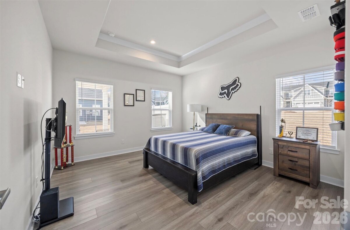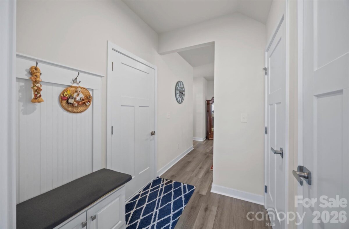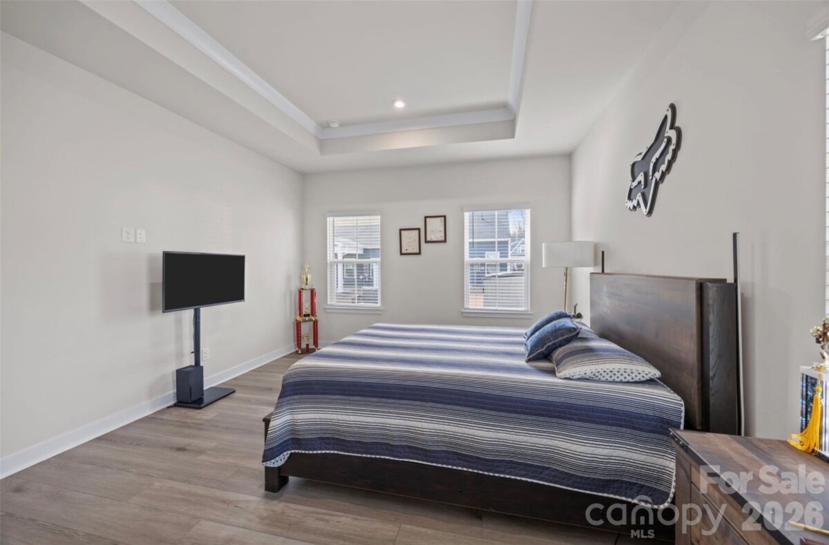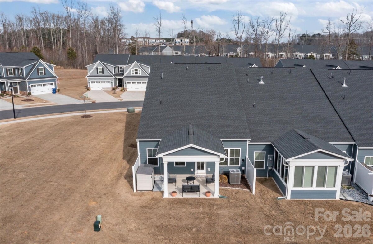 Bright, elegant end-unit townhome featuring upscale finishes, positioned on a corner lot that adds extra privacy and space. Kitchen is designed to impress with quartz countertops, a luxury custom tile backsplash, large center island, pendant lighting, and under cabinet lighting, complemented by upgraded cabinetry with soft-close doors. This creates both elegance and functionality for everyday living and entertaining. Main level primary suite provides a relaxing retreat highlighted by a tray ceiling and a spa inspired bath complete with dual shower heads and a frameless glass shower. Thoughtful upgrades continue throughout the home, including a laundry sink, painted garage walls, and a garage outfitted with cabinetry and overhead storage racks for added organization. Upstairs, you'll find two spacious bedrooms, a full bath, and a versatile office. It is a perfect space for guests, work from home flexibility, or hobbies. Enjoy outdoor living on the covered porch. It's a wonderful place to enjoy a cup of coffee, quiet evenings, or entertain guests. Residents of Rivercross enjoy first class community amenities, including a clubhouse, business center, and outdoor pool, all designed to enhance your lifestyle. You will love that this townhome is ideally located just minutes from upscale restaurants, breweries, lake access, and beautiful parks offering both luxury living and everyday convenience. This exceptional townhome has so much to offer.