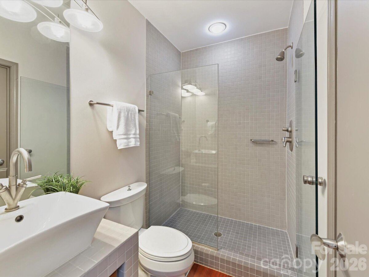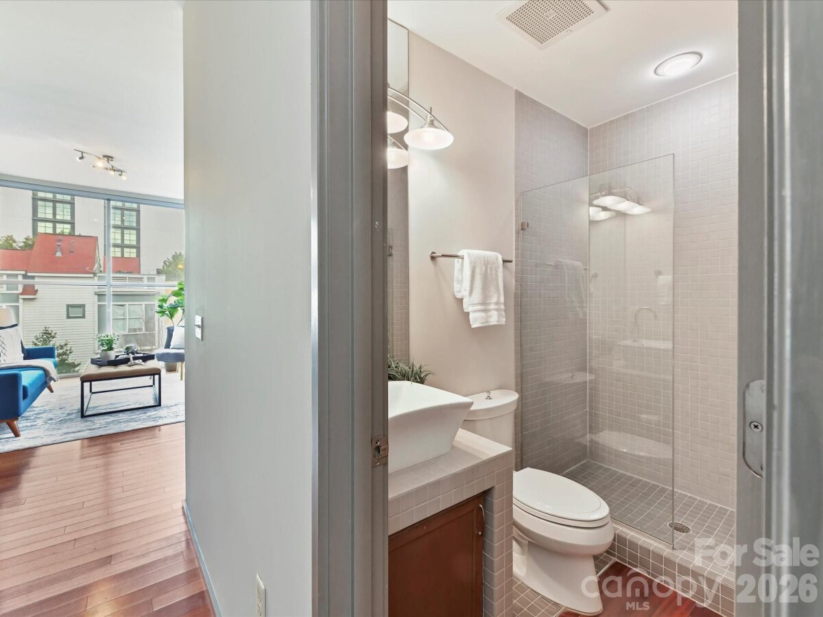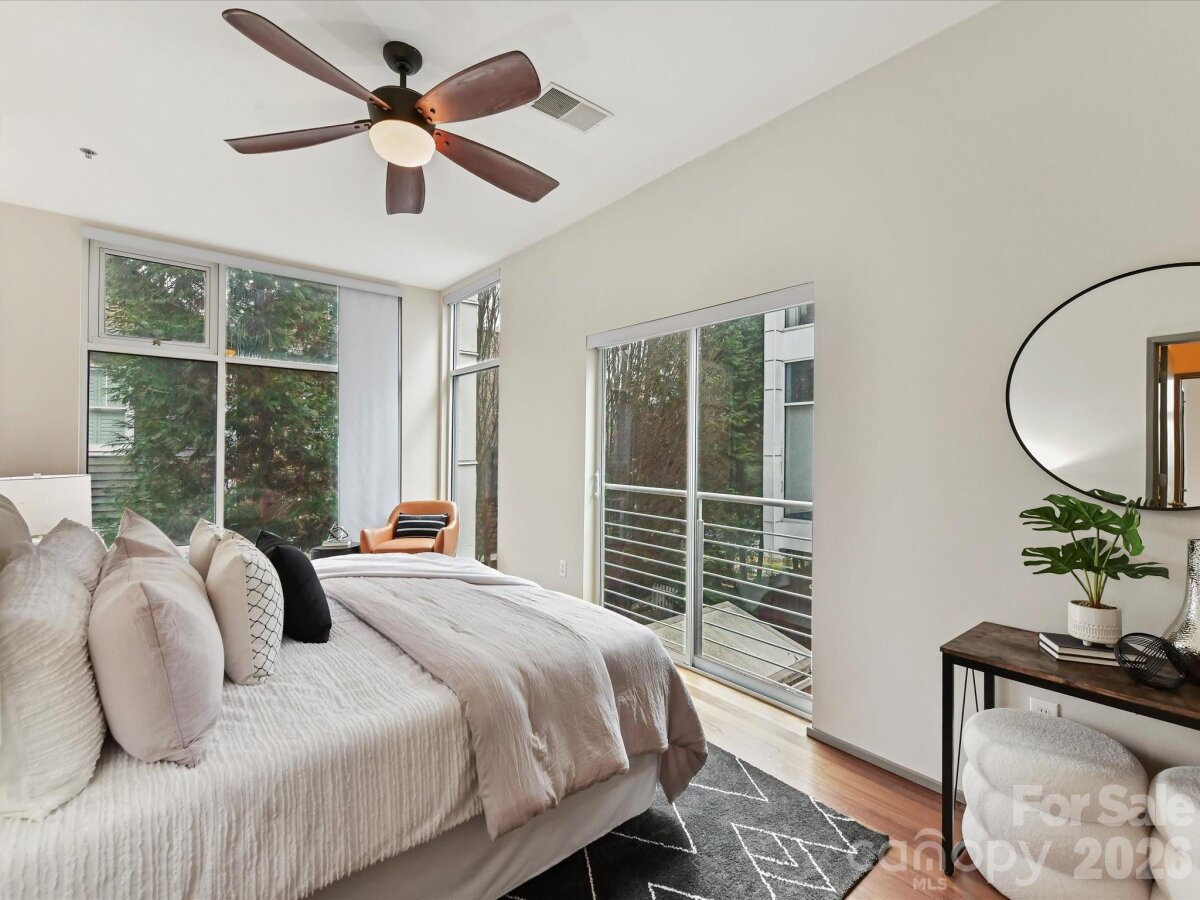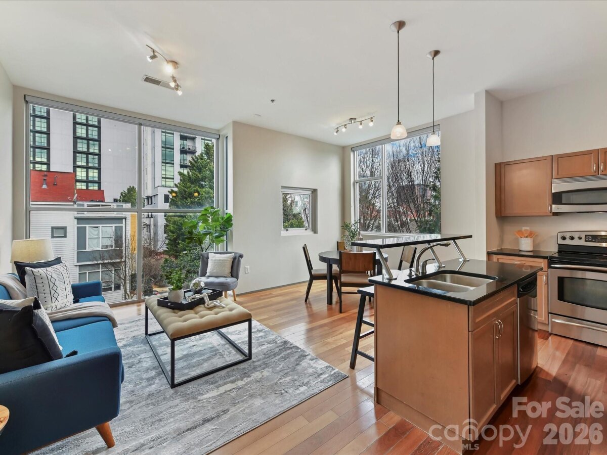 **The Seller is offering to prepay $15K, with an acceptable offer, toward temporarily elevated HOA dues related to a completed exterior community project**Welcome to Lofts Dilworth, a contemporary condo complex located in the heart of Dilworth and just minutes to Southend! Enjoy the wonderful walkability to some of Dilworth's best restaurants or enjoy the ease of shopping at the Atherton Mill in Southend. This 3 bedroom 3 FULL bath condo is a rare floorplan in this complex and with it being an end unit, located closest to the city, you cannot beat the Uptown Charlotte & Southend skyline views from your very own rooftop terrace! The main level consists of two spacious bedrooms, each with their own ensuite bath and a laundry room that features a stackable washer & dryer which convey with the unit. The upper level features a sleek and modern kitchen that is open to the main living room and breakfast nook and then a third bedroom with it's own ensuite third full bath. Enjoy the lovely exterior views from every level out the floor to ceiling windows that flood the property with natural light. Hard to find this price for this much square footage in the heart of Dilworth! This condo has been freshly painted throughout and had a new HVAC unit installed in 2024. The windows have treatments/shades that will convey.