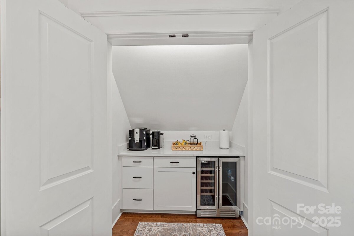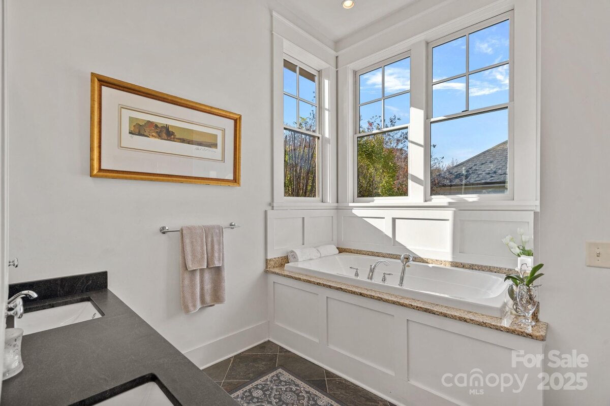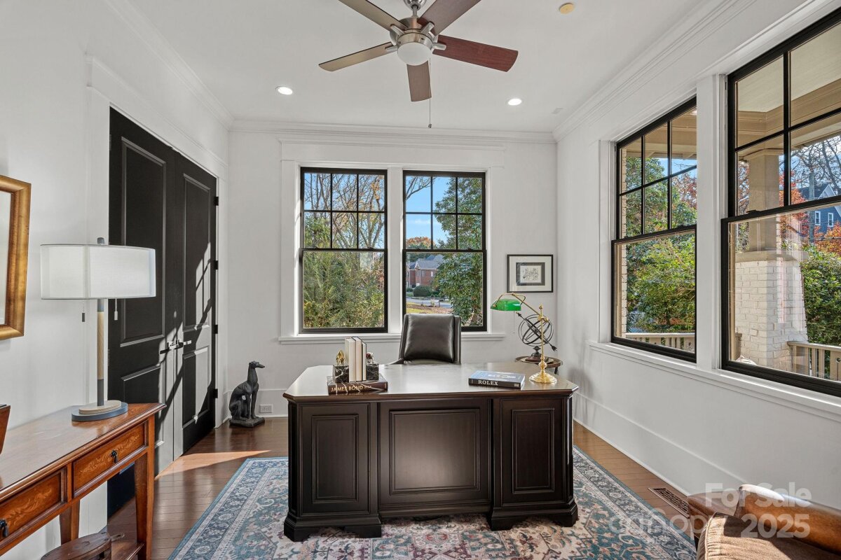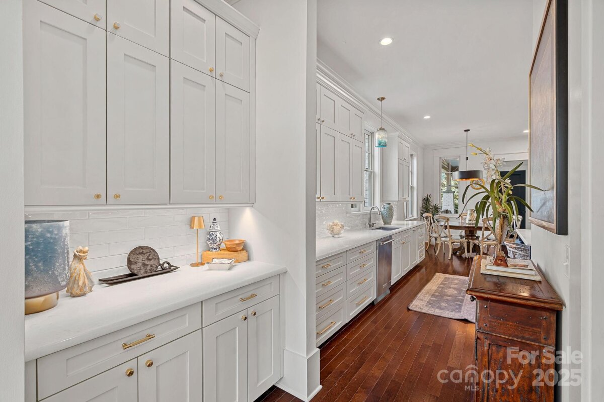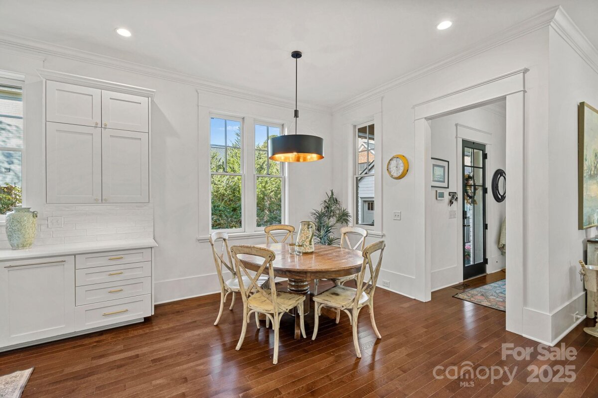 Nestled in highly sought-after Eastover, this exceptional residence sits just steps from the neighborhood Greenway entrance leading directly to the Mint Museum. Crafted with unique, intricate, timeless brickwork and impeccable attention to detail, this one-of-a-kind home radiates warmth, elegance, and classic Southern charm. A beautiful, expansive front porch welcomes you inside, where an open and airy floorplan is filled with abundant natural light streaming through generous windows. The gracious entry is flanked by an inviting dining room and a spacious office/den. The stunning chef’s kitchen features a large center island, gas cooktop, quartz countertops, a walk-in pantry and ample counter/prep space and opens seamlessly to the breakfast area and large, comfortable family room—perfectly suited for both everyday living and entertaining. Thoughtful design touches continue throughout the main level, including a charming study nook with two built-in desks at the base of the stairs, a cozy sitting room, and a convenient side-entry drop zone. Upstairs, the tranquil primary suite impresses with vaulted ceilings, two closets (one currently used as a coffee bar), and a newly refreshed spa-like bath boasting black leathered granite countertops, new sinks, and new faucets. Three additional bedrooms and two updated full baths—both with new countertops, sinks, and faucets—along with a centrally located laundry room complete the second floor. The third floor offers wonderful flexibility as a fifth bedroom suite with its own full bath. This space is currently utilized as a multi-purpose room. Enjoy peaceful mornings on the back porch or entertain with ease on the spacious front and rear porches—both ideal for gatherings or quiet moments outdoors. A detached two-car garage adds convenience and functionality to this already impressive property. This Eastover gem seamlessly blends craftsmanship, comfort, and a premier location—an exceptional opportunity not to be missed.
