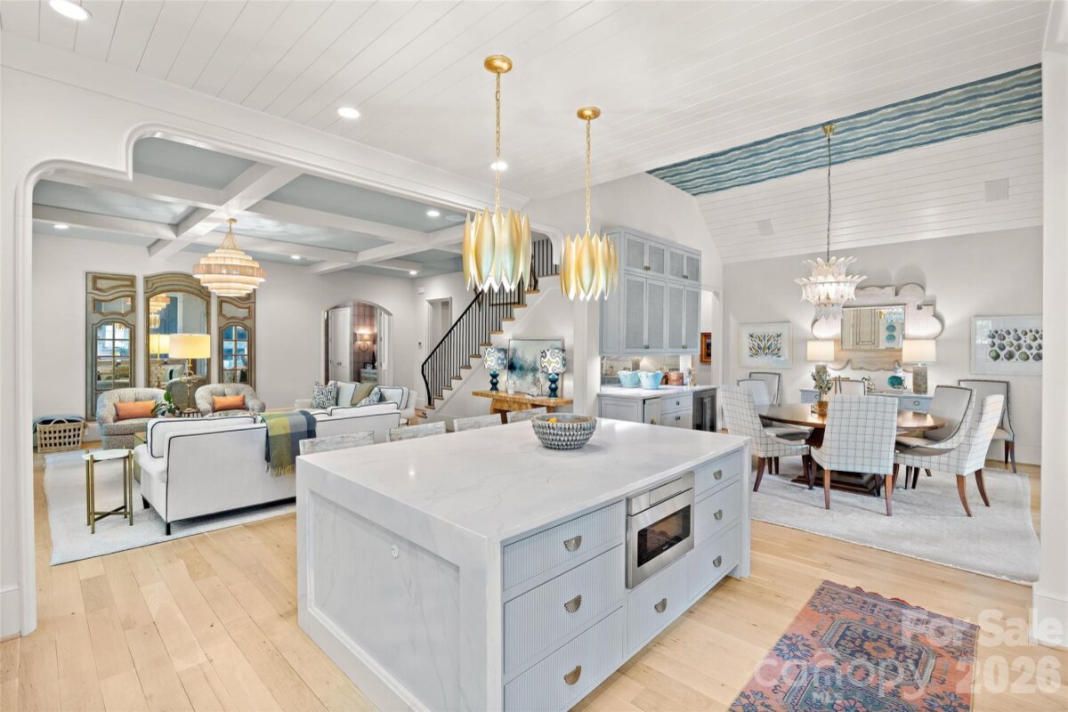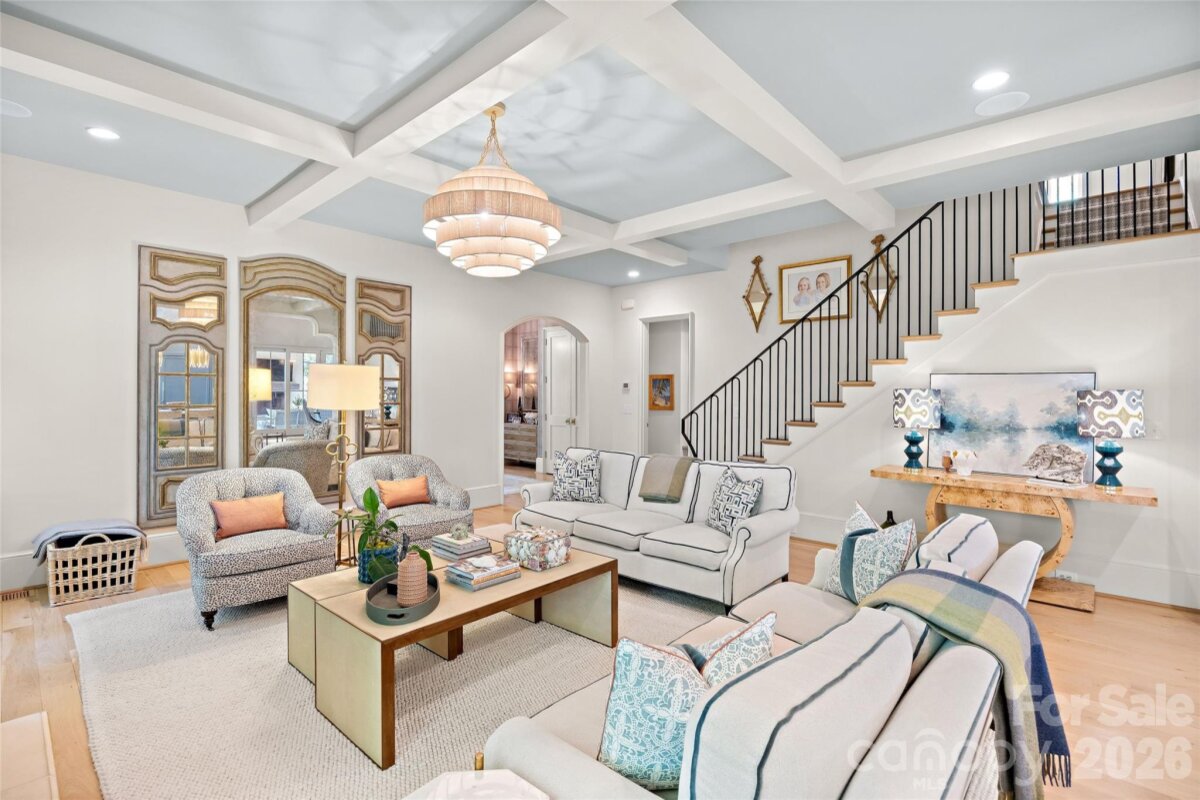 Stunning custom home in the heart of Eastover, built by Knight Construction in 2022 and thoughtfully designed with exceptional detail and designer-grade finishes throughout. Situated on a .37-acre lot, this 6BR/5.5BA residence offers over 5,200 sq/ft across 3 beautifully finished levels. Open main level features white oak hardwoods, gracious foyer, and incredible kitchen with custom cabinetry, quartz surfaces, waterfall island, and top-tier appliances including ILVE gas range. Generous family room with coffered ceiling and cast stone fireplace and office/guest room with en-suite bath. The dining room with built-in bar flows seamlessly to a covered rear porch with vaulted ceiling, fireplace, and grilling area—all overlooking the turfed rear yard with new fencing and lush landscaping. Luxurious primary suite with spa-like marble bath and expansive custom closet. Upper level offers 3 spacious secondary bedrooms and bonus room, while the impressive lower level includes a rec room, exercise room, guest suite, and abundant storage. Live next to neighborhood parks, shops, grocery, and dining; absolutely unbeatable location in one of Charlotte’s most desired neighborhoods!