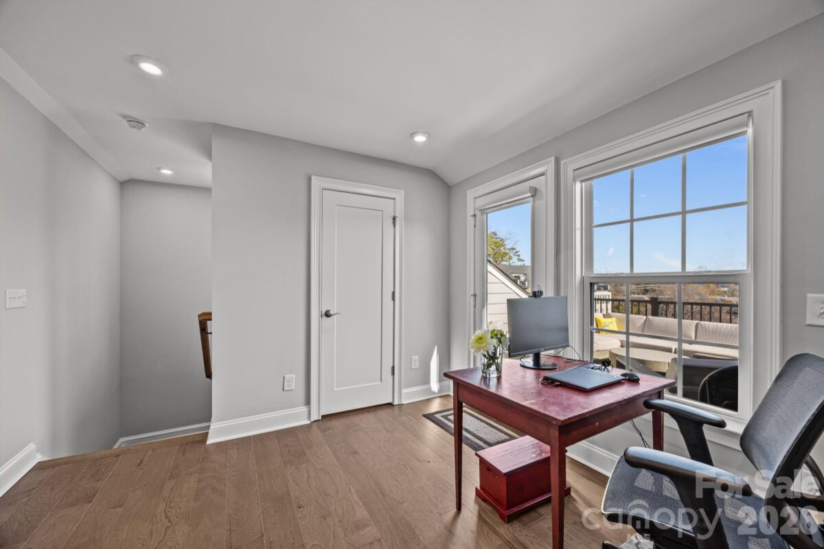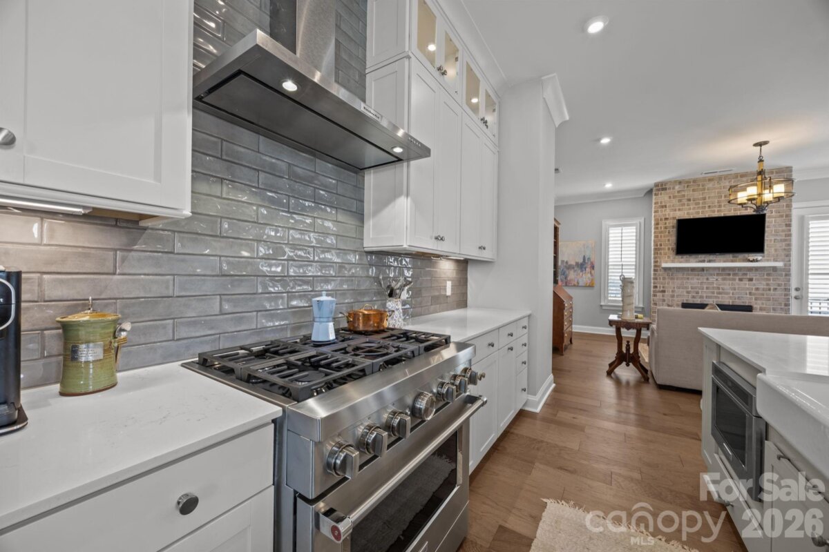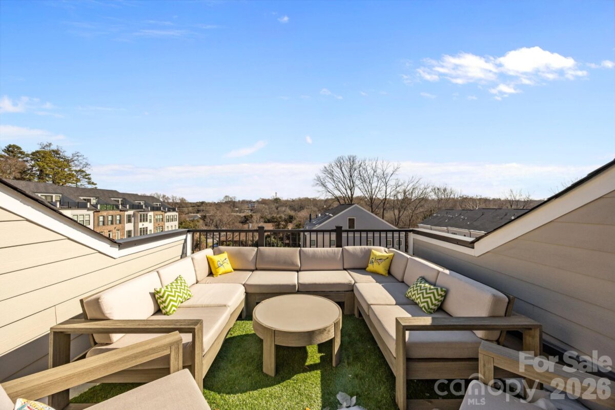 This end-unit, street-facing townhome, ideally positioned in a tucked away community with sidewalks on the corner of Emerson and Kenmore, offers an opportunity to call the Elizabeth neighborhood home. Meticulously maintained and thoughtfully upgraded by the original owner, the home shows like new and reflects exceptional care throughout. The ground-level foyer welcomes you to a private guest suite or flexible space ideal for a home gym or office, complete with a full bathroom and access from both the covered front entrance and the attached two car garage. The main living level features 10-foot ceilings, crown molding, and upgraded hardwood flooring throughout. The chef’s kitchen is equipped with KitchenAid stainless steel appliances, a 36" gas cooktop, quartz countertops, and an oversized island with seating. Floor-to-ceiling white cabinetry includes glass-front, lighted curio upper cabinets, under-cabinet lighting, pantry storage, and an upgraded tile backsplash. The kitchen opens seamlessly to the dining area and to a cozy living room anchored by a beautiful brick gas fireplace, creating an ideal space for entertaining or relaxing evenings at home. The third level hosts the primary suite, featuring a California Closets walk-in closet and an en-suite bath with a double vanity and glass-enclosed shower. An additional bedroom with a full bath and a conveniently located hallway laundry complete this level. The top floor offers a versatile loft with a half bath, ideal for a home office, media room, or quiet retreat, and opens to a private rooftop terrace. This move-in-ready townhome blends thoughtful design and quality upgrades with an exceptional Elizabeth location, offering easy access to Uptown, Bank of America Stadium, Charlotte Douglas International Airport, Trader Joe’s, restaurants, the Greenway, and major highways. Walk to Plaza Midwood, Myers Park, and Eastover. With plenty of guest parking, your friends will want to gather at this townhome to explore all of what Charlotte has to offer. Please see the features sheet for a complete list of upgrades and features (plantation shutters, smart home, hardwood floors, farm sink, washer/dryer included, upgraded shelving...).