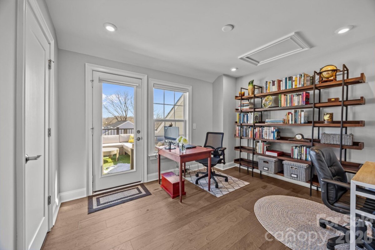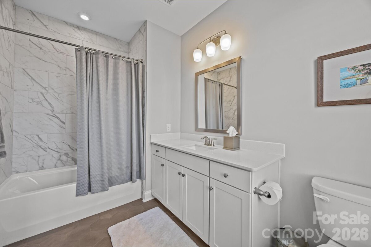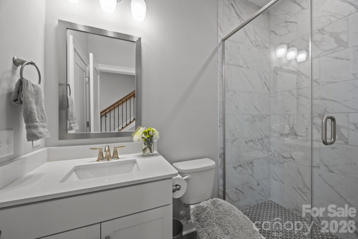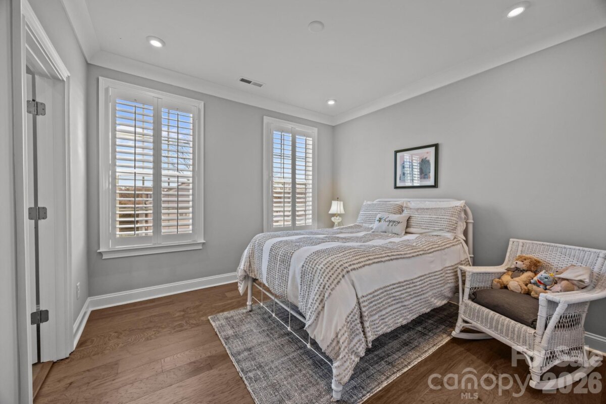 This end-unit, street-facing townhome, ideally positioned in a tucked away community with sidewalks on the corner of Emerson and Kenmore, offers an opportunity to call the Elizabeth neighborhood home. Meticulously maintained and thoughtfully upgraded by the original owner, the home shows like new and reflects exceptional care throughout. The ground-level foyer welcomes you to a private guest suite or flexible space ideal for a home gym or office, complete with a full bathroom and access from both the covered front entrance and the attached two car garage. The main living level features 10-foot ceilings, crown molding, and upgraded hardwood flooring throughout. The chef’s kitchen is equipped with KitchenAid stainless steel appliances, a 36" gas cooktop, quartz countertops, and an oversized island with seating. Floor-to-ceiling white cabinetry includes glass-front, lighted curio upper cabinets, under-cabinet lighting, pantry storage, and an upgraded tile backsplash. The kitchen opens seamlessly to the dining area and to a cozy living room anchored by a beautiful brick gas fireplace, creating an ideal space for entertaining or relaxing evenings at home. The third level hosts the primary suite, featuring a California Closets walk-in closet and an en-suite bath with a double vanity and glass-enclosed shower. An additional bedroom with a full bath and a conveniently located hallway laundry complete this level. The top floor offers a versatile loft with a half bath, ideal for a home office, media room, or quiet retreat, and opens to a private rooftop terrace. This move-in-ready townhome blends thoughtful design and quality upgrades with an exceptional Elizabeth location, offering easy access to Uptown, Bank of America Stadium, Charlotte Douglas International Airport, Trader Joe’s, restaurants, the Greenway, and major highways. Walk to Plaza Midwood, Myers Park, and Eastover. With plenty of guest parking, your friends will want to gather at this townhome to explore all of what Charlotte has to offer. Please see the features sheet for a complete list of upgrades and features (plantation shutters, smart home, hardwood floors, farm sink, washer/dryer included, upgraded shelving...).