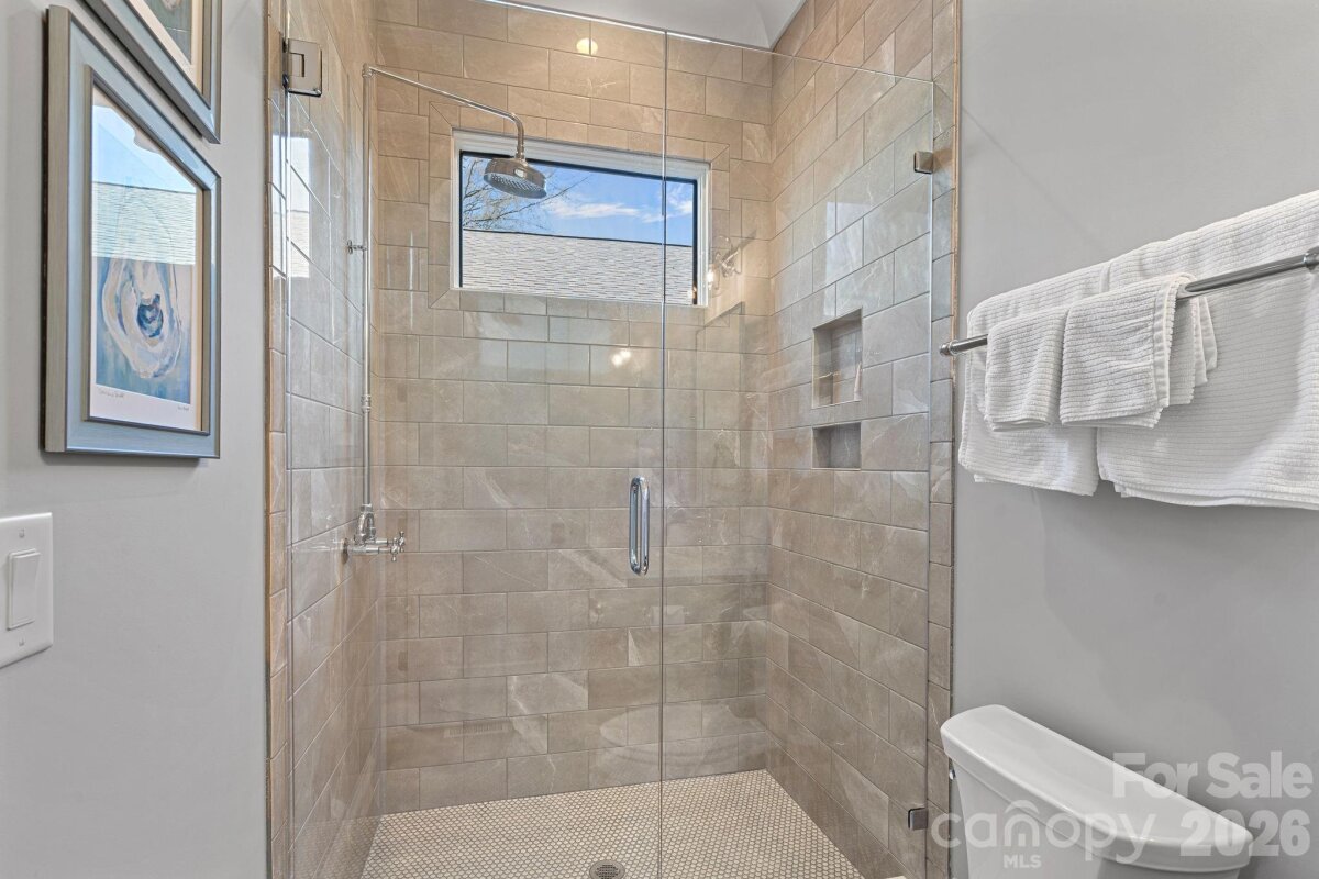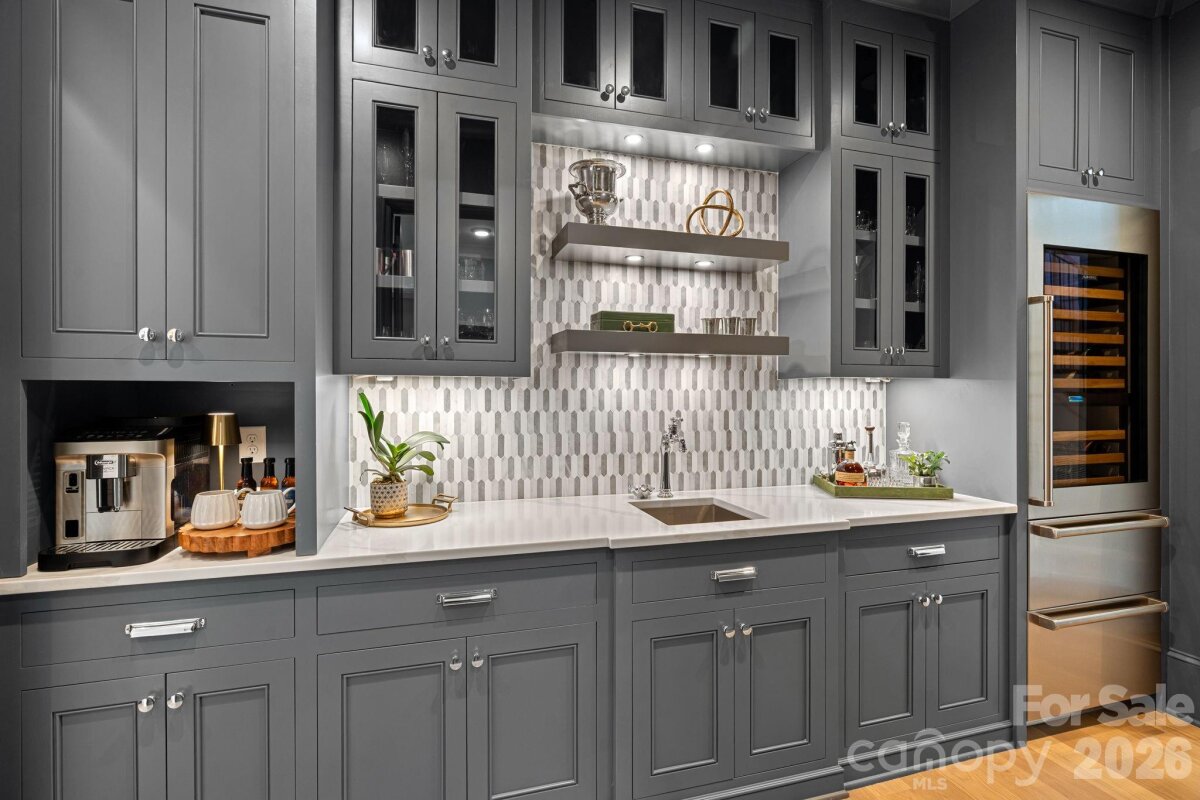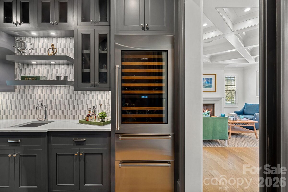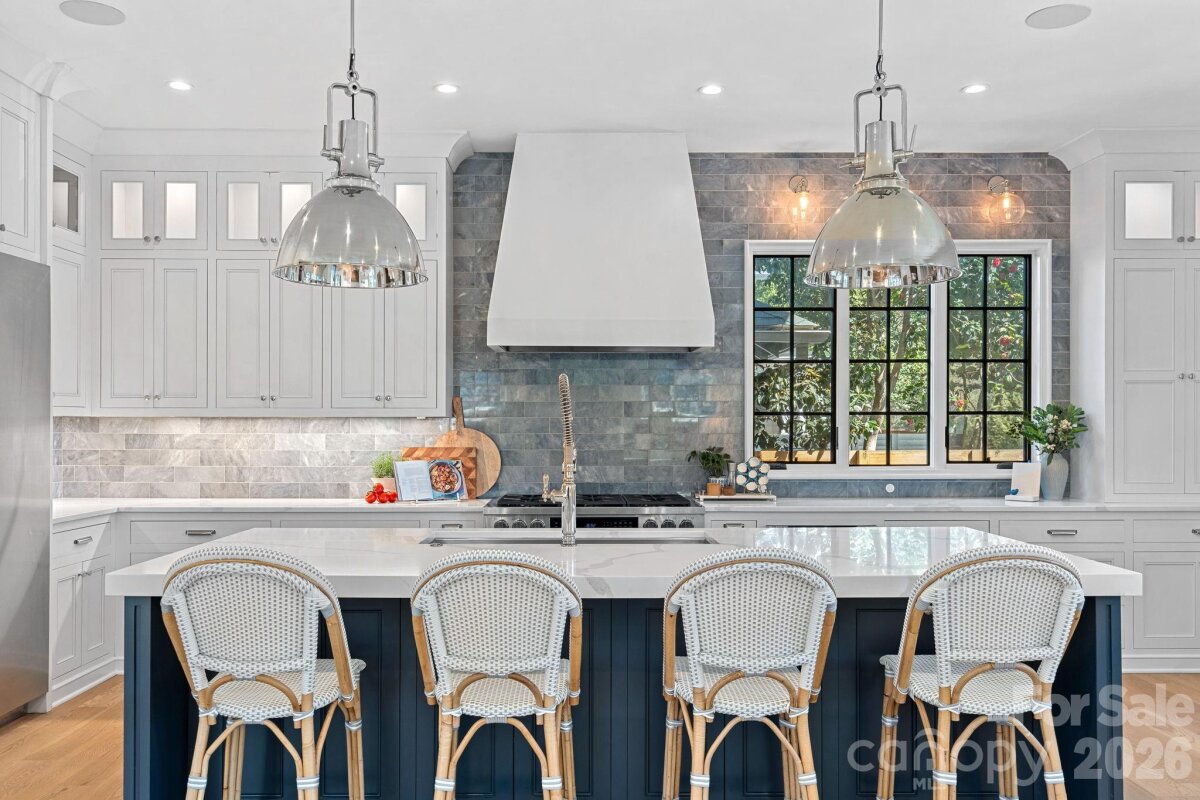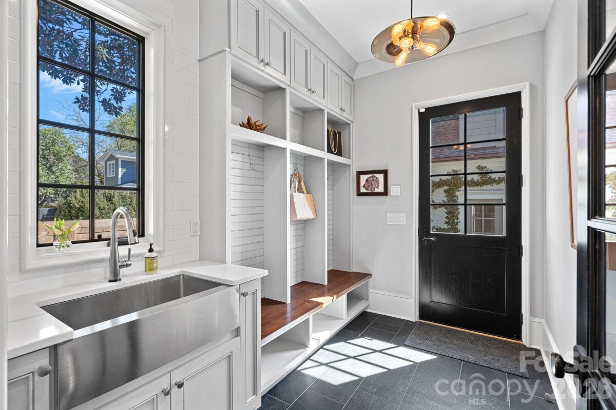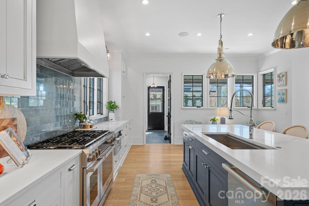 Stunning newer construction with timeless charm in the vibrant and historic Elizabeth neighborhood! Situated on a beautiful corner lot just minutes to Uptown, this light-filled home offers an exceptional open floor plan with refined architectural details throughout. Newly refinished wide-plank, white oak floors, coffered ceiling, intricate moldings, custom designer lighting and three fireplaces create a warm, sophisticated atmosphere. The main level flows seamlessly from the elegant living room to the dining room highlighted by a designer chandelier and dramatic floor to ceiling windows and extends to the great room. A main-level guest suite or private study features custom built-in shelving, detailed moldings, and a full en-suite bath. The luxury chef's kitchen boasts extra thick quartz countertops, an oversized center island with bar seating, custom white cabinetry, a built-in Dacor refrigerator and 6 burner gas range with custom hood, tile backsplash, under cabinet lighting, breakfast room & walk-in pantry. Convenient mud room off kitchen includes stainless steel sink, built-in cabinetry with cubbies and door leading to backyard. Bar area offers built-in SubZero beverage refrigerator with wine cooler and refrigerated drawers, decorative tile backsplash, custom glass-front cabinetry, floating shelves and coffee station. Great room features gas center fireplace with slate surround and shiplap detail above mantle, built-in cabinetry and integrated speakers. Cascading stacking sliding doors open to covered flagstone porch with retractable screen, ceiling heaters and a gas fireplace- perfect for year-round indoor-outdoor living. An enormous walk-in closet under the staircase provides abundant storage and houses the whole-house Savant smart home system plus a new whole house water filtration system. Dramatic grand staircase with wrought iron railings leads to the second level featuring primary suite, two secondary bedrooms with en-suite baths, incredible spacious laundry room with sink and built-in cabinetry and a versatile loft space. The impressive primary suite offers a sitting area and vaulted ceiling with shiplap accents, custom chandelier and pendant lights over nightstands. The luxurious spa-like primary bath includes oversized marble walk-in shower wi/ dual shower heads plus rain shower head, soaking tub, dual vanities with quartz countertops, custom chandelier and vanity lighting, spacious walk-in closet w/ built-in organization system. The detached 2 car garage is a rare gem for this area and provides over 400+ square feet of additional living space above complete with kitchenette and full bath- ideal for home office, nanny or guest suite, gym or flexible living space! The professionally landscaped backyard is fenced and gated and includes full yard irrigation. All of this within 5 minutes of Uptown and walking distance to some of Charlotte's most coveted restaurants and amenities!