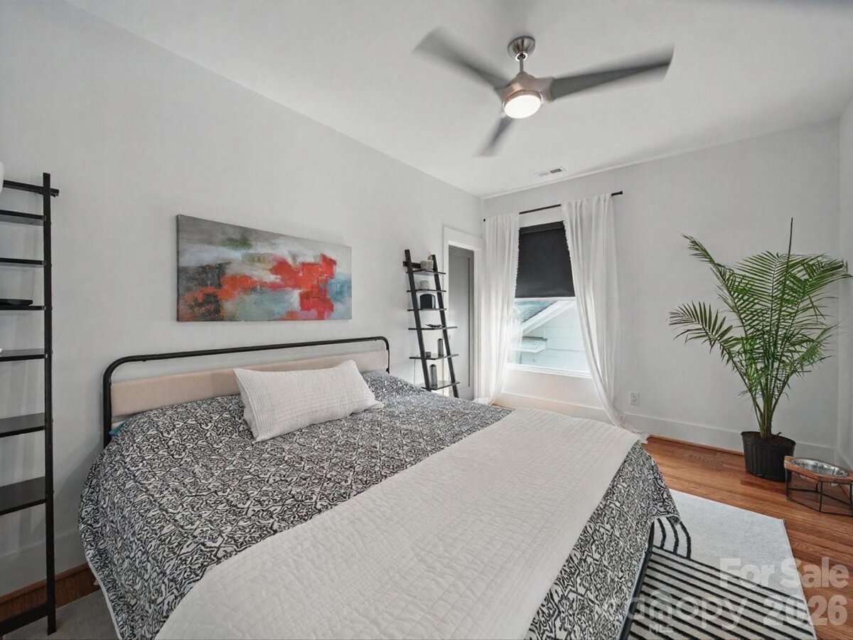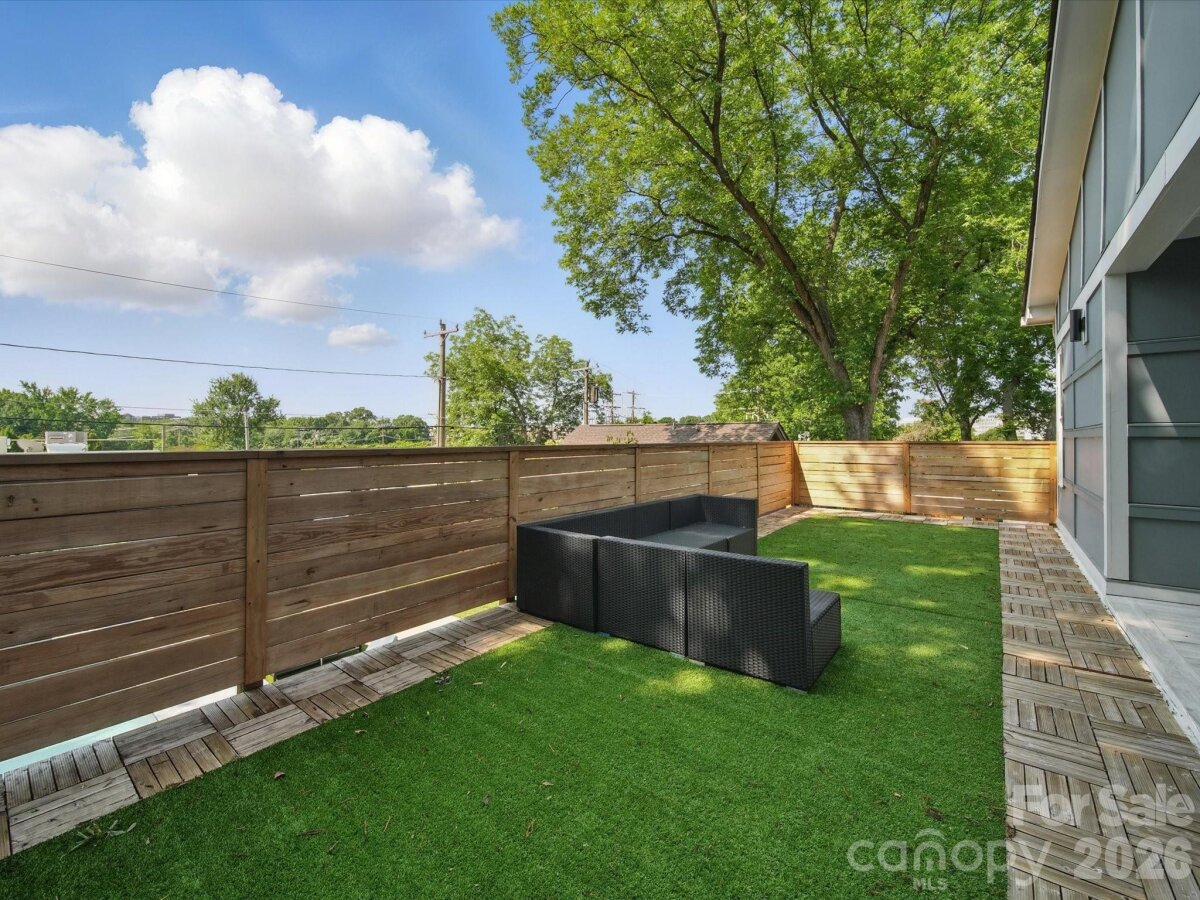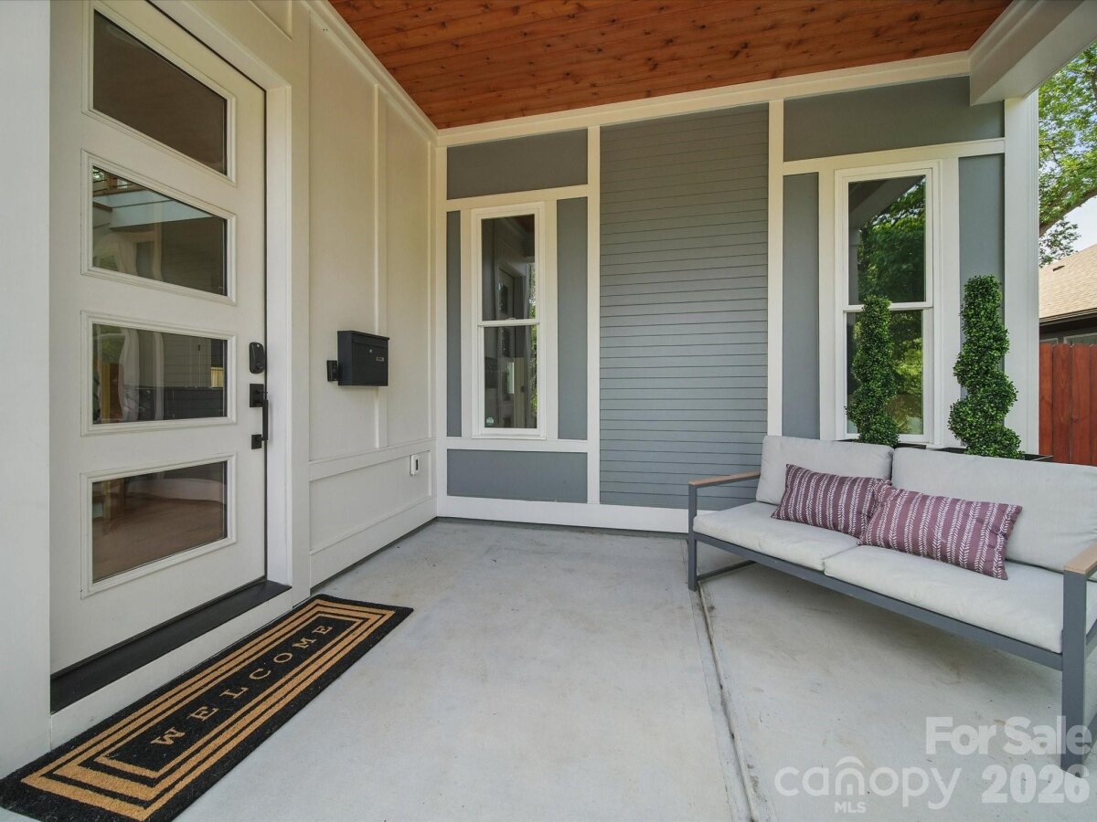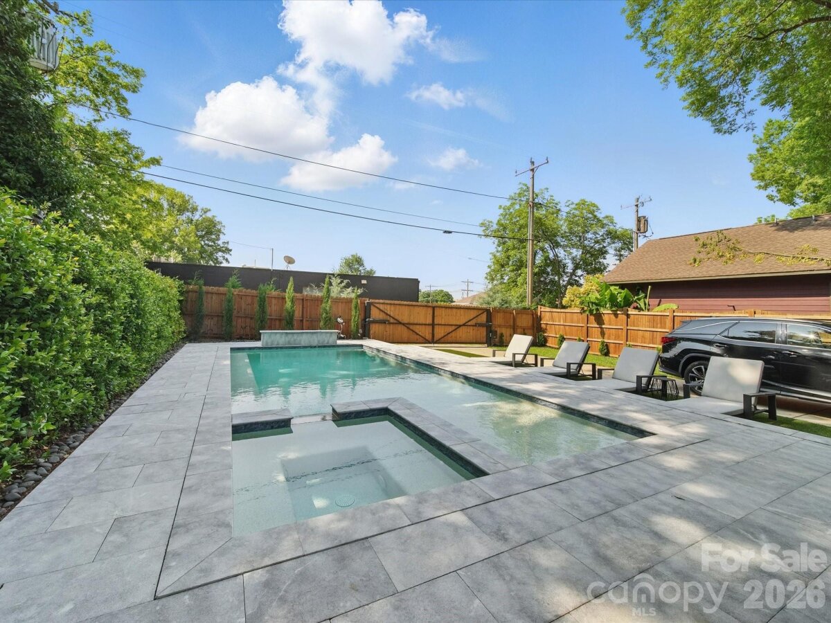 Heated saltwater pool. Walking distance to the restaurants, bars, and coffee shops of Midwood and Elizabeth. That combination rarely comes available — and this modern 2020 build delivers with the scale and design to match: 5BR/4.5BA, 3,800+ sq ft, soaring ceilings, and clean contemporary finishes throughout. The main level opens into a light-filled, high-ceilinged living and kitchen space that flows directly to a covered patio and travertine pool deck. The kitchen is serious: 48" gas range, column fridge/freezer, waterfall quartz island, and a walk-in pantry. A main-level guest suite handles guests, in-laws, or a dedicated home office with ease. A half bath off the pool and built-in gas grill line round out the outdoor living setup. Upstairs, the primary suite offers dual closets, soaking tub, seamless glass shower, and a private terrace. A flexible loft and three additional bedrooms give the floorplan room to breathe. Garage washer/dryer hookups and thoughtful storage throughout. The backyard backs to a quiet neighboring business — no rear neighbors, just privacy and green space around the pool. Little Sugar Creek Greenway (19.5 miles of trails) steps away, Lynx Sunnyside Station within walking distance, and the full breadth of Midwood's dining and shopping at your doorstep — including Sip City, Two Scoops, and Central Coffee just two blocks away. Move-in ready.