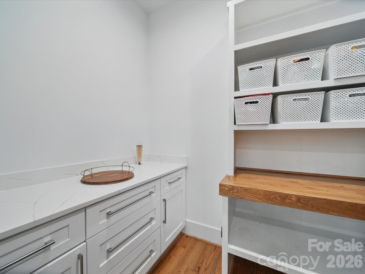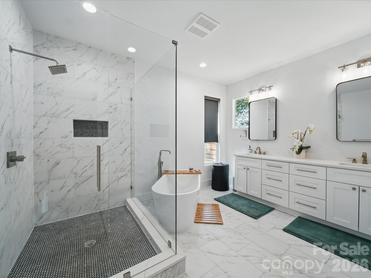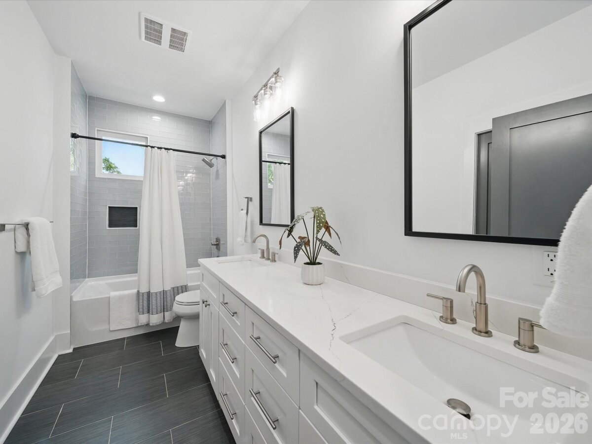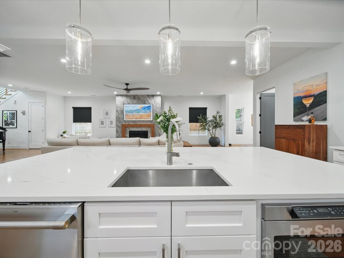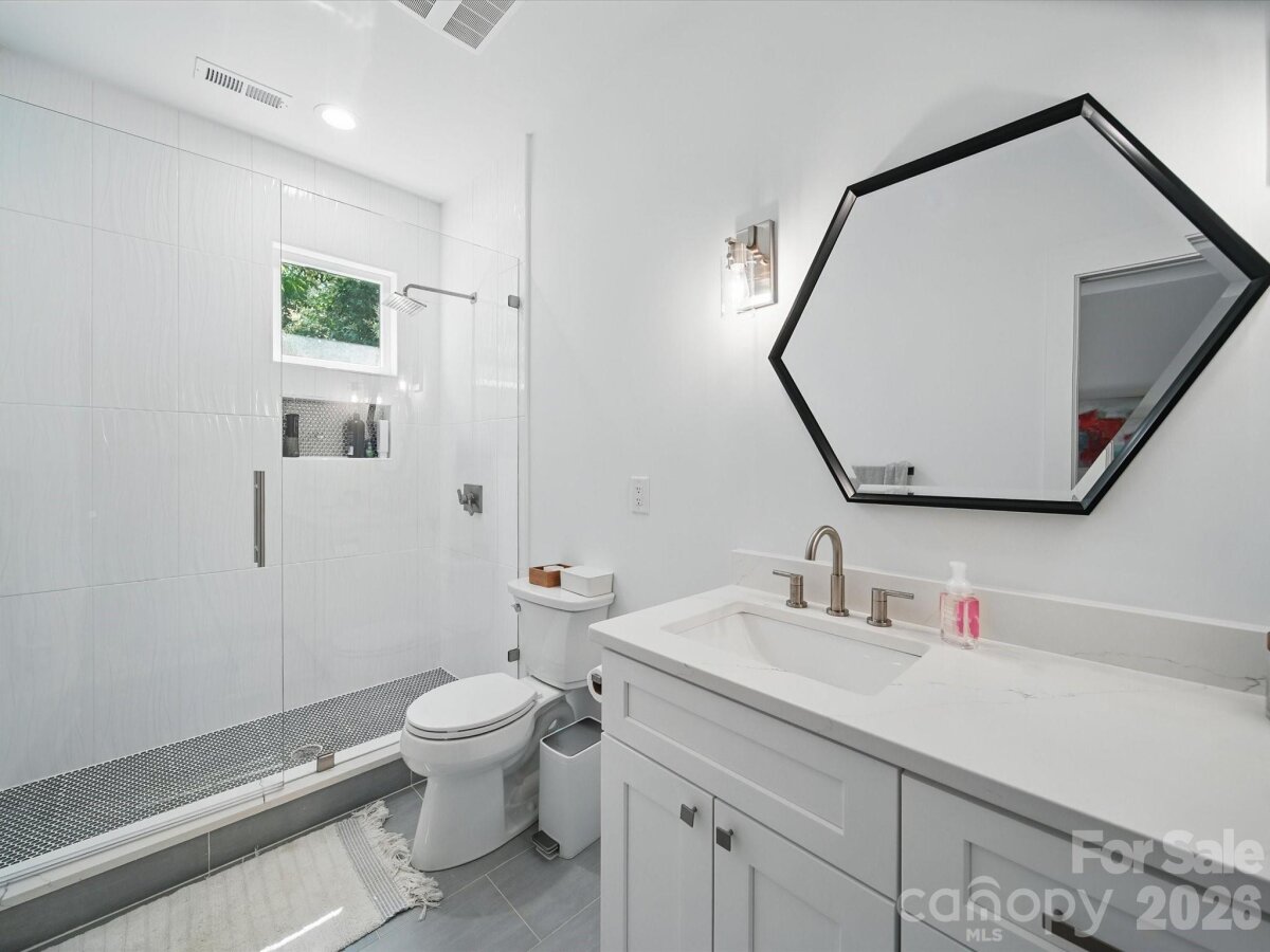 Heated saltwater pool. Walking distance to the restaurants, bars, and coffee shops of Midwood and Elizabeth. That combination rarely comes available — and this modern 2020 build delivers with the scale and design to match: 5BR/4.5BA, 3,800+ sq ft, soaring ceilings, and clean contemporary finishes throughout. The main level opens into a light-filled, high-ceilinged living and kitchen space that flows directly to a covered patio and travertine pool deck. The kitchen is serious: 48" gas range, column fridge/freezer, waterfall quartz island, and a walk-in pantry. A main-level guest suite handles guests, in-laws, or a dedicated home office with ease. A half bath off the pool and built-in gas grill line round out the outdoor living setup. Upstairs, the primary suite offers dual closets, soaking tub, seamless glass shower, and a private terrace. A flexible loft and three additional bedrooms give the floorplan room to breathe. Garage washer/dryer hookups and thoughtful storage throughout. The backyard backs to a quiet neighboring business — no rear neighbors, just privacy and green space around the pool. Little Sugar Creek Greenway (19.5 miles of trails) steps away, Lynx Sunnyside Station within walking distance, and the full breadth of Midwood's dining and shopping at your doorstep — including Sip City, Two Scoops, and Central Coffee just two blocks away. Move-in ready.