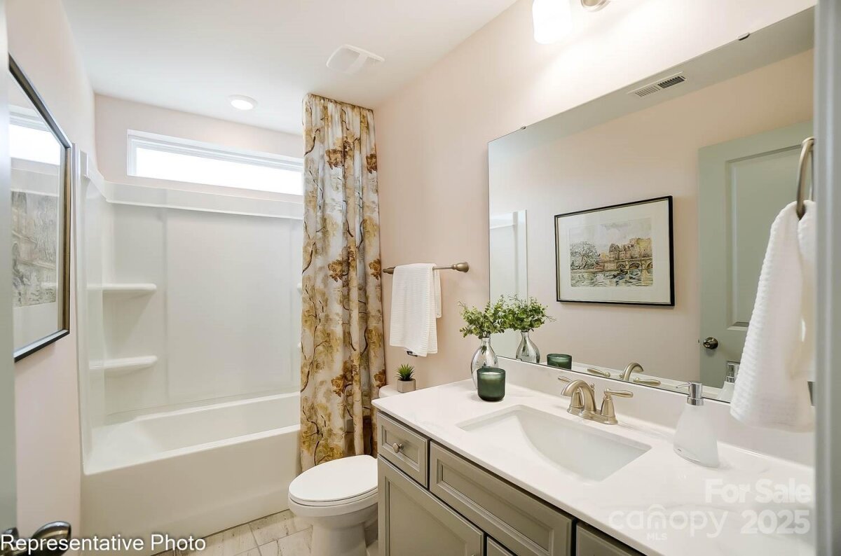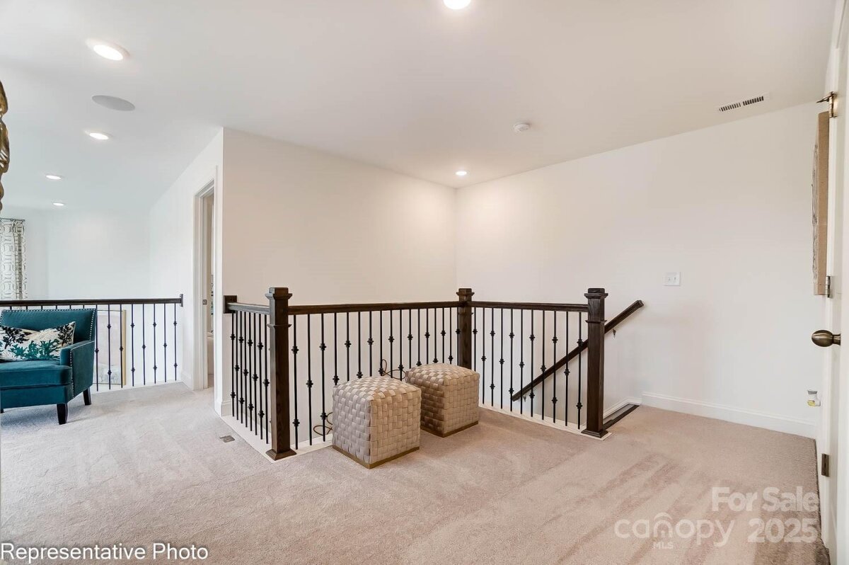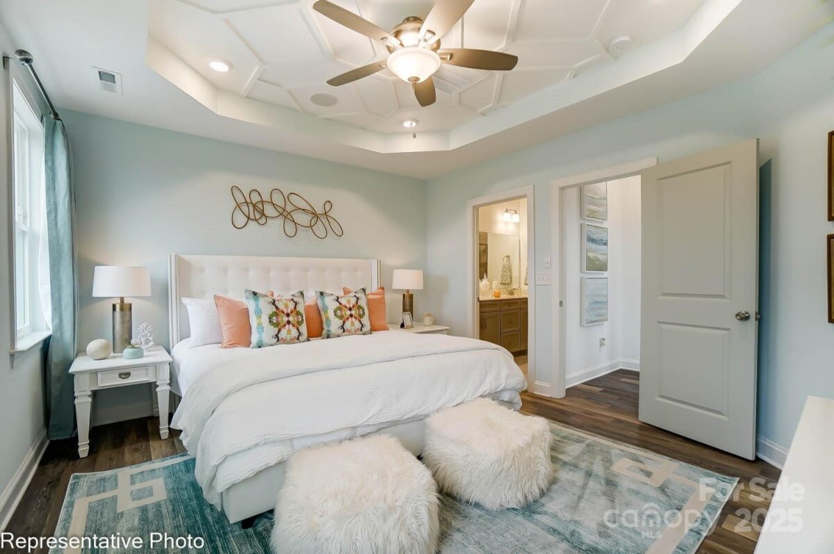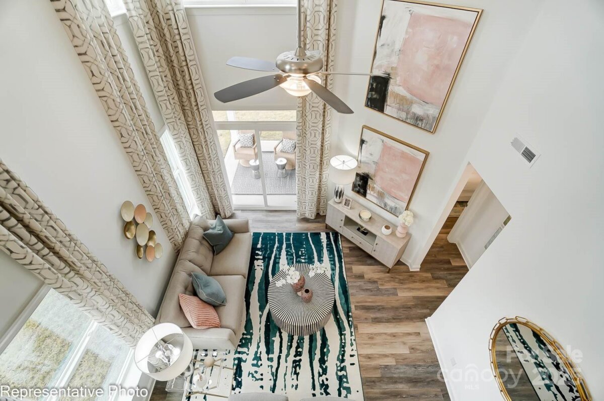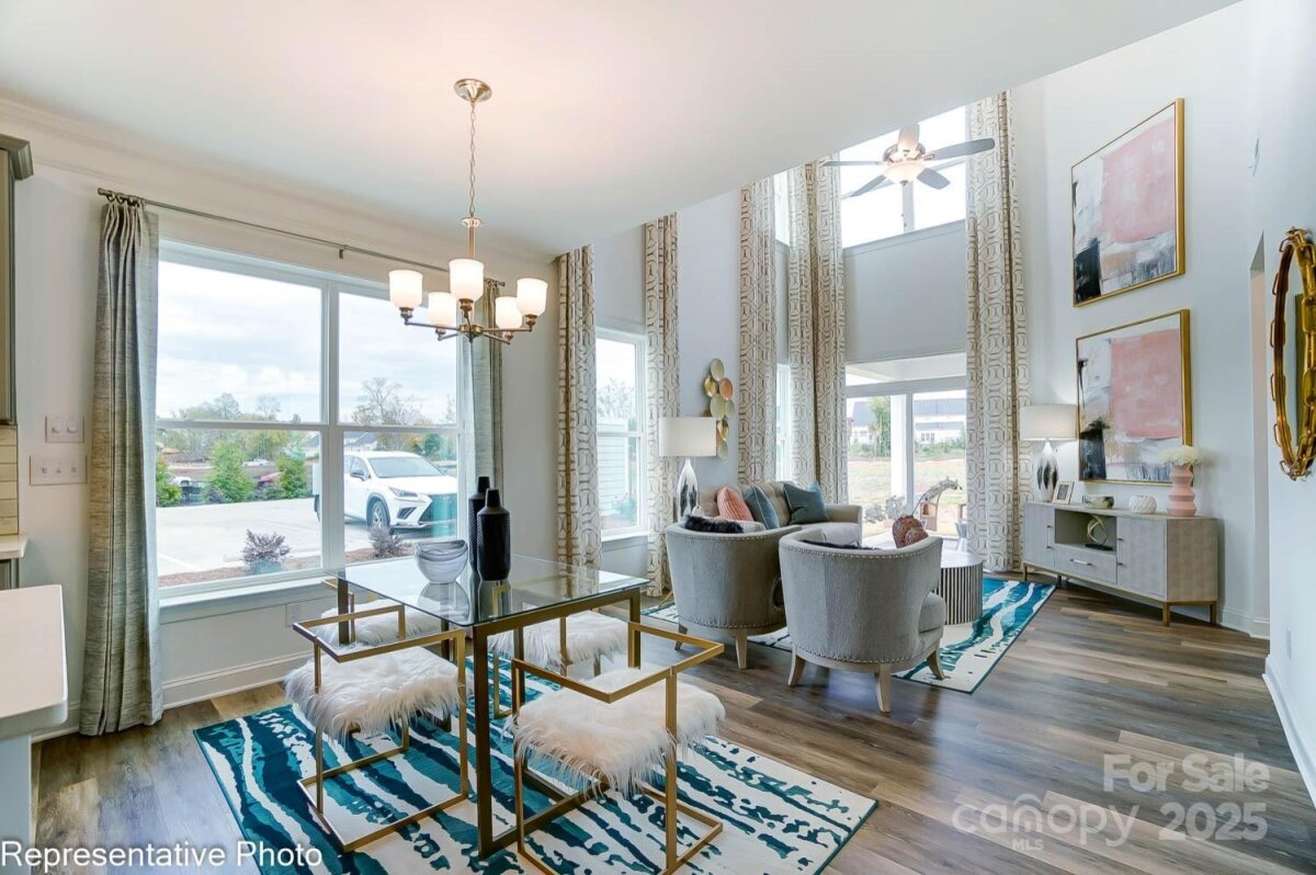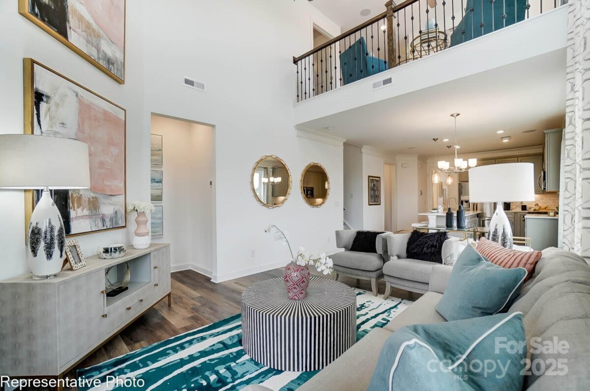 New townhomes in Harrisburg! This end-unit townhome features the primary on the main and a flex/bonus room on the upper floor. The home has a total of 3 bedrooms, 2.5 baths, and more than 1,900 square feet of living space. The kitchen features quartz counters, white cabinets, a tile backsplash, and stainless appliances, including a gas range. The open dining area and family room look out to the rear covered porch. The primary bedroom features a tray ceiling, and the primary bath features a tiled shower with bench seat and a double-sink vanity. The upper floor features a loft overlooking the family room, two additional bedrooms, a full bath, and a finished flex space/bonus room. Community amenities include a dog park, walking trails, a playground, outdoor pool, and cabana.