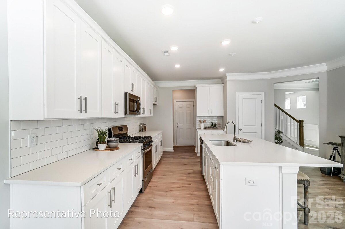 This end-unit Southampton townhome has 3 bedrooms, 2.5 baths, a 2-car garage, and more than 2,000 square feet of living space. The kitchen features Shaker-style, white cabinets, quartz counters, a tile backsplash, and stainless appliances, including a gas range and microwave. Enhanced Vinyl Plank (EVP) flooring runs throughout the main level, which includes the foyer, half bath, family room, mudroom, and kitchen. The primary suite, located on the upper floor, includes a large walk-in closet, and the primary bath features a tiled, luxury shower with semi-frameless door, two separate vanities, and a linen cabinet. The upper floor also features two additional bedrooms, a full bath with tub/shower combo, and a large loft. Other extras include a beadboard drop zone at the garage entry, a tray ceiling in the foyer, and stairs with composite treads & metal balusters. Community amenities include a dog park, walking trails, a playground, outdoor pool, and cabana.