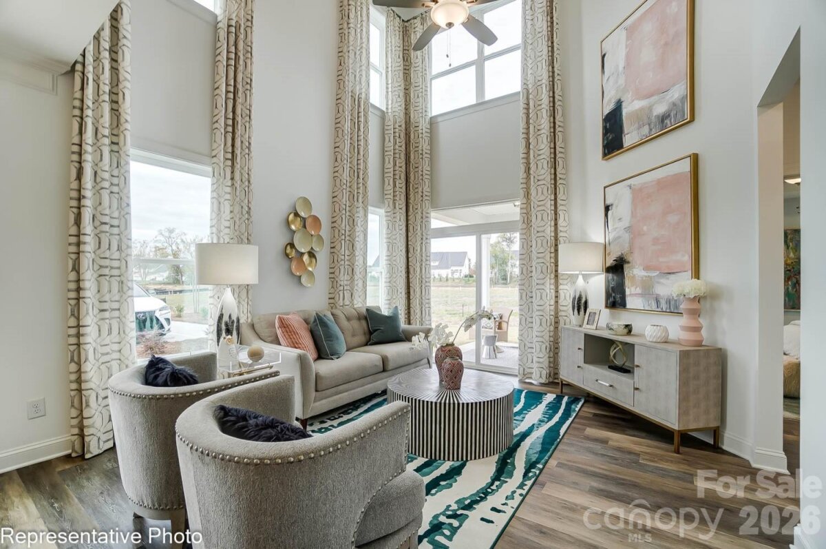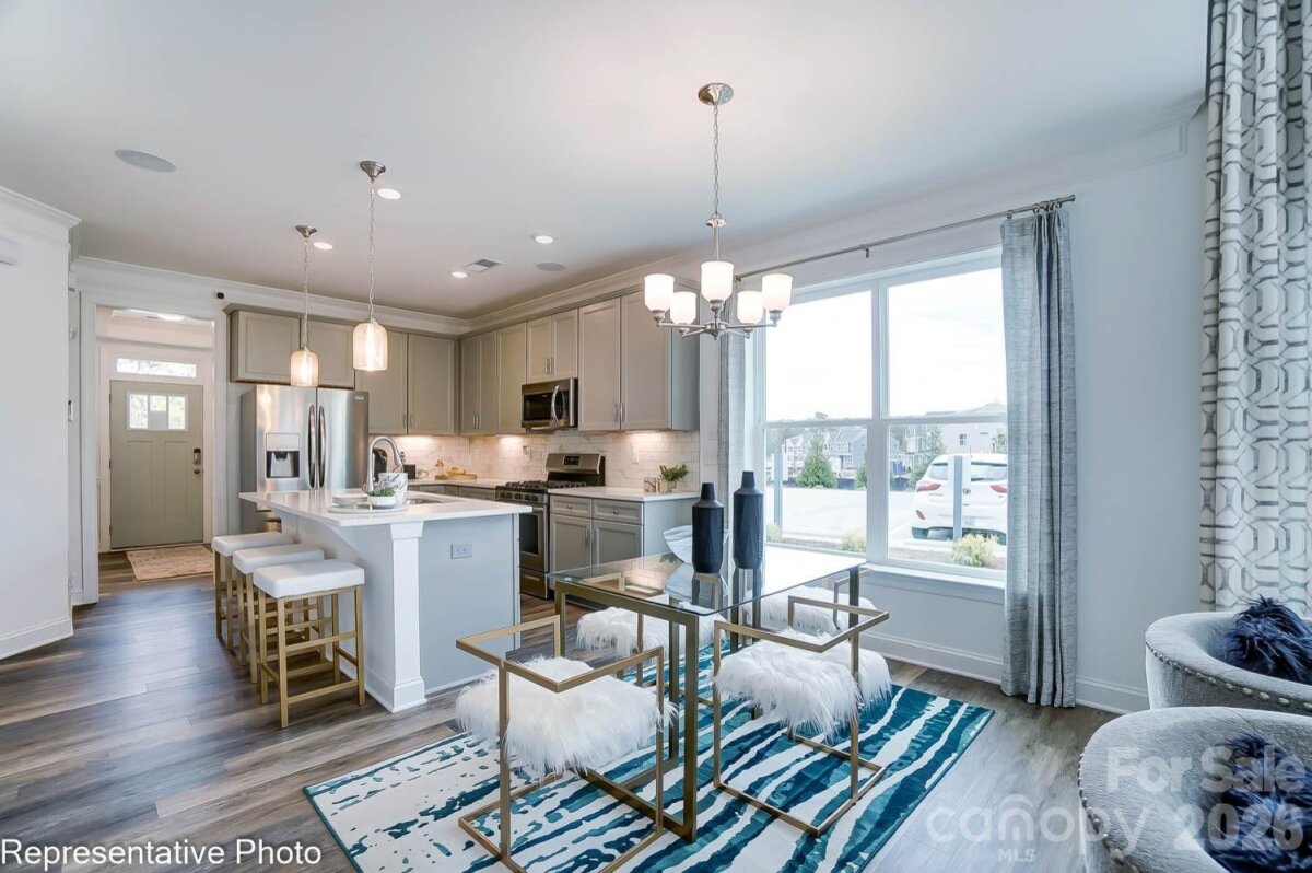 New townhomes in Harrisburg! This end-unit townhome features the primary suite on the main and a flex/bonus room on the upper floor. The home has a total of 3 bedrooms, 2.5 baths, and more than 1,900 square feet of living space. The kitchen features quartz counters, Shaker-style white cabinets, a tile backsplash, and stainless appliances, including a gas range. The open dining area and family room look out to the rear covered porch. The primary bedroom features a tray ceiling, and the primary bath features a tiled shower with bench seat and a double-sink vanity. The upper floor has a loft overlooking the family room, two additional bedrooms, a full bath, and a finished flex space/bonus room. Community amenities include a dog park, walking trails, a playground, outdoor pool, and cabana.