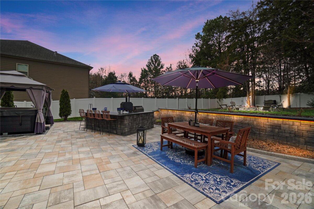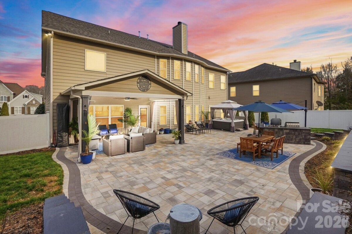 Tucked away on a quiet cul-de-sac in sought-after Kellswater Bridge, this exceptional 4-bedroom, 3-bath home offers over 4,400 square feet of thoughtfully designed living space built for both grand entertaining and everyday comfort. From the moment you arrive, the long driveway, covered front porch, and beautiful curb appeal set the tone. The two-car garage features sealed floors and an electric vehicle charging hookup, blending style with modern convenience. Step inside to a dramatic two-story foyer with soaring ceilings and an immediate sense of scale. A private study and formal dining room, both accented with coffered ceilings, create refined spaces for work and hosting. A main-level guest bedroom with full bath offers ideal flexibility for visitors or multi-generational living. The heart of the home is the expansive living area anchored by a striking stone fireplace, seamlessly flowing into a chef’s kitchen designed to gather. An oversized island with abundant seating, double ovens, walk-in pantry, and generous prep space make entertaining effortless and inviting. Then step outside and the experience continues. The fully fenced backyard is truly an entertainer’s retreat with a $100k renovation completed in late 2024. A large paved patio offers multiple covered living spaces, including a lounge area with mounted TV and a separate covered hot tub area. The outdoor kitchen, stunning stone fire pit, and extensive custom landscape lighting create an unforgettable setting that comes alive in the evening. This backyard was built for long nights and lasting memories. Upstairs, you’ll find a spacious renovated laundry room, two secondary bedrooms, a full bath, and an oversized flex space perfect for a game room, home theater, gym, or playroom. The primary suite serves as a private retreat with impressive proportions, dual walk-in closets, and a spa-like bath featuring a soaking tub and walk-in shower. Built in 2014 with upgraded lighting, flooring and paint throughout. This home also offers access to Kellswater Bridge’s premier HOA amenities including, cable and internet, pool, clubhouse, fitness center, tennis courts, basketball court, volleyball court, picnic area, dog park, walking trails, sidewalks, and street lights. This is more than a home it’s a lifestyle designed for gathering, relaxing, and living beautifully.