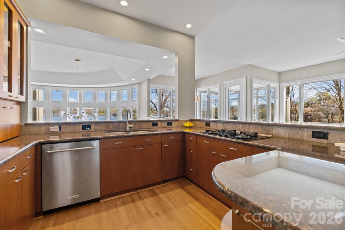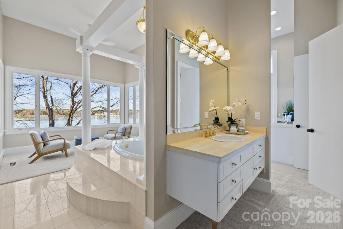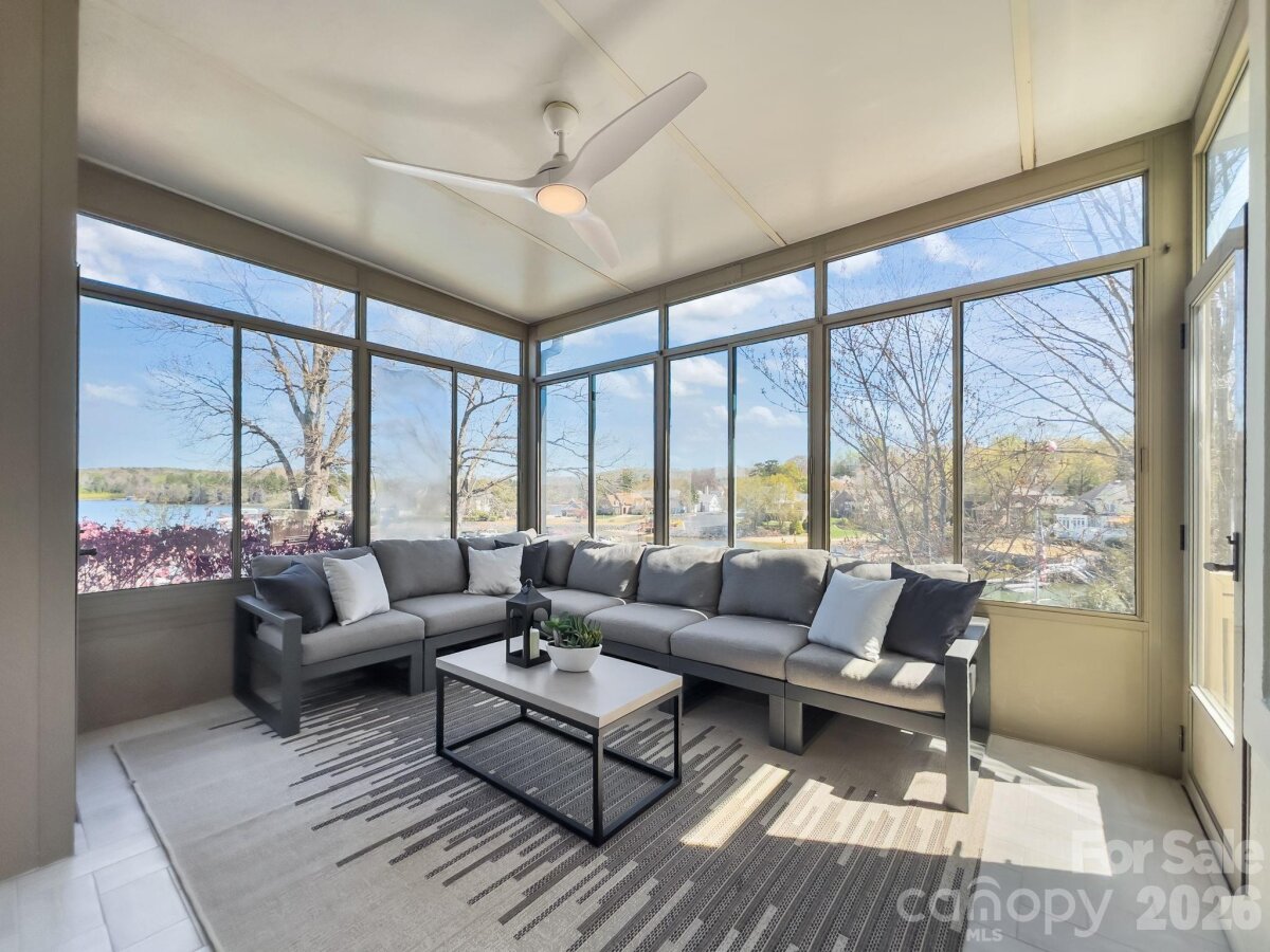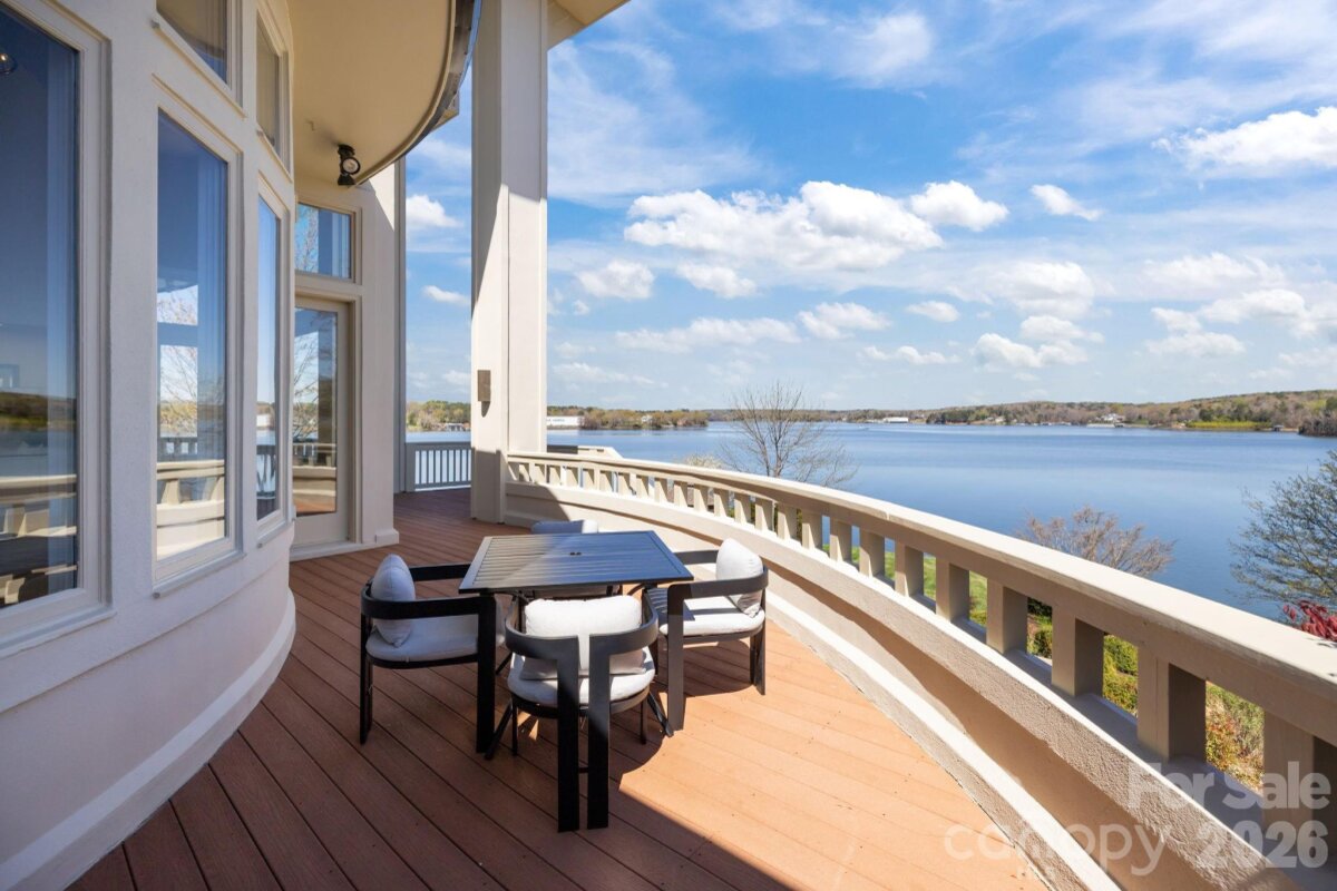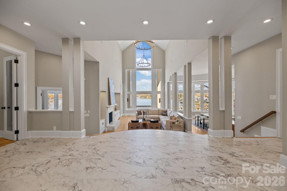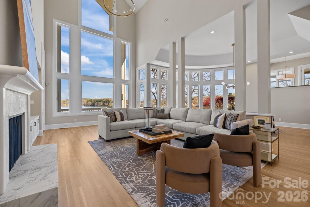 With 400 feet of shoreline, this luxury waterfront estate offers a breathtaking uninterrupted 270° panorama across Lake Wylie. The elevated yet usable lot of approximately one acre delivers sweeping views and added privacy while preserving comfortable outdoor living and a well-manicured yard. A custom solid mahogany carved entryway sets the tone as you step inside, drawing your eye through the great room to the water beyond. Designed to entertain, over 5,000 sq ft residence blends openness and ease with sophistication and comfort. It features 4 bedrooms and 5.5 baths. The great hall anchors the home with quiet drama. It showcases 27-foot cathedral ceilings, a reimagined herringbone marble fireplace, and long sightlines that keep the lake front and center. Recent updates add modern clarity: refinished hardwoods, a softened designer palette, elevated lighting, and finishes that respect the home’s original character. Highlights include custom solid wood garage doors, a three-car garage with epoxy floors, new gutters, fresh interior and exterior paint, and new carpet throughout the upper level and primary suite. Outdoor living is effortless. Completed in 2024, the custom floating dock is built with premiere grade Corning brand WearDeck on a marine-grade aluminum frame and is connected by a new gangway. The private dock fully accommodates vessels 28 to 38 feet in length and supports a substantial draft. Enjoy sunrise to sunset on the wrap-around porch, where wide water views frame every gathering. Critical improvements are already complete, allowing you to focus on bringing your own style and vision. A new architectural roof, updated HVAC systems, comprehensive window and exterior enhancements, and whole-home updates provide uncommon ease and confidence. Located in Riverpointe, one of Lake Wylie’s most established waterfront communities, residents enjoy a private marina, pool, tennis courts, and trails, all just minutes from the energy and convenience of Charlotte. This is more than a lake house. It is a waterfront estate for those who value perspective, connection, and a beautiful way of living.