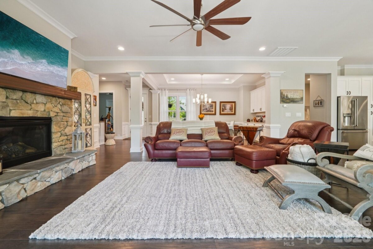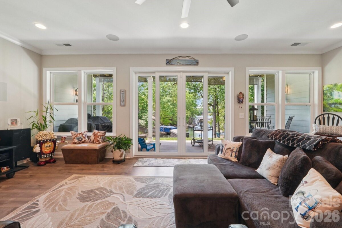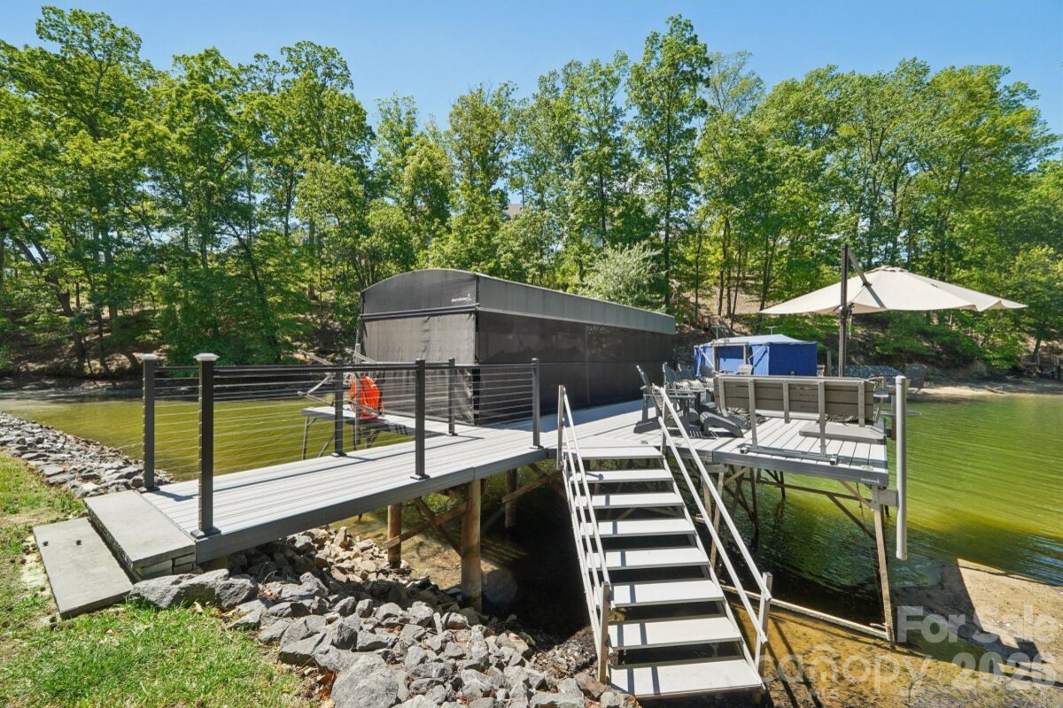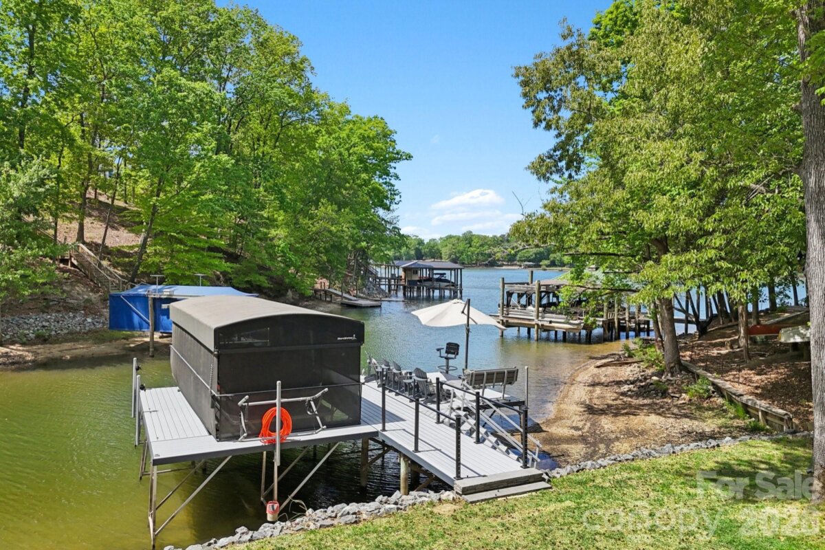 Welcome to resort-style living on the shores of Lake Wylie! This stunning lakefront masterpiece was thoughtfully positioned on the lot to maximize breathtaking sunset and lake views. With a spacious, open floorplan and upgrades too numerous to list, this move-in ready home on a cul-de-sac is the one you've been waiting for. The main level welcomes you with soaring ceilings, a grand great room anchored by a beautiful fireplace, and sweeping views that draw you straight to the oversized porch — the perfect place to unwind year-round. The gourmet chef's kitchen is an entertainer's dream, featuring a massive island, GE Café premium appliances, soft-close cabinetry throughout, under-cabinet lighting, and a walk-in pantry. The main-level primary suite is a true retreat, showcasing bay windows perfectly framed to capture the lake views, ensuite bath with double sinks and vanities, a separate soaking tub and shower, a private water closet, and a generous walk-in closet, all with a conveniently connected laundry room. A dedicated main-level office with closet, a guest bedroom with full bath, an additional half bath for guests, and a drop zone entry from garage round out the main level living areas. Downstairs, you'll forget you're in a basement — because this is truly a second living quarters. Featuring tall ceilings, a 2nd primary suite, an open living area, a fully equipped kitchenette (GE Café fridge, sink & island), a fully furnished wine room with double coolers, a 4th bedroom with a massive walk-in closet, a 4th full bath, a full surround sound system, a walk out patio, and large finished storage — it's a home within a home. Step outside to your private waterfront paradise. The low-maintenance aluminum dock features a solar-powered boat lift and cover with lighting, paddleboard/kayak storage, fishing chairs, bench, and umbrella for shade. Deeper water accommodates a wide variety of boats and watercraft. Unwind at the sandy beach area with a firepit and adirondack chairs — the ultimate lakeside retreat. A tri toon boat (under 100 hrs, 4 yrs old) is available for separate purchase. Additional highlights include built-in porch speakers, programmable landscape lighting, up-lighting on trees, Leafguard gutters, bay windows on upper and lower levels for extended lake views, and a radon mitigation system. Pristine curb appeal, lush surroundings, and easy dock access complete this one-of-a-kind offering. Perfectly situated for both lakefront serenity and everyday convenience, 17914 Culross Lane offers the best of both worlds. Golf enthusiasts will love the proximity to The Palisades Country Club, while the charming communities of Tega Cay and Fort Mill are just minutes away — offering an abundance of shopping, dining, and everyday amenities. Easy access to major corridors makes commuting to Uptown Charlotte and beyond a breeze, all while coming home to your own private lakeside paradise on Lake Wylie. Welcome home!