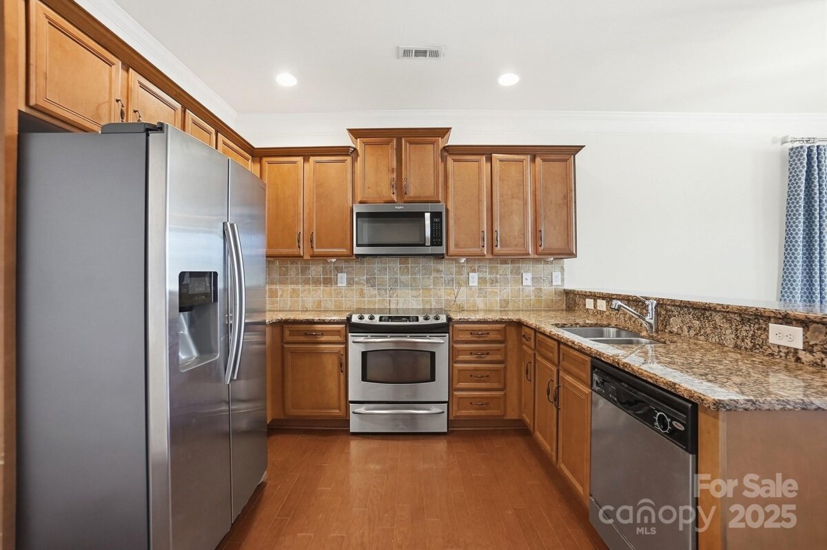 Beautiful all brick end unit in highly sought-after Brighton Park with a floor plan that checks all the boxes. The main level offers a primary bedroom with an updated en-suite bath and a convenient stackable laundry area. The kitchen and living areas feature hardwood floors, granite countertops, stainless steel appliances, and abundant windows that fill the home with natural light. Upstairs you will find two additional bedrooms connected by a Jack and Jill bathroom, along with a second laundry area on the upper level for added convenience. Outside, enjoy a private fenced patio ideal for relaxing or entertaining, with direct access to the detached two-car garage. Brighton Park offers a central location close to shopping, dining, and everyday conveniences, with quick access to I-485 for an easy commute into Uptown Charlotte and surrounding areas.