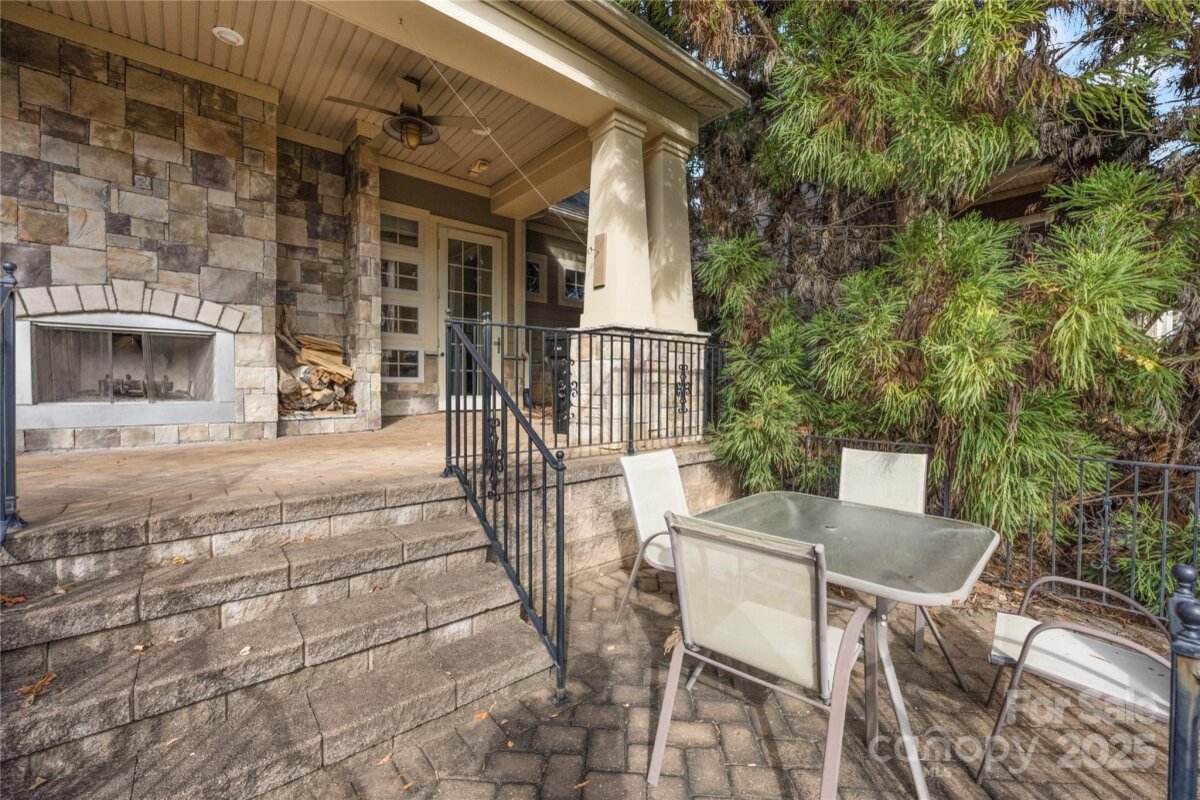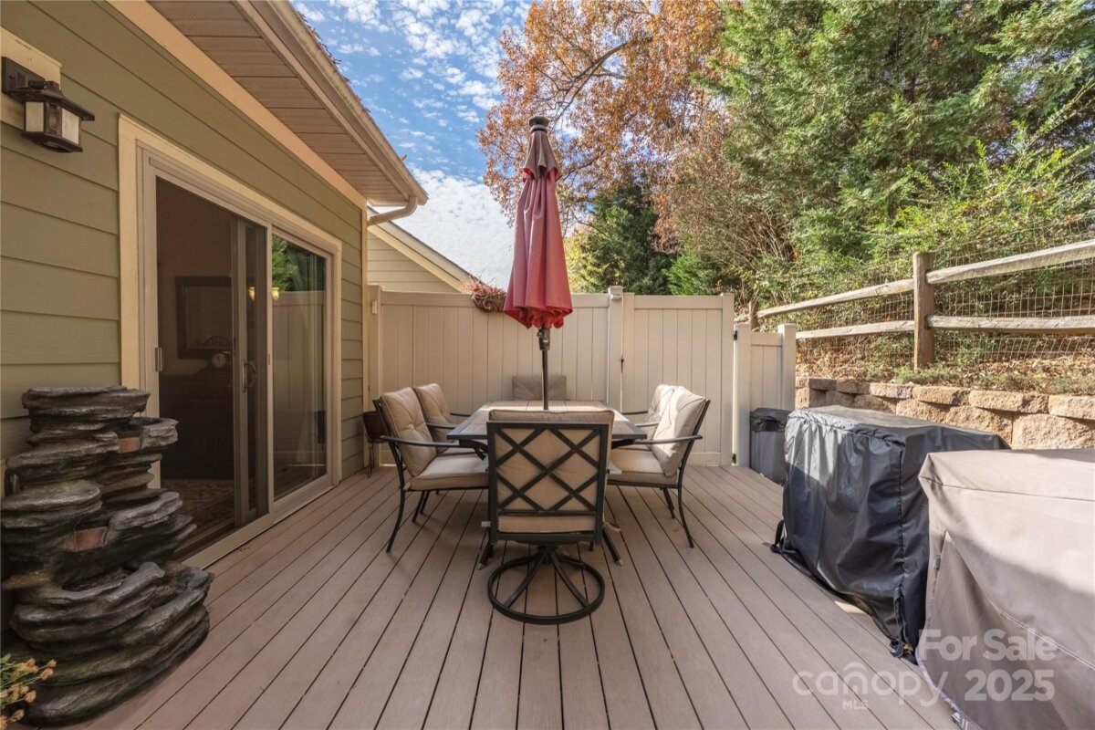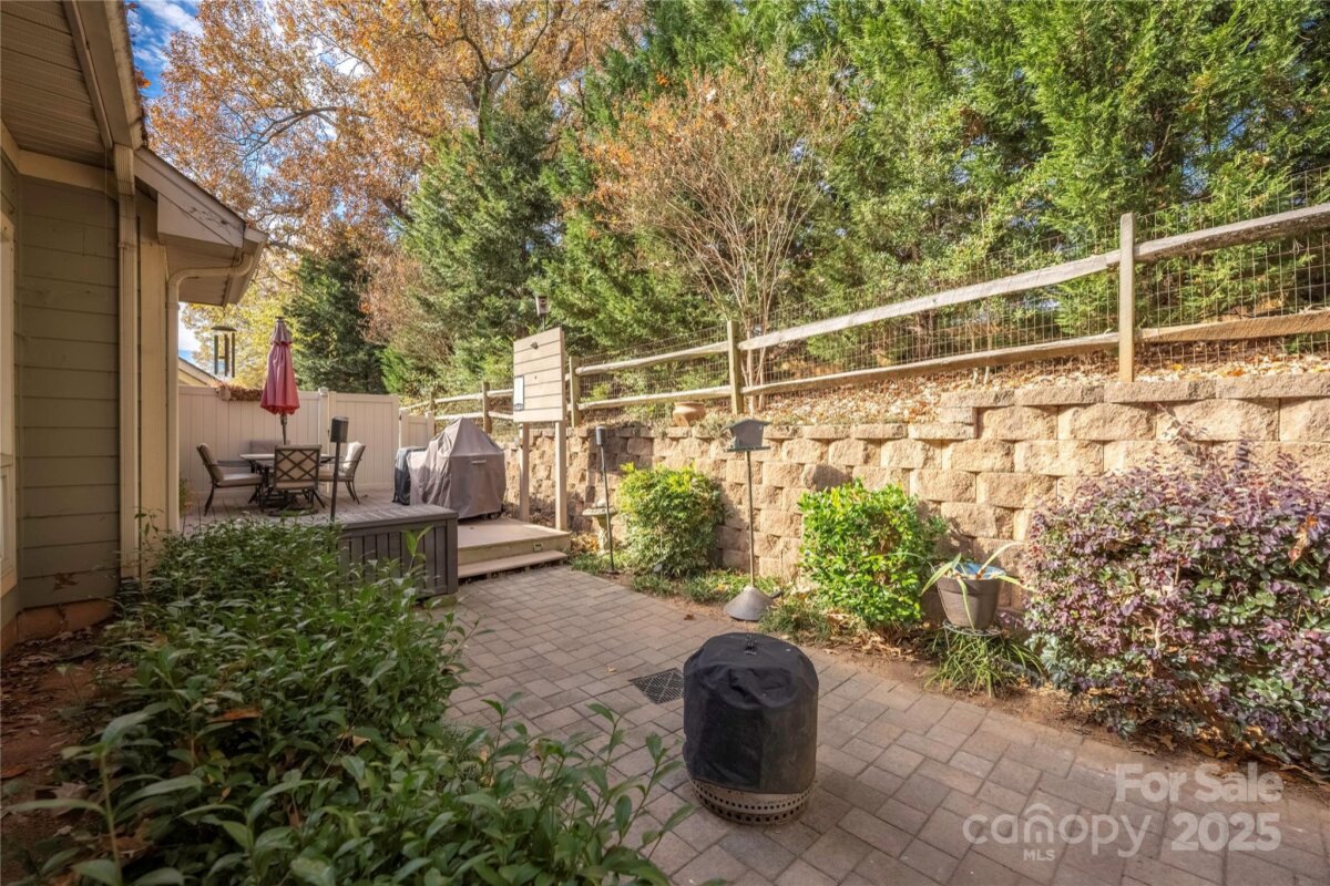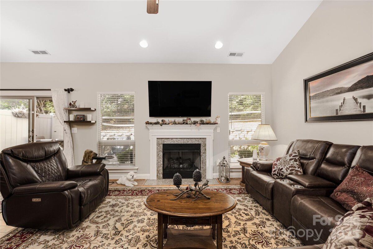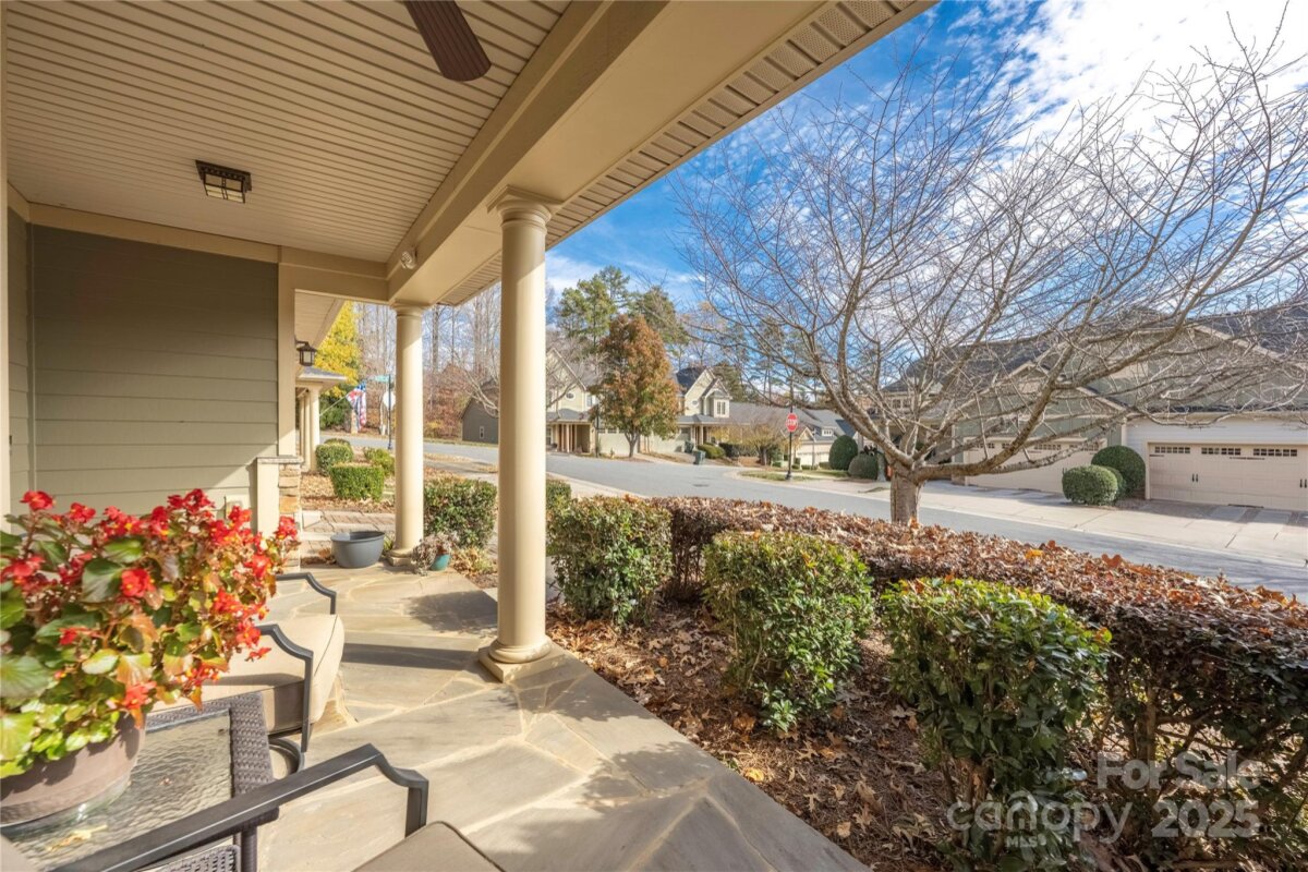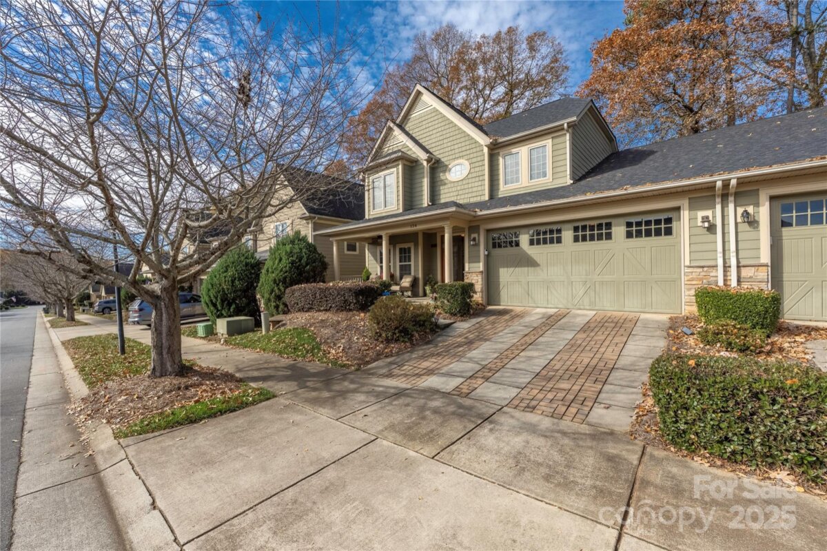 Quality Craftsman-style duet townhome featuring a hard-to-find main-level Primary Bedroom En suite and attached 2-car garage. This former model, end unit home was built with upgraded finishes, detailed crown molding, and hardwoods throughout the main level. A rocking-chair front porch with flagstone sets a welcoming first impression. Inside, the foyer opens to a versatile office/flex room with French doors. The open-concept kitchen includes recently updated Gallery stainless steel appliances, granite counters, ample pantry space with custom storage, and a functional layout ideal for everyday living. The kitchen flows into the vaulted two-story great room with gas-log fireplace and adjoining dining area. New Andersen sliders lead to a private, low-maintenance Trex deck and paver patio, perfect for outdoor enjoyment. The main-level Primary Suite features a coffered ceiling, large walk-in closet, and a newly updated ensuite bath with a dual walk-in tile shower, granite counters, and refreshed fixtures. Upstairs offers a cozy reading nook, two comfortable bedrooms—one with a walk-in closet—and an updated full bath with granite counters and a new toilet. Recent Updates - Roof 2024, HVAC 2023, Tankless hot water heater 2021, New Gas Logs w/ remote. Simply Safe security conveys, Ring doorbell, Video garage door key pad w/ MyQ app. Clubhouse with fitness equipment just steps away, plus a fantastic gathering area featuring a full kitchen, a see-through fireplace on the covered rear patio, beautifully maintained English gardens, and community walking trails. Located in a prime Mooresville location, close to shopping, hospitals, and everyday conveniences, this property delivers comfort, flexibility, and low-maintenance living in a highly desirable community.
