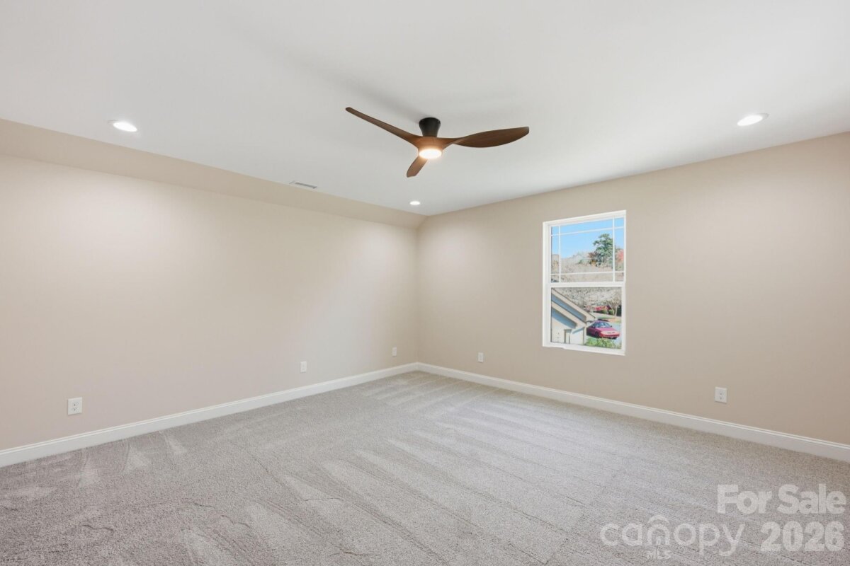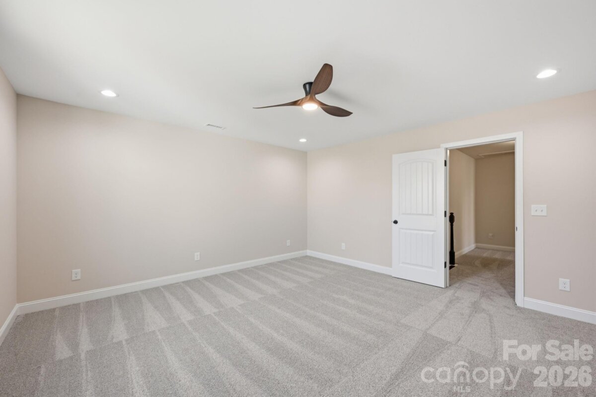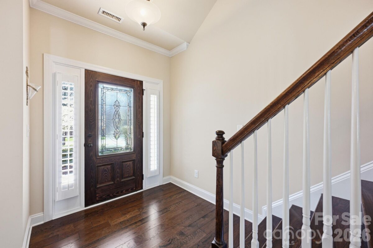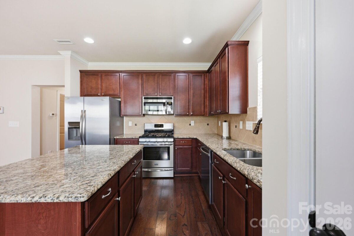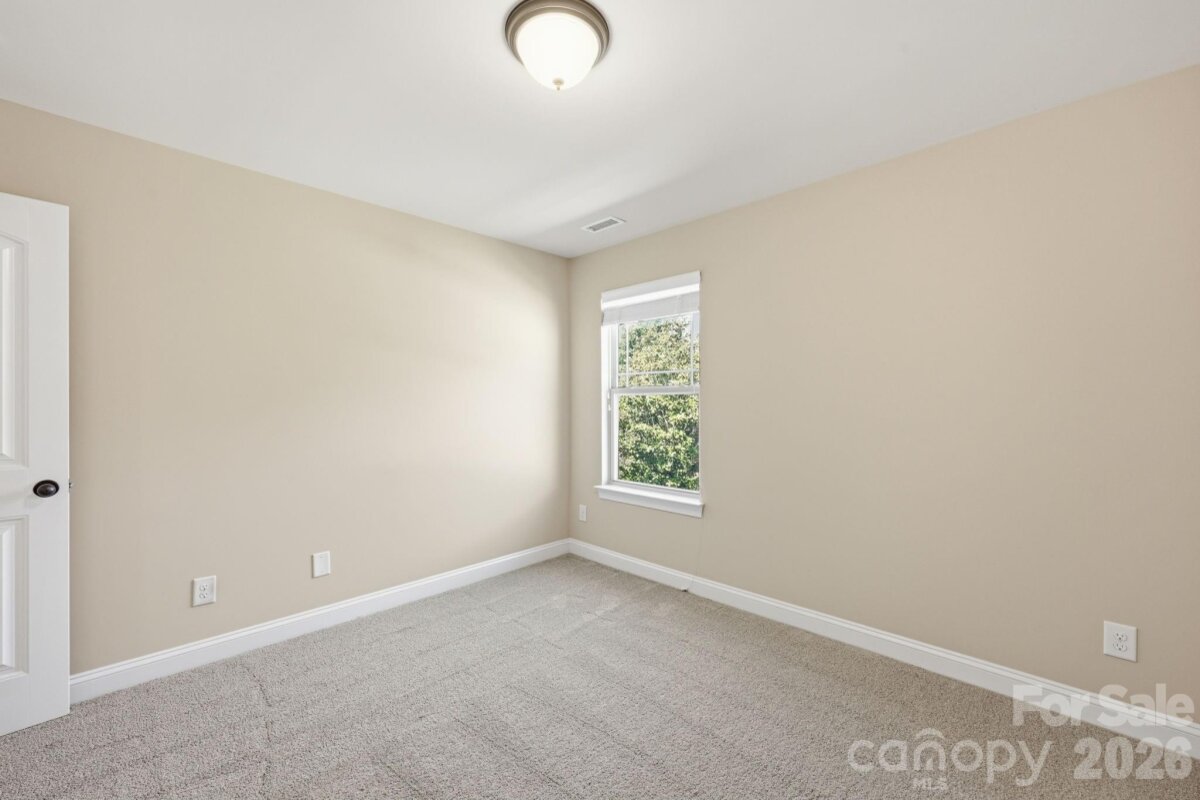 This well-maintained end-unit townhome is ideally positioned on a premium lot, backing to a beautiful park-like common area with a spacious side yard and located directly across from green space with walking trails. Move-in ready, this home features wood flooring, tile in the baths, and neutral carpet in excellent condition. The open-concept layout offers seamless flow from the foyer into the dining area, living room with gas log fireplace, and a well-appointed kitchen with space for a breakfast nook. Beautiful upgrades including plantation blinds throughout the main level. The kitchen is thoughtfully designed with granite countertops, a center island with breakfast bar, pantry with slide-out shelving, double stainless sink with sprayer and disposal, and stainless appliances including a Samsung dishwasher, Frigidaire gas range, and GE built-in microwave with exhaust. The main-level primary suite provides both comfort and convenience, featuring a walk-in closet with a custom organization system and an ensuite bath with tiled shower, linen storage, and a separate vanity area. Additional main-level highlights include a powder room, laundry room with garage access, and a built-in computer niche with adjacent storage closet. Upstairs offers flexible living space with a loft, two generously sized bedrooms, a full bath, and a large bonus room ideal for a media room, office, or guest retreat. Outdoor living is equally inviting with a rocking-chair front porch (with video doorbell) overlooking a wooded view and a private rear paver patio, complete with privacy fencing. Community amenities include a clubhouse with meeting space and fitness room, along with lawn care and exterior maintenance for easy, low-maintenance living. Tucked within a quiet community yet conveniently located with easy access to I-77, shopping, dining, and more, this home offers an exceptional combination of location, layout, and lifestyle, Come live the good life in Emerald Green Village!