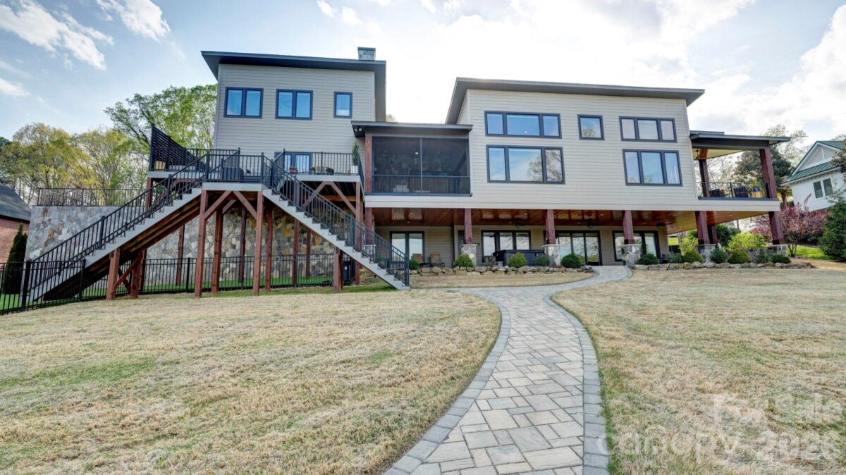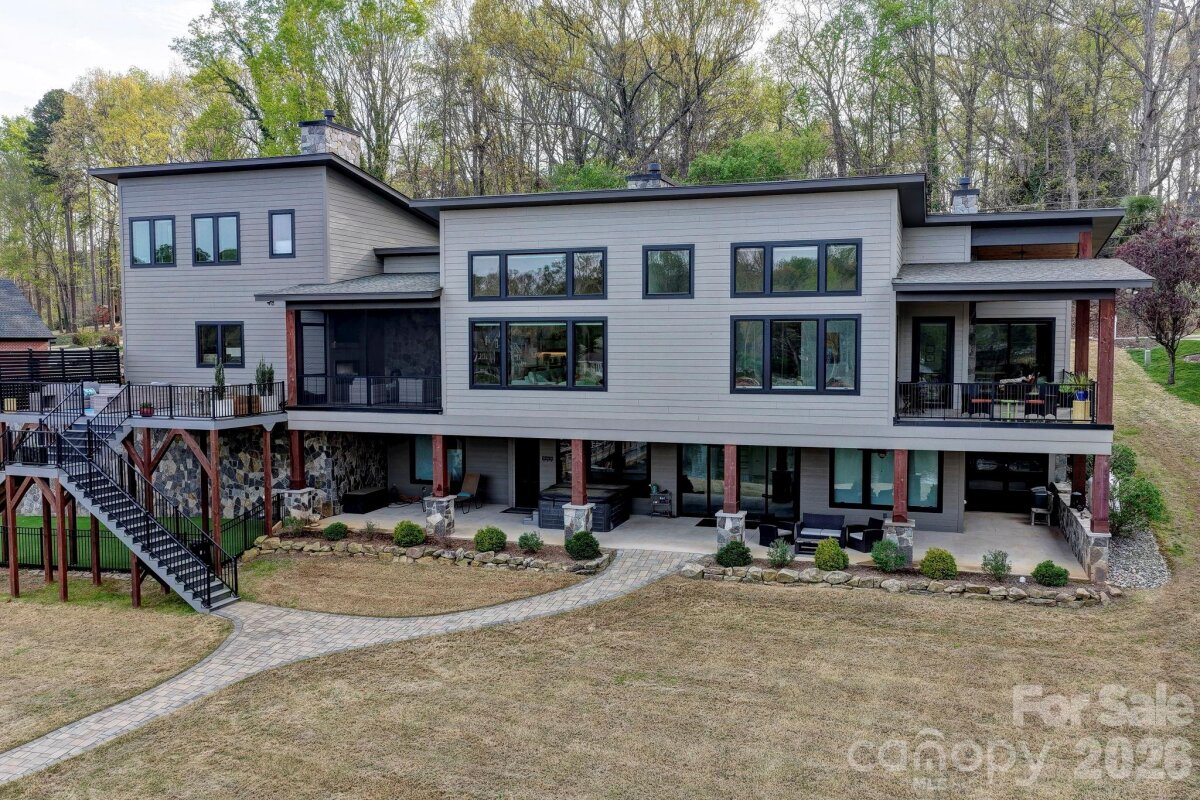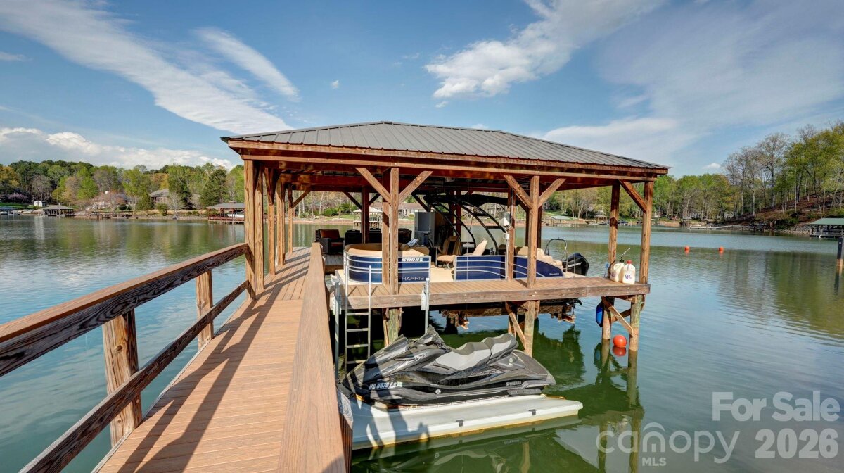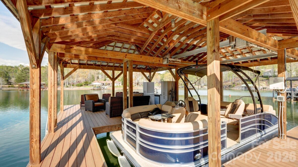 Experience luxury lake living in this custom Modern Craftsman home built in 2021, perfectly situated on a large lot in Mooresville with no HOA. Thoughtfully designed with exceptional craftsmanship and one-of-a-kind details, this home offers a truly elevated lifestyle. At the heart of the home is a grand chef’s kitchen featuring custom cabinetry and stunning black walnut accents milled directly from a tree on the property, showcased in the trim, floating shelves, range hood, and island. The adjoining family room continues the theme with custom walnut built-ins, creating a warm yet refined gathering space. Designed for flexibility and comfort, the home offers side by side, dual primary suites, each complete with a private bathroom, walk-in closet, and dedicated office area—ideal for multi-generational living or ultimate guest accommodations. The main primary suite also features a private covered and screened porch for a peaceful retreat. This home is an entertainer’s dream, highlighted by expansive sliding doors and a custom pass-through kitchen window that seamlessly connect indoor and outdoor living to a large screened porch with fireplace and an oversized deck. The walk-out basement is equally impressive, featuring two additional bedrooms with custom built-in bunk beds and private baths, a spacious living area, exercise room, and a must see, custom wine cellar. Step outside to enjoy the beautifully designed exterior, including a huge covered patio, custom fire-pit, and a fenced in, turf dog run. Just off the lower patio, you’ll find a large storage area perfect for all your lake gear and outdoor essentials. Waterfront living is complete with a newly built 1,000 sq ft covered dock and 7,000 lb boat lift, making this property ideal for enjoying Lake Norman to the fullest. With abundant storage, custom built-ins throughout, and unmatched attention to detail, this home is a rare opportunity in one of Mooresville’s most desirable locations.