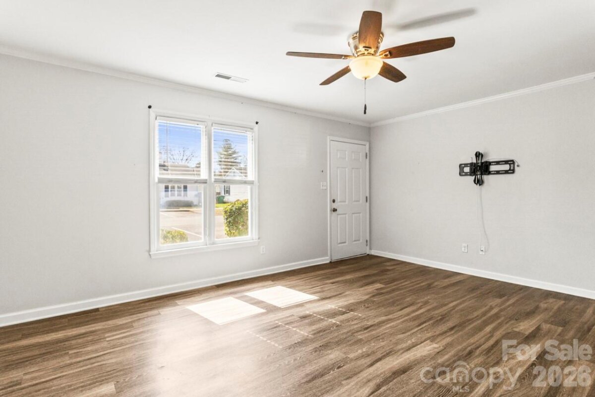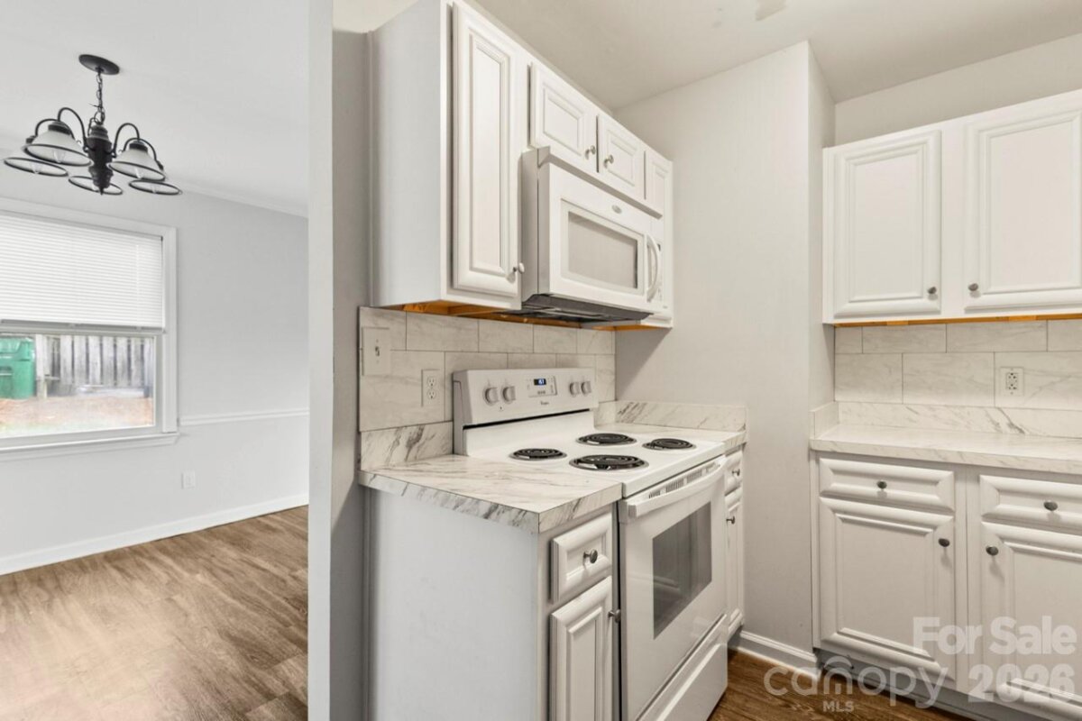 Rare opportunity to own a single-story townhome in a rapidly growing Charlotte location, offering the ease of one-level living with added privacy rarely found in attached homes. Built in 1989 and thoughtfully updated approximately seven years ago, this residence blends low-maintenance living with modern touches. The interior renovation included durable wood-look laminate flooring throughout the main living areas, with tile flooring in the bedrooms, creating a completely carpet-free home that is both stylish and practical. The kitchen was updated with raised-panel white cabinetry, tile backsplash, and white appliances, providing a bright and functional space for everyday living. The primary bedroom features a centrally located vanity area, while the adjoining bath offers a garden tub and shower combination, creating a comfortable retreat. The second bedroom sits conveniently adjacent to the second full bath, making the layout ideal for guests, roommates, or a home office. Outdoor living is enhanced by a private patio area with additional privacy compared to many units, along with a dedicated exterior storage room for added convenience. The surrounding community features a unique mix of single-family homes and townhomes, creating a neighborhood feel that stands apart from more densely developed townhome communities. Located in one of Charlotte’s high-growth corridors, this home benefits from continued development, expanding amenities, and convenient access to shopping, dining, and major commuter routes, making it an excellent opportunity for homeowners or investors seeking value in a thriving area.