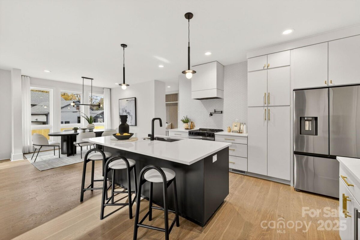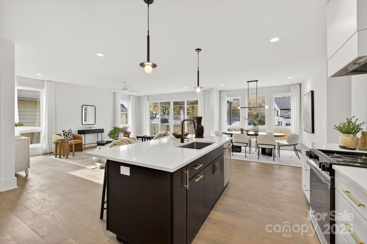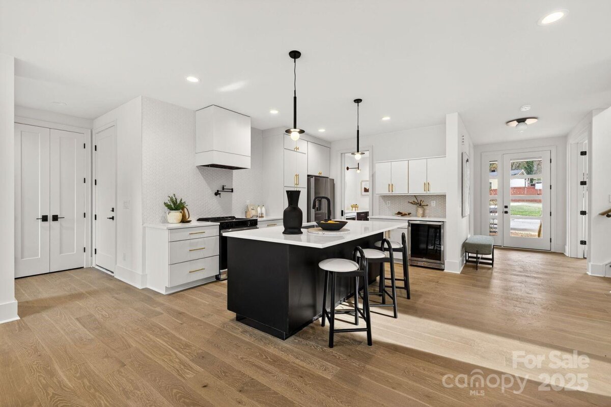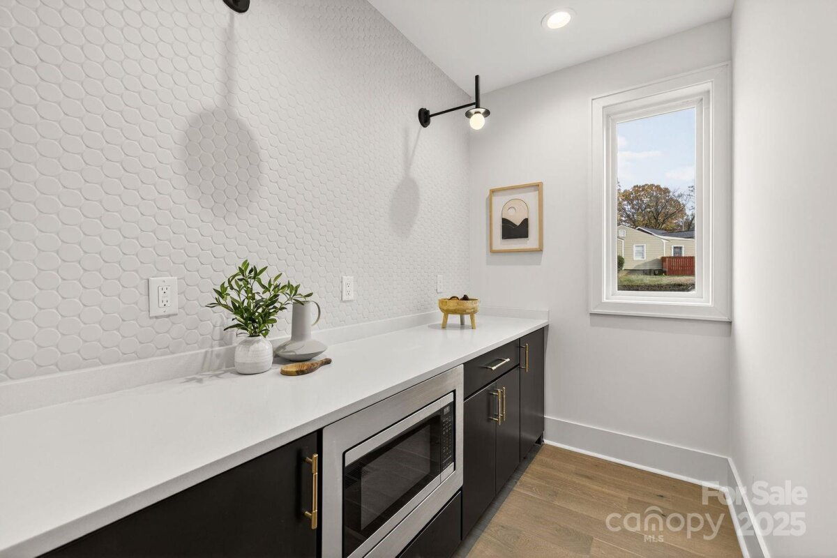 Experience modern living at its finest in this meticulously designed new construction home, nestled in the highly sought-after Smallwood neighborhood. With its prime location just minutes from uptown, I-77, South End, and the airport, you'll enjoy unparalleled convenience and accessibility. As you step inside, you'll be captivated by the meticulous attention to detail and contemporary elegance throughout the home. The stunning kitchen is a chef's dream, featuring soft-close flat panel cabinets, white quartz countertops, a custom tile backsplash, a convenient pot filler, and stainless steel appliances, including a gas range and beverage fridge. The butler's pantry adds a touch of sophistication with additional storage, floating shelves, and a built-in microwave—perfect for entertaining. The open floor plan downstairs creates a seamless flow for gatherings, while a separate office space with vaulted ceilings offers a serene escape for productivity. Plus, the thoughtfully designed drop zone area comes equipped with custom built-ins for your convenience. Go upstairs to the primary suite, where you'll be greeted by soaring vaulted ceilings and an abundance of natural light. The primary bathroom is like a spa, featuring a double vanity, a freestanding tub, a private toilet closet, and an oversized shower. A generous walk-in closet, complete with custom built-ins, ensures your space remains organized and stylish. The laundry room is as functional as it is beautiful, boasting cabinetry, quartz countertops, and a sink. This property also includes a two-car garage with extra storage or workspace, a covered back porch for relaxation, and a spacious fenced-in yard—making it the ideal home for modern living. Don't miss your chance to own this exquisite home that perfectly blends style, comfort, and convenience!