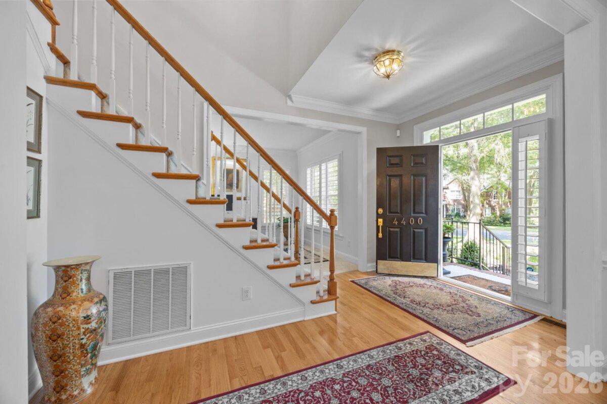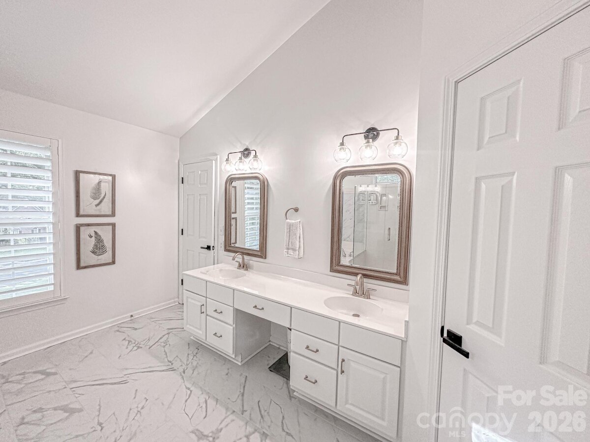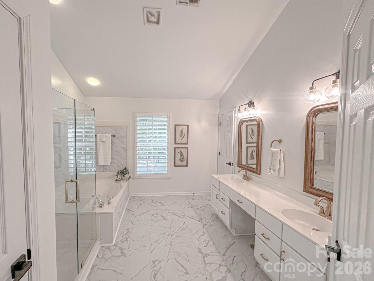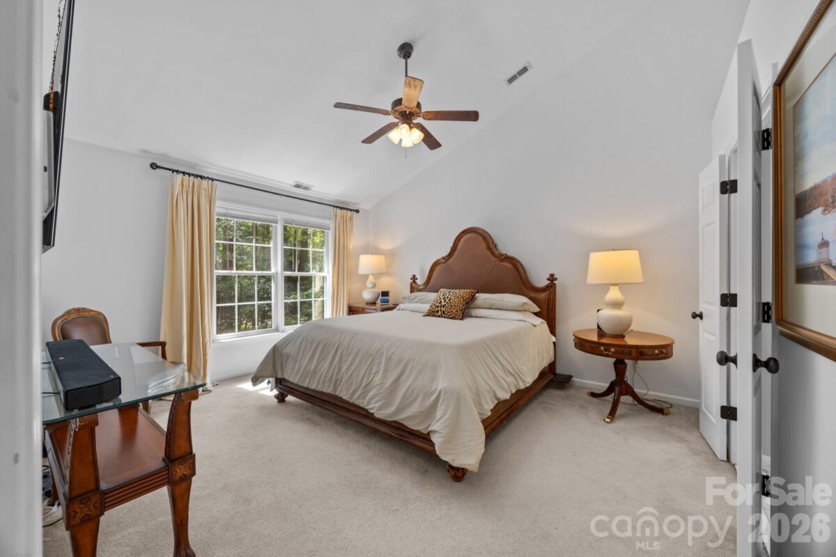 WELCOME HOME to OVERLOOK! This exquisite 4 bedroom 2.5 bath home sits on an exceptional private corner lot surrounded by trees! A 5 minute walk to the abundant community amenities including a pool, clubhouse & tennis/pickleball courts; your bright and airy freshly painted home awaits! Completely renovated front landscaping including in-ground irrigation greets you as you approach the front door. Upon entering, you will be struck by the light filled space with new plantation shutters on the entire main floor windows. The white kitchen has all new appliances, new back splash and new lighting. The 2-story great room is a wonderful gathering place open to the kitchen with a fireplace. You will also find a spacious office/ flex space, living room and dining room on the main level. A split floor plan upstairs provides privacy for the large primary suite with vaulted ceilings, new closet system, and updated primary bath with new tile, updated lighting and mirrors, and new frameless shower surround. The other 3 bedrooms and full bath center around a bonus room and can be closed off for additional privacy and quiet. Spacious walk-in attic storage adds to the ample storage throughout the home. Enjoy relaxing on your deck in your private, flat back yard in the shade of mature trees! All this within minutes of uptown Charlotte!