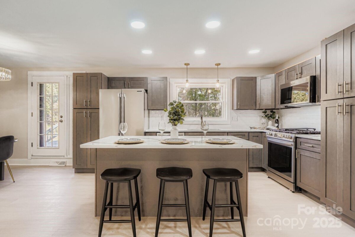 Beautifully renovated mid-century split-level on 1.92 acres with no HOA! This stunning home blends timeless charm with modern updates, offering the perfect balance of style, comfort, and functionality. The open-concept main level features a bright living room, spacious dining area, and a gourmet kitchen with quartz countertops, sleek cabinetry, a large island, and high-end finishes, ideal for everyday living or entertaining guests. Each room has been thoughtfully updated with fresh, modern touches while preserving the home’s classic character. Elegant ceramic and marble bathrooms exude sophistication, and large windows fill the interior with natural light, creating a warm and inviting atmosphere. The lower level provides a generous family room, perfect for movie nights, gatherings, or relaxing with loved ones. Every detail has been carefully considered to enhance comfort and livability. The expansive lot offers peace, privacy, and endless possibilities, ideal for outdoor recreation, gardening, or simply enjoying the serene natural surroundings. Located in the desirable Queen City area, this home combines the tranquility of a private retreat with the convenience of nearby shopping, dining, and major routes. Whether you crave room to expand, a haven to host, or a retreat to recharge, this home redefines versatility and modern elegance, a showcase of endless potential and timeless allure, where every detail is worth more than beautiful.