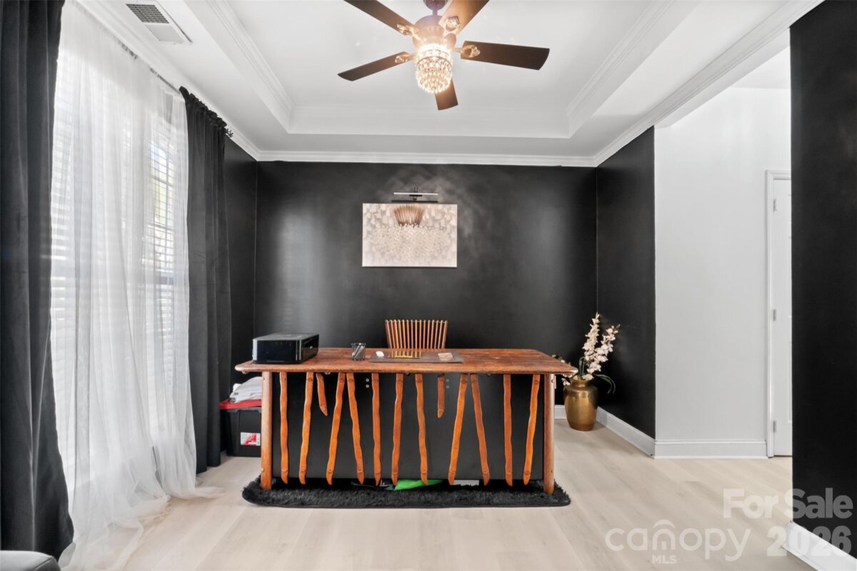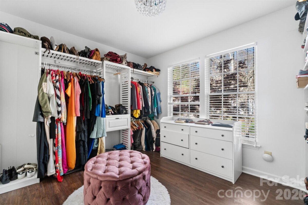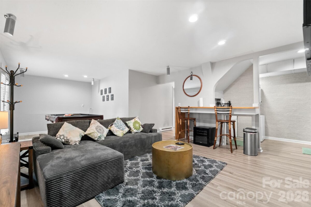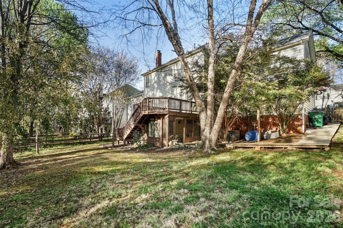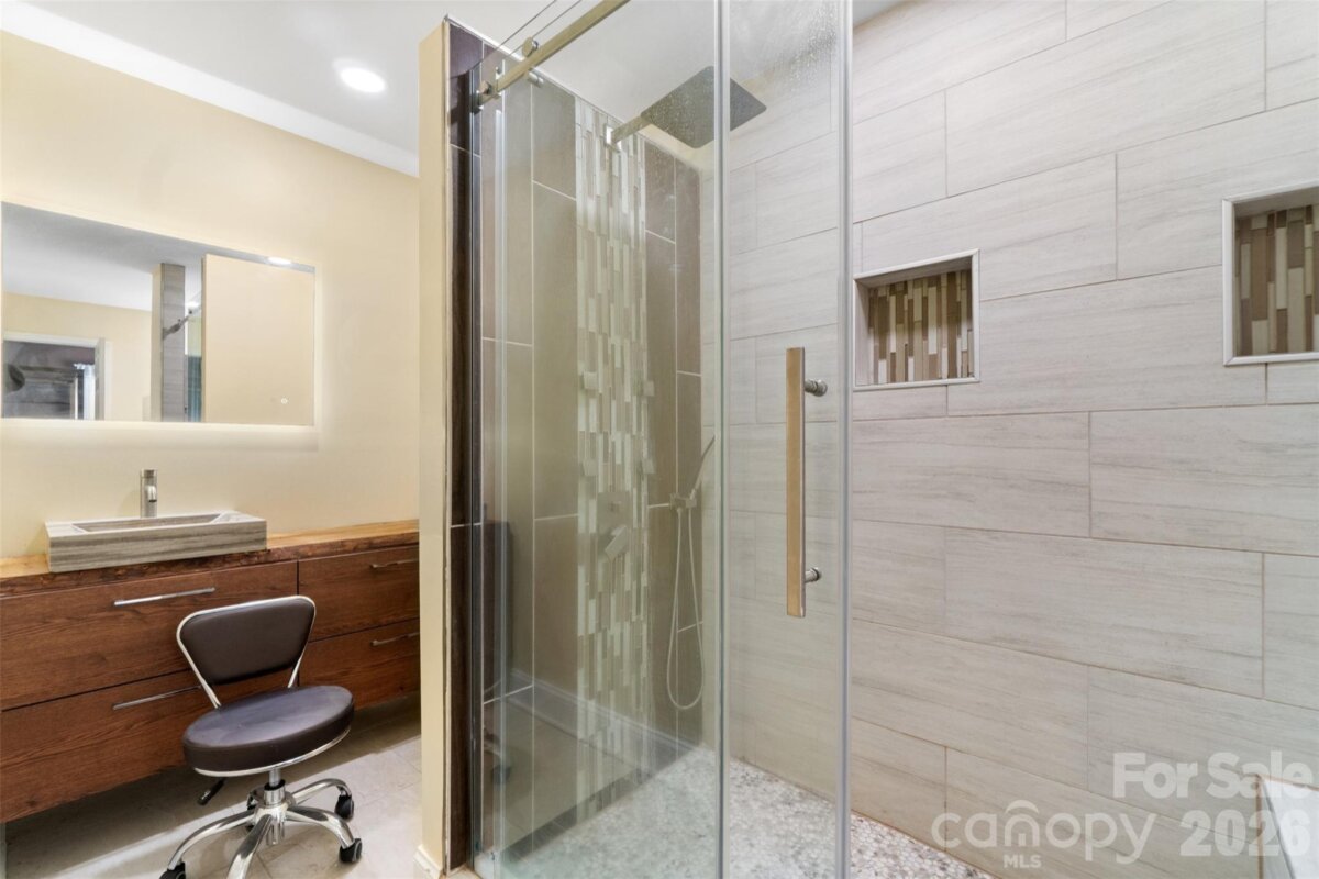 Two homes in one! This fully renovated 5-bedroom, 3.5-bath home features a 4-bedroom, 2.5-bath main residence plus a separate one-bedroom, one-bath apartment on the lower level — complete with its own private walk-in entrance, full kitchen, pantry, separate in-unit laundry and beautifully renovated full bath. The spacious open living area with stone accent wall and electric fireplace offers flexible space for dining, lounging or entertaining, with an additional bonus room for a home office, gym or storage. Whether it’s extended family, guests or rental income, the flexibility here is rare. Upstairs, the main home delivers luxury at every turn. A dramatic two-story foyer with marble-look flooring and statement crystal chandelier sets the tone. The chef’s kitchen features a large center island, professional Jenn-Air range, custom built-in wall unit with open shelving, designer crystal chandelier and French doors to the deck. The main level also includes a formal dining room with wainscoting, a private office with tray ceiling and a show-stopping powder bath with designer damask wallpaper and emerald, green wainscoting. The primary suite offers a tray ceiling, spa-inspired bath with freestanding soaking tub, floor-mount filler, oversized walk-in shower with dual niches and bench, and dual LED backlit vanities. An adjacent bedroom has been converted into a luxurious walk-in closet and dressing room but can easily be converted back to a fifth bedroom. Outside, the home backs to a natural hillside with no rear neighbors. Enjoy the screened porch and large deck overlooking your own private wooded retreat. Located on a quiet loop street with no through traffic in Highland Creek, within walking distance to the Highland Creek Club and neighborhood amenities, this home offers both lifestyle and location in one of Charlotte’s most established golf communities. 2-year home warranty included. This home must be seen in person to be fully appreciated.