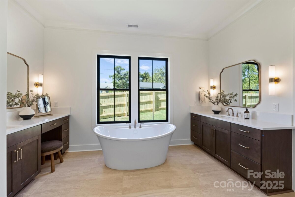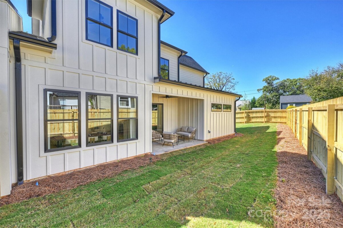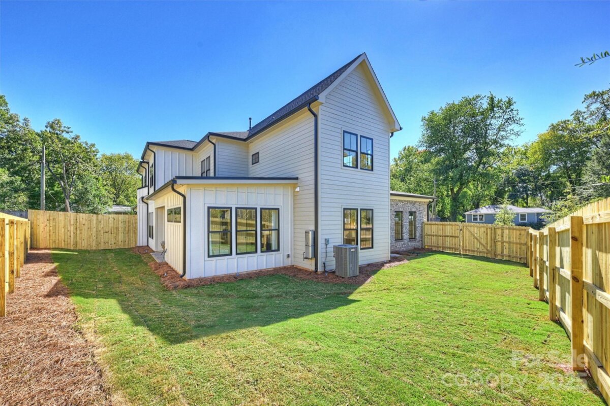 This thoughtfully designed two-story home offers just over 2,850 square feet of refined living space. Newly constructed, this never lived in luxury duet features a soaring 20-foot foyer and 10-foot ceilings throughout that create an open and inviting atmosphere. At the heart of this home, you’ll find a spacious great room that seamlessly connects the living area, dining space, and chef’s kitchen—complete with a large island that seats five, walk-in pantry, dry bar/wine refrigerator combo, and gas range. Timeless cabinetry in shades of black and dark wood stain are complemented by champagne bronze fixtures, while the soft gray cabinets pair with black, blending classic character with modern elegance. The main level owner’s suite feels of a private retreat featuring dual vanities, soaking tub, large glass shower, and custom built-in closet. Additional main floor highlights include a powder bath, functional drop zone, and a two-car garage with windows & exterior access from the fully fenced side & back yards. Covered front and rear porches extend the living space outdoors, perfect for relaxing or entertaining. Upstairs, a generous landing leads to three spacious bedrooms—one serving as a secondary primary suite with six windows and a private en-suite bath. A dedicated laundry room with upper and lower cabinetry, a utility sink, and additional storage ensures convenience, while a flexible office/exercise/catchall space provides room to grow and adapt. Balancing modern luxury with everyday livability, this home delivers an exceptional duet experience designed for those who appreciate style, space, and thoughtful design. Drive to the center of NoDa in 3 minutes, Plaza-Midwood in 7, Elizabeth in 10, and Uptown in 14. Tucked away on a quiet street with cul-de-sac like corner.