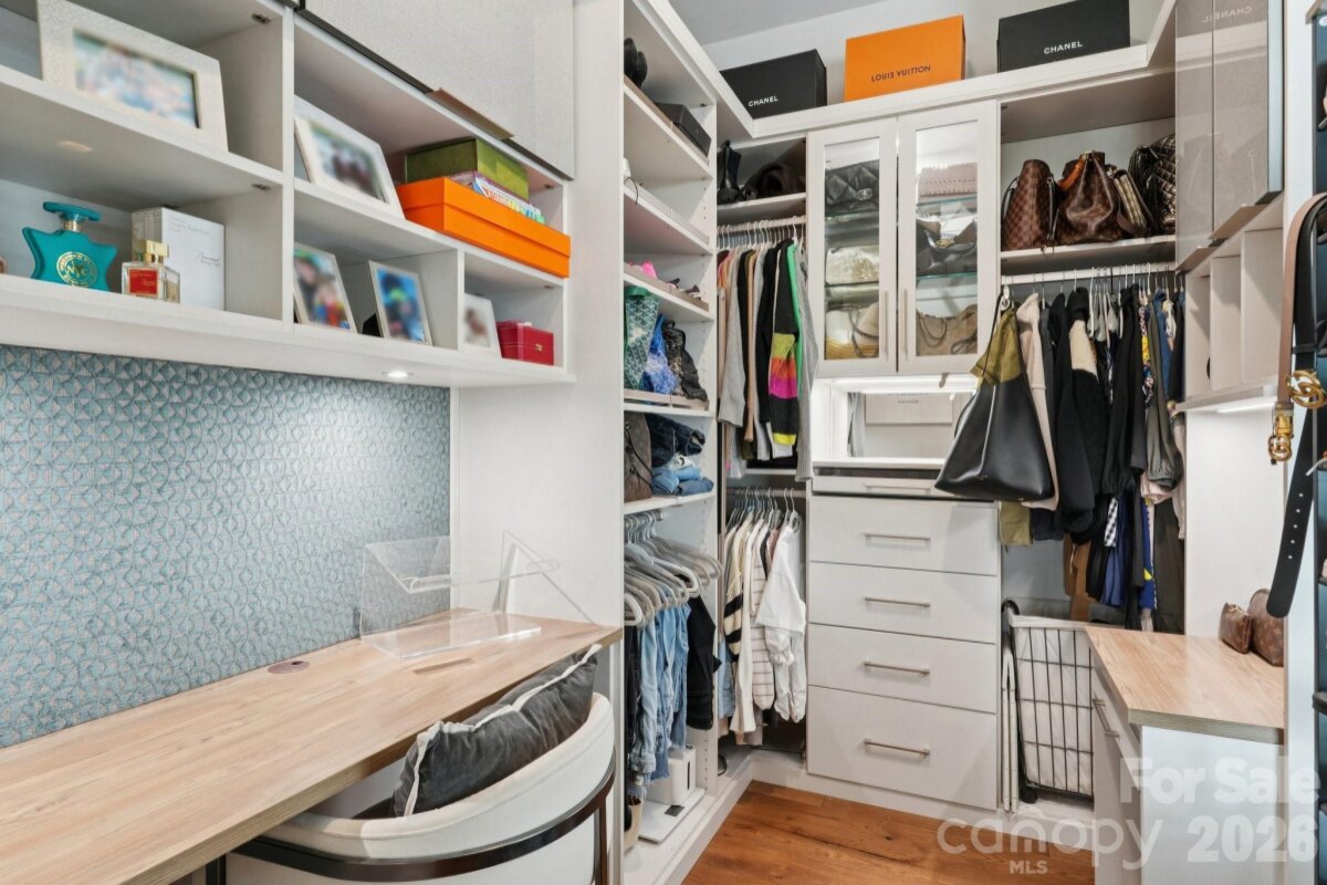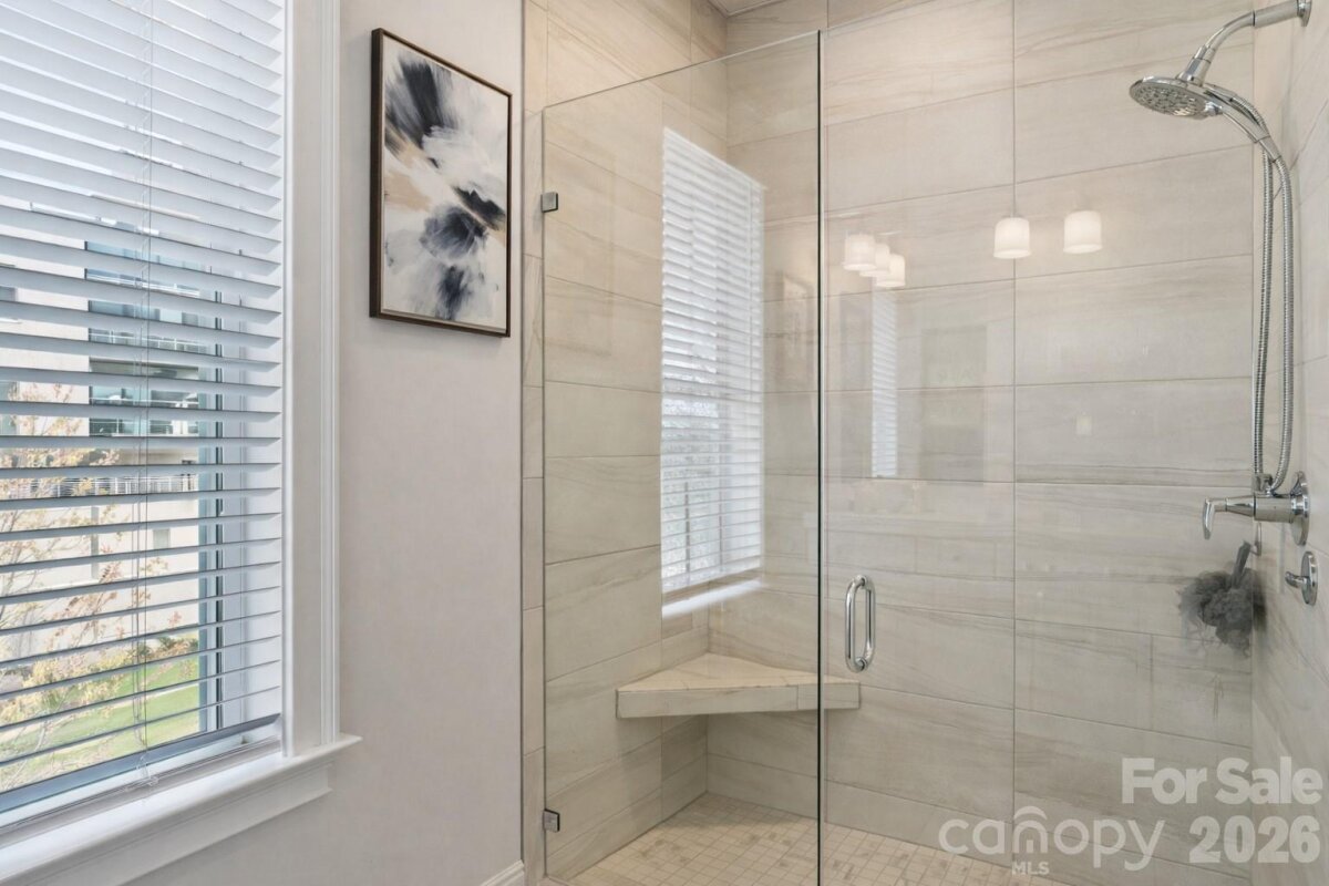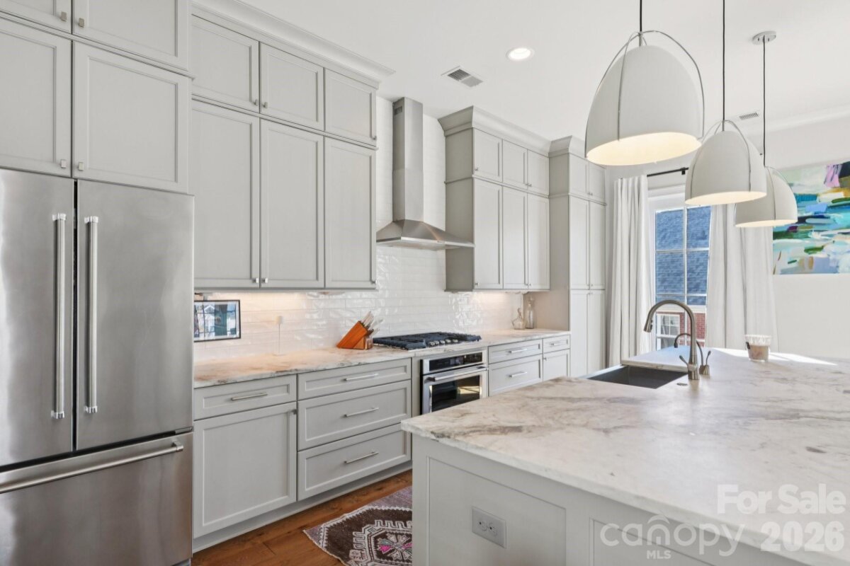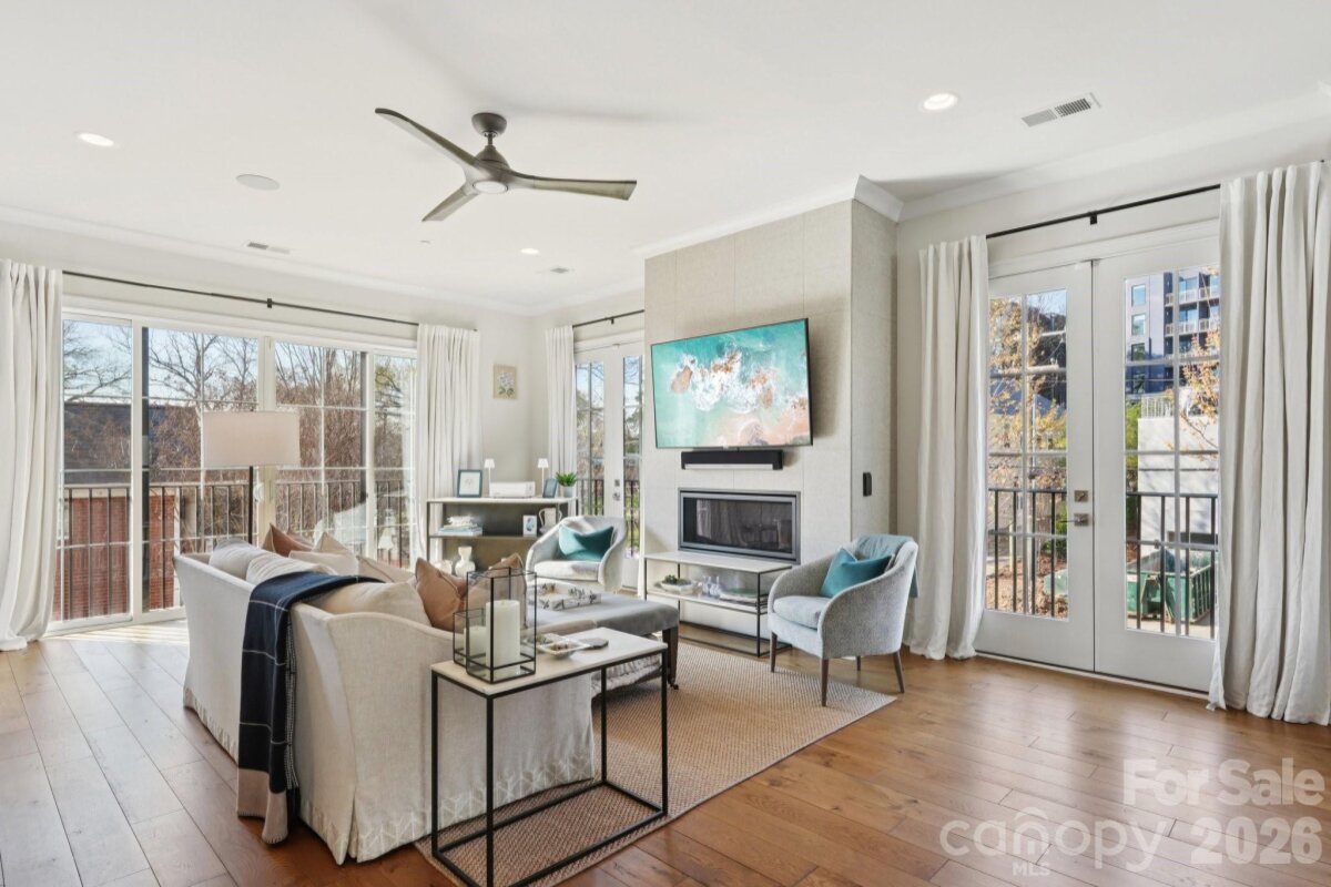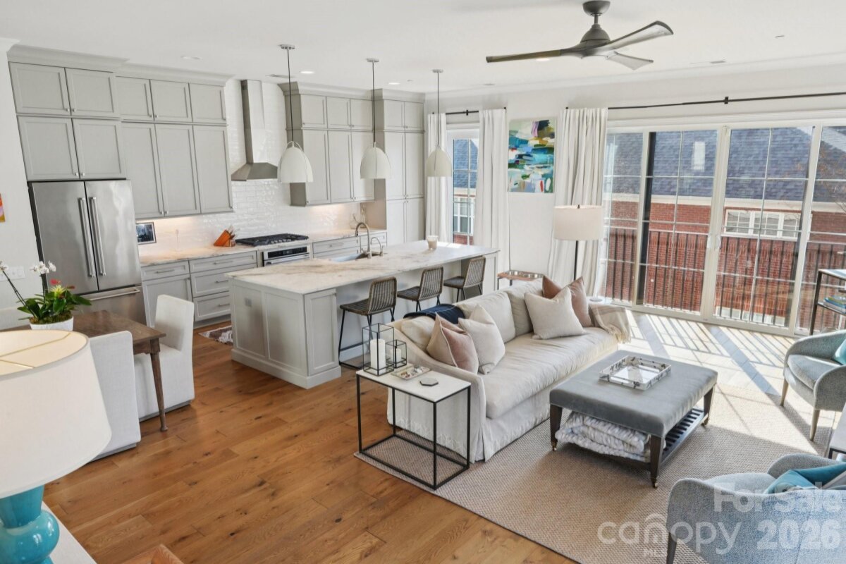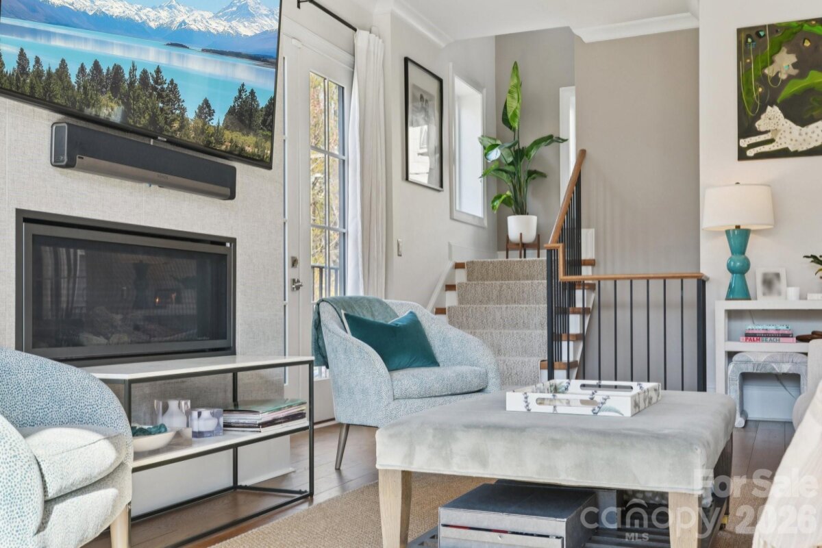 Simonini-built luxury condo in the heart of Dilworth, offering a rare combination of natural light, flexible living, and refined finishes in the intimate Lombardy Terrace community. This corner end-unit is one of two units in the building with windows on three sides, filling every level with natural light and creating a bright, open feel that is rarely found in condo living. The entry level includes a private second primary suite with a full bath and a large walk-in California Closet with a built-in office, along with access to the one-car garage and a separate temperature-controlled storage unit. This level offers ideal flexibility for guests, working from home, or multi-generational living. The second level serves as the main living space, featuring hardwood floors throughout, a sleek ribbon fireplace, and an open-concept kitchen with marble countertops, ceiling-height cabinetry, and premium KitchenAid appliances. The kitchen, dining, and living areas flow seamlessly to a covered terrace, creating an easy indoor-outdoor connection. The upper level includes the primary suite with a spa-inspired bath, zero-entry shower, and custom walk-in closet, along with a third bedroom with its own en-suite bath. Thoughtful upgrades throughout include hardwood floors on every level, an enhanced lighting package with additional designer fixtures, built-in speakers, Nest thermostats, solid core doors, and added sound insulation for a quiet, private living experience. The home also includes a private one-car garage with additional street parking, a notable convenience in this highly walkable Dilworth location. A rare HOA that includes interior insurance further enhances the home’s low-maintenance appeal. Located just steps from Freedom Park, the Greenway, East Boulevard dining, and South End, this home offers a truly walkable Dilworth lifestyle with the space and flexibility to live comfortably every day.
