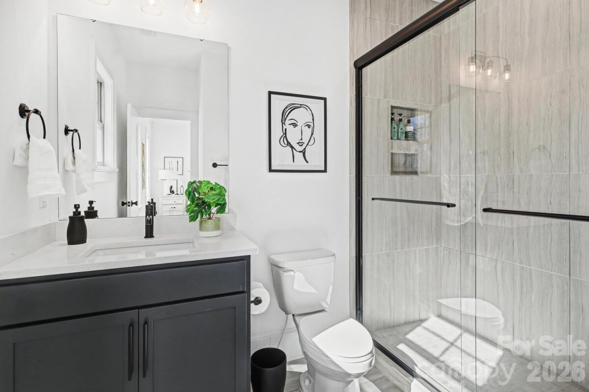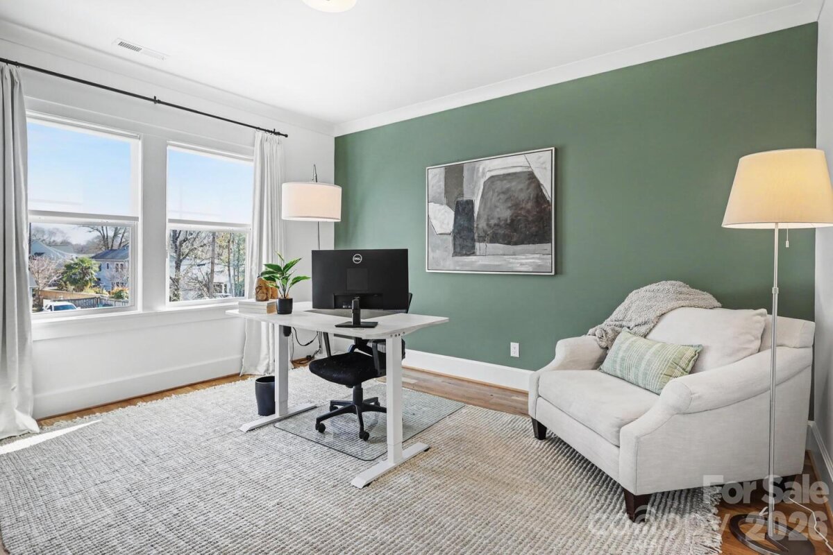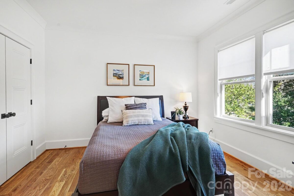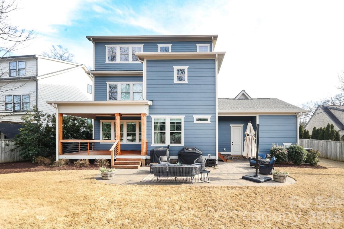 Perfectly situated in the heart of Charlotte, just minutes from Dilworth, South End, SouthPark, Uptown, and Freedom Park. Enjoy front porch living on a quiet street in the heart of Sedgefield, one of Charlotte’s most desirable neighborhoods. Built in 2022, this beautifully maintained home feels like new construction. Inside, a bright French door study and a formal dining room welcome you, flowing seamlessly into the open great room and a well-appointed kitchen with a butler pantry/workstation. Perfect for entertaining or everyday living. Hardwood floors extend throughout the entire home, and the spacious primary suite offers a luxurious retreat with a soaking tub, larger than life shower, and a large walk-in closet. The third floor features a 985 sq. ft. bonus room for recreation, work, or play. Step outside on to the back covered porch to an over-sized flat .46 acre fenced yard with irrigation in place, ready for outdoor living, gardening, or gathering with friends and family. This home also features an EV charger in the garage and a long extra-wide driveway.