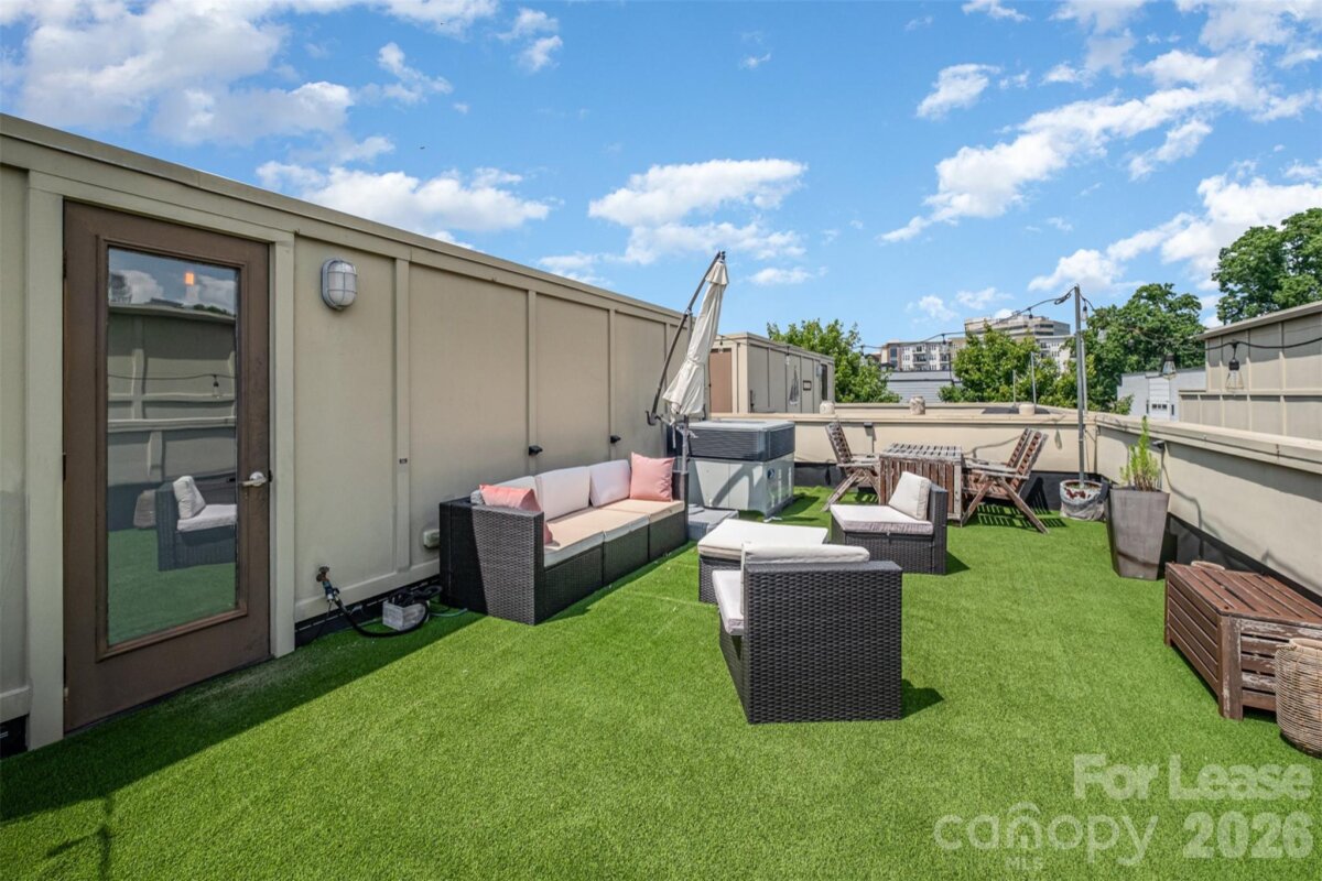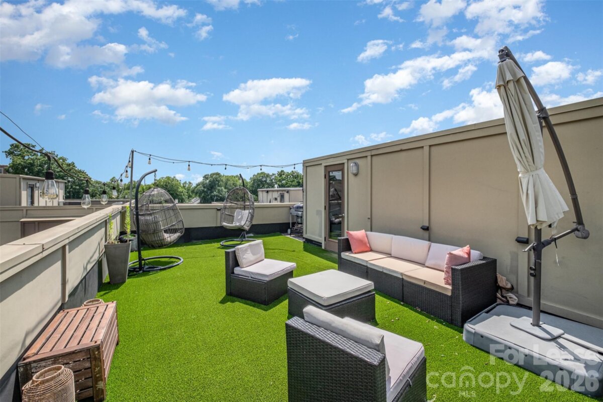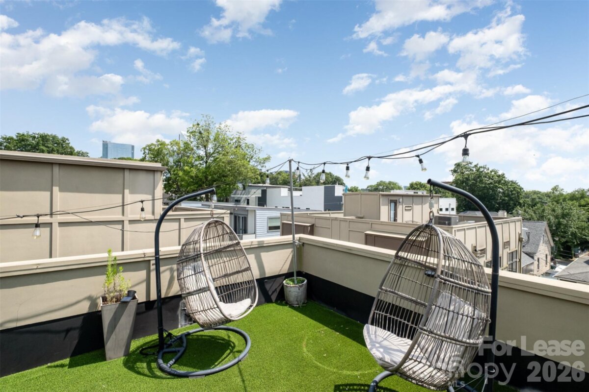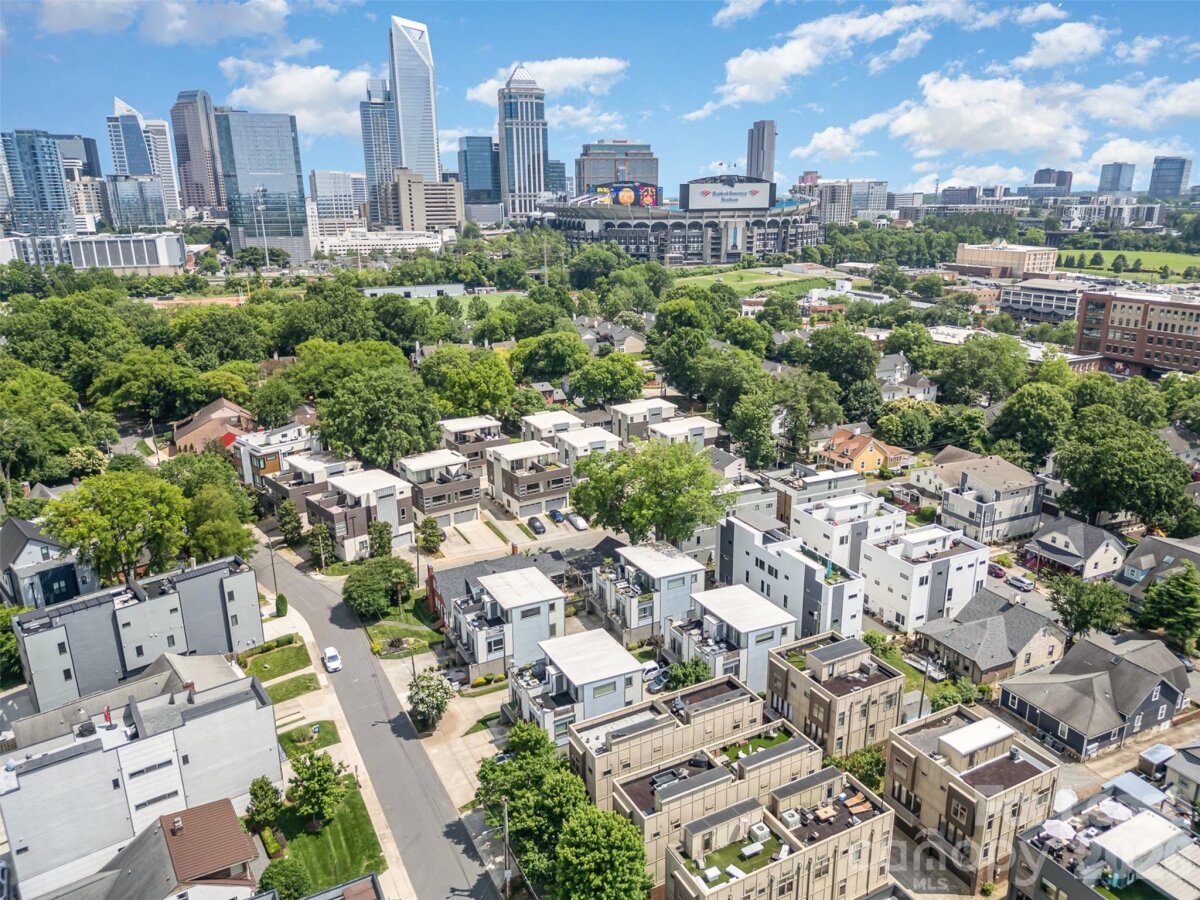 Live in the heart of Uptown Charlotte’s highly sought-after 3rd Ward in this modern, end-unit condo that perfectly blends neighborhood charm with city convenience. Tucked along tree-lined streets yet just steps from Bank of America Stadium, South End, Frazier Park, and all that Uptown has to offer, this home delivers the best of both worlds—walkability, energy, and a true residential feel. This sleek, thoughtfully designed home features a private rooftop terrace with stunning skyline views.Your own urban oasis ideal for entertaining or unwinding above the city. The entry level offers a versatile flex space, perfect for a home office, guest room, or gym, with direct access to a private 2-car garage and driveway. The second floor showcases a bright, open-concept layout with a spacious living and dining area, highlighted by two sets of French doors that lead to a private balcony. The modern kitchen is equipped with stainless steel appliances, a gas range, and stylish architectural cable railing accents. Upstairs, the third level features two generously sized bedroom suites, each with its own full bathroom and walk-in closet, providing comfort and privacy for residents or guests. With its prime location, functional layout, and elevated finishes, this home offers an unbeatable Uptown lifestyle.