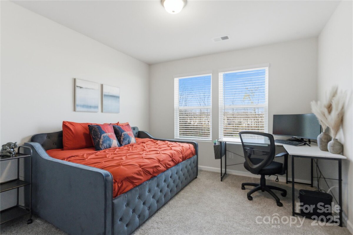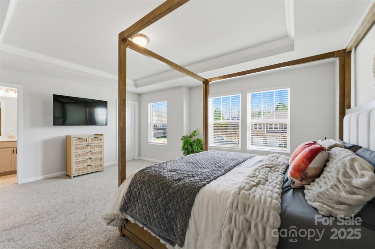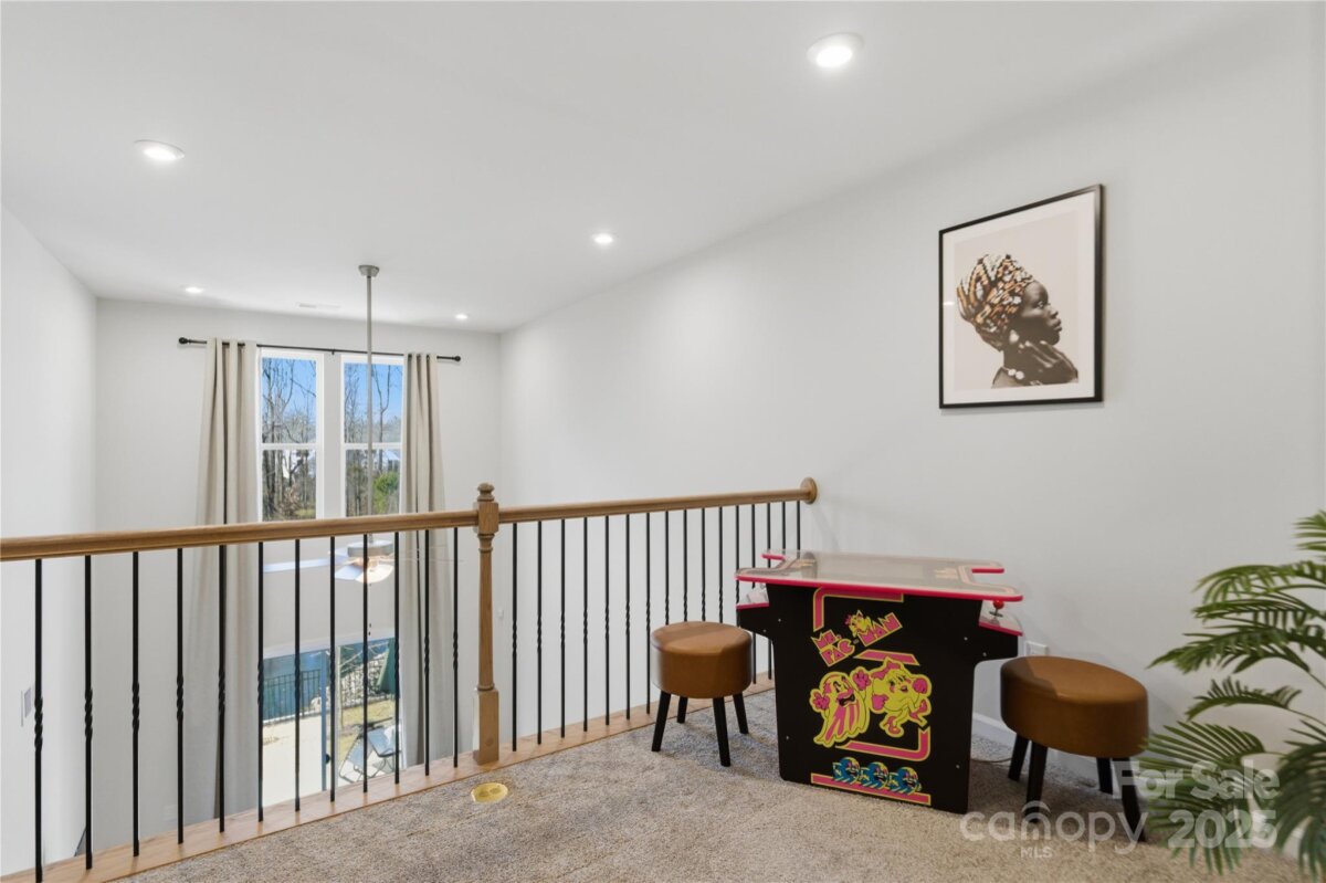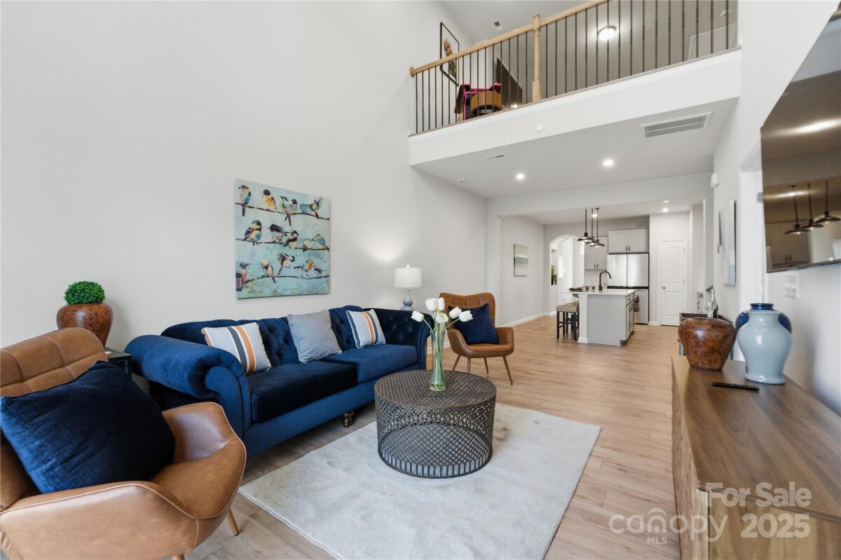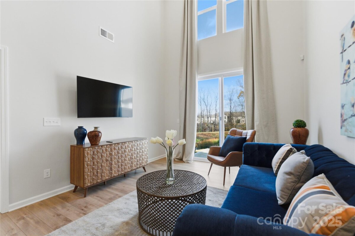 A rare opportunity offering two primary bedrooms, including one conveniently located on the main level. This thoughtfully designed two-story townhome is minutes from Concord Mills and Mallard Creek shopping. The chef’s kitchen features fairy white quartz countertops, island with a breakfast bar, white herringbone mosaic tile backsplash, and light wood-toned luxury vinyl plank flooring. The laundry room is also situated on the main level for added convenience. The heart of the residence is a soaring two-story great room that opens through a sliding glass door to a private patio with tranquil pond views. Upstairs, an oversized loft with a fireplace creates a secondary living space. The upper-level primary suite includes two walk-in closets and a spacious en-suite bath, while the third bedroom is adjacent to another full bath. With exterior and yard maintenance included, this home is ideal for those seeking a low-maintenance, lock-and-go lifestyle. It offers functional luxury in a desirable location, blending comfort with elevated design.